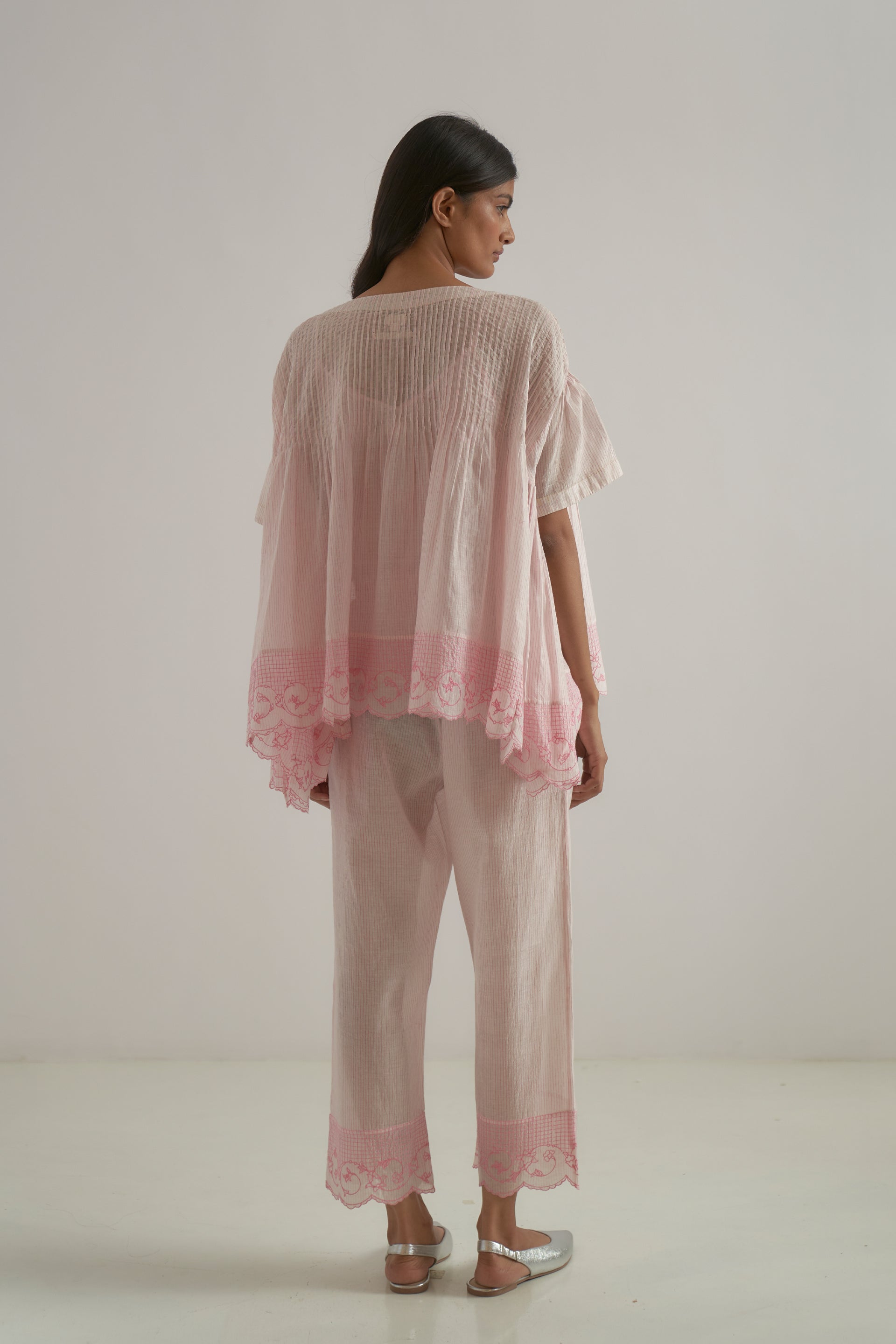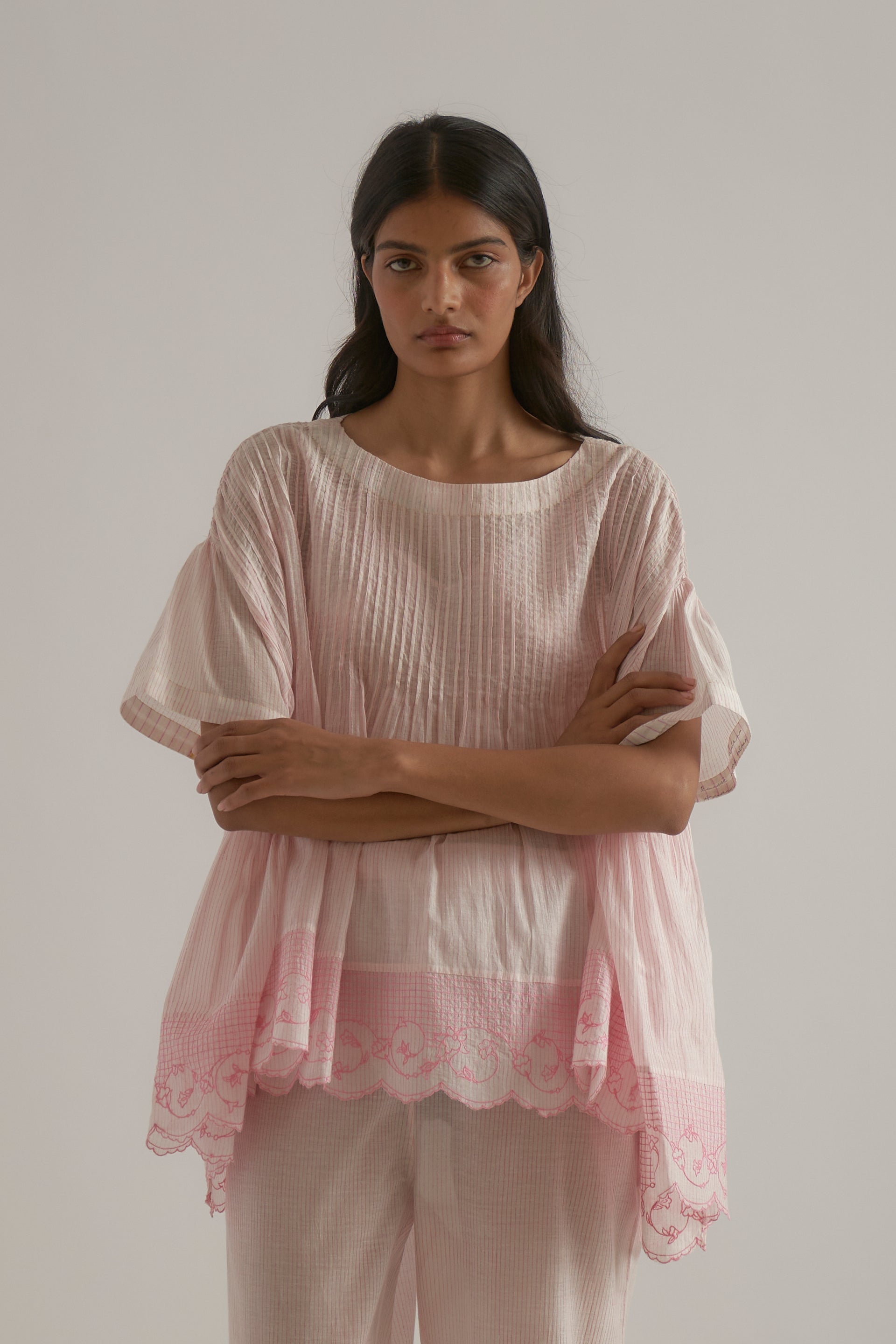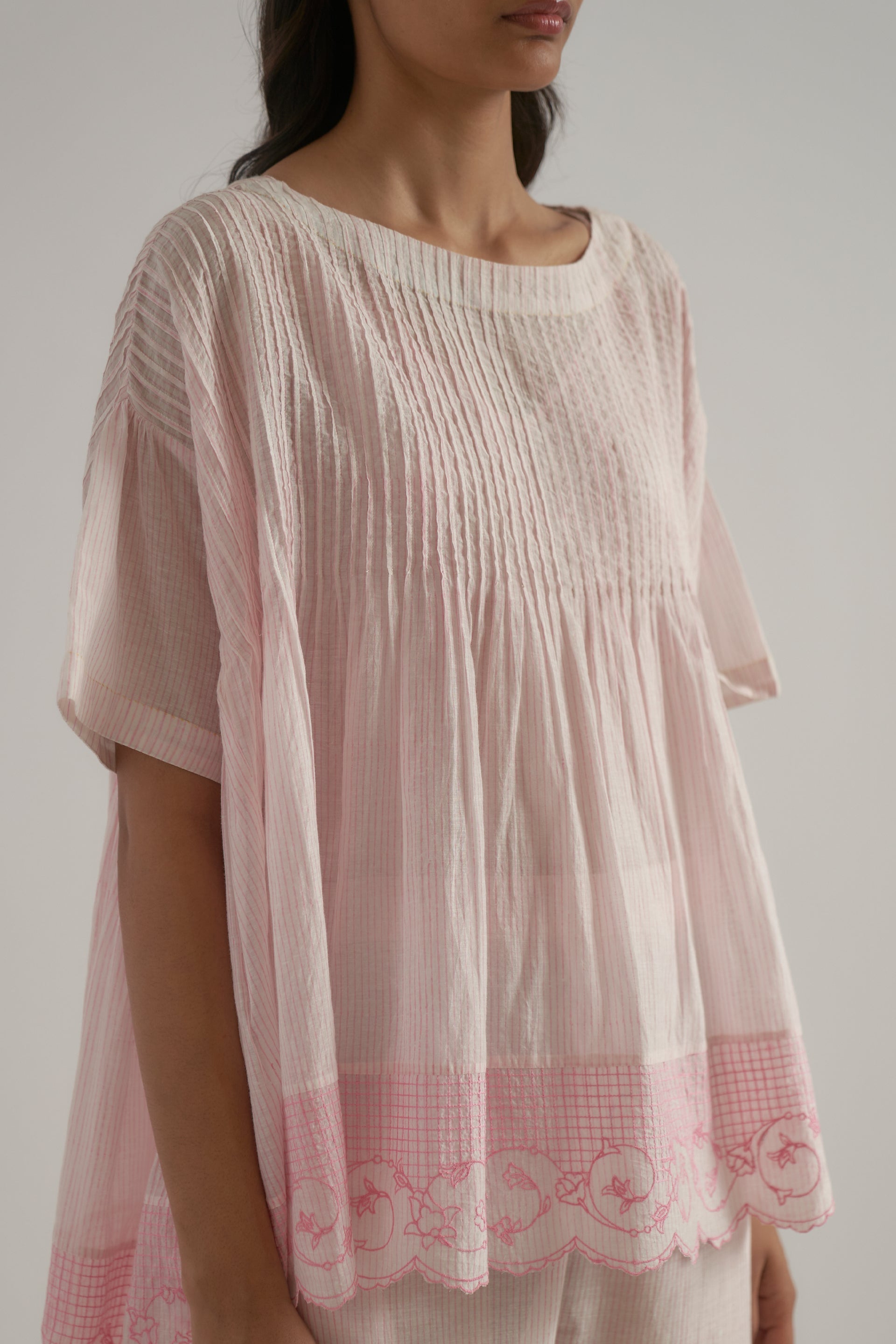 Oversized round-neck top featuring a unique patchwork design with pintucks and side gathers. Crafted from cotton-silk blend, it showcases a pin-striped hand-block print with an embroidered floral border. It also comes with a separate lining.
