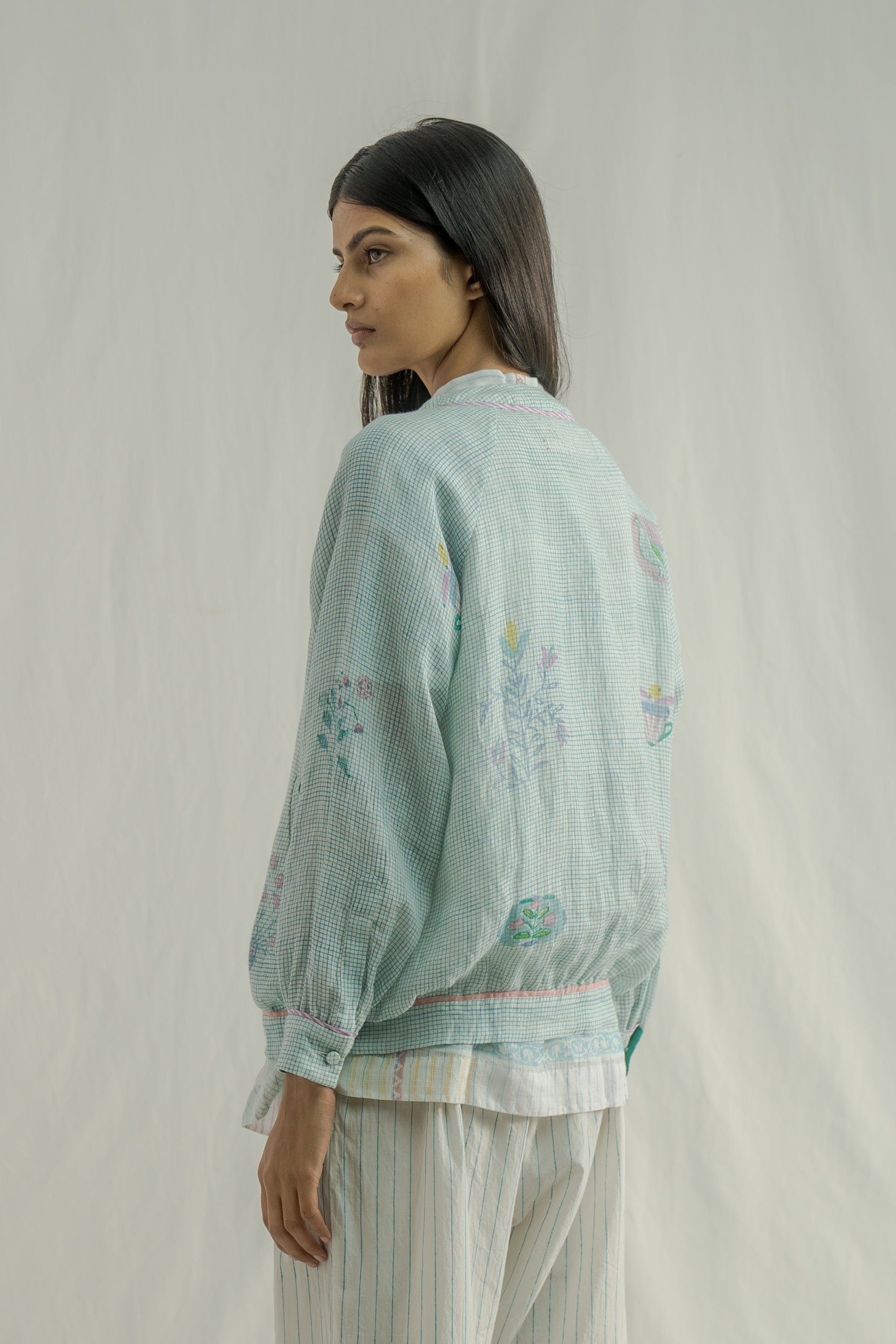 Short bomber front-open button-down jacket with a v-neckline and contrast selvedge detail. crafted from fine checks and multicolor placement handblock print, made with 100% linen fabric