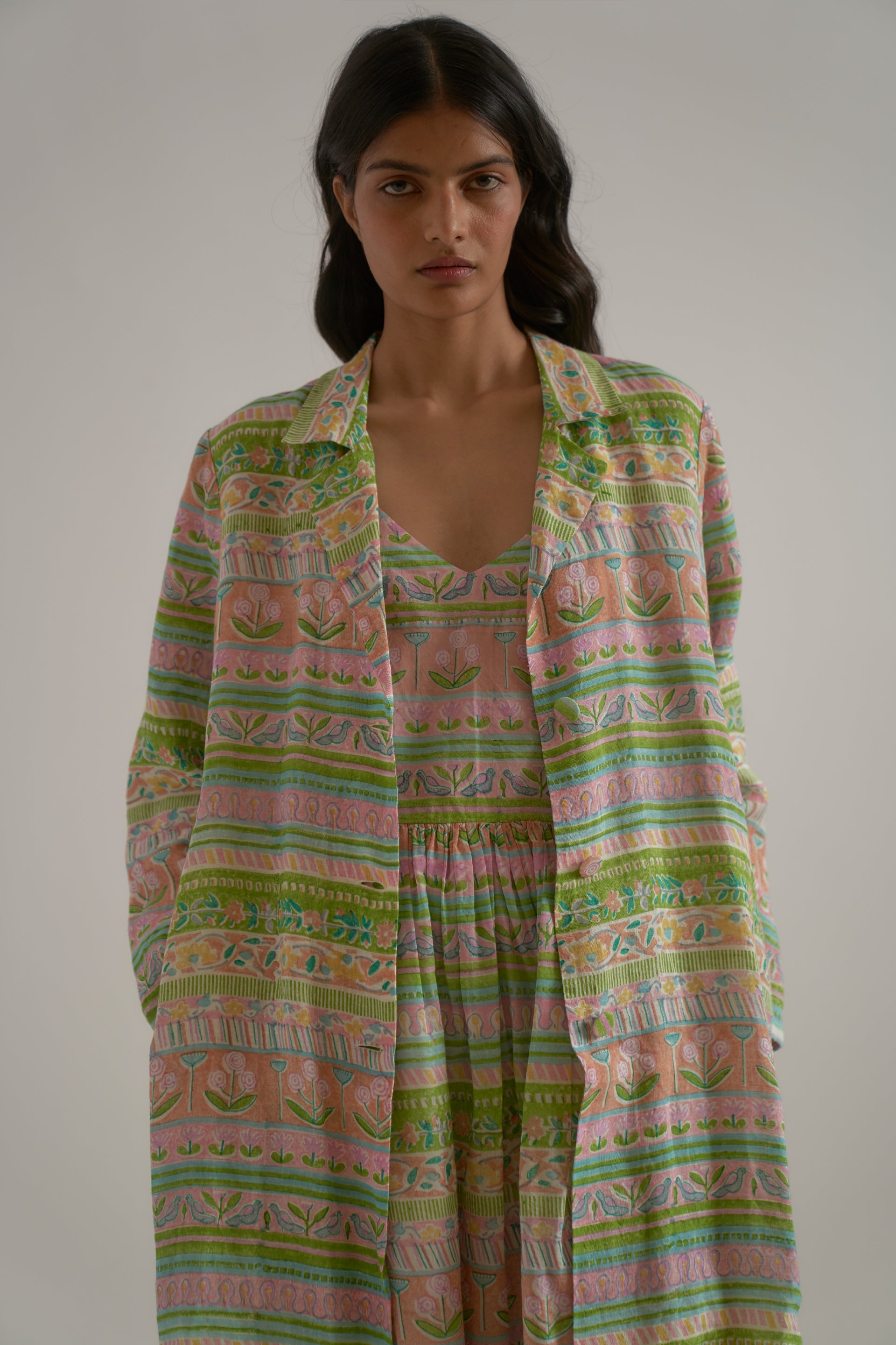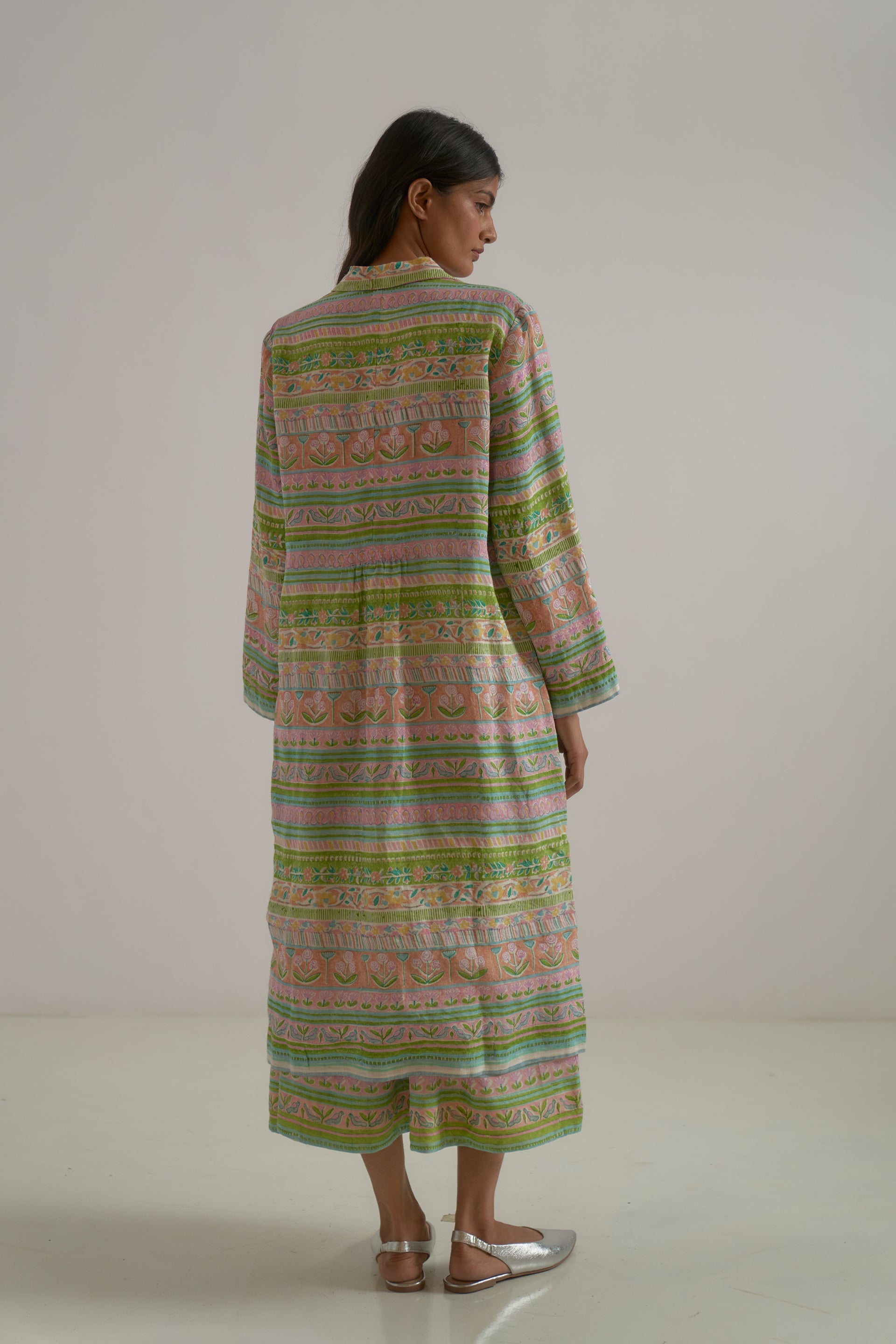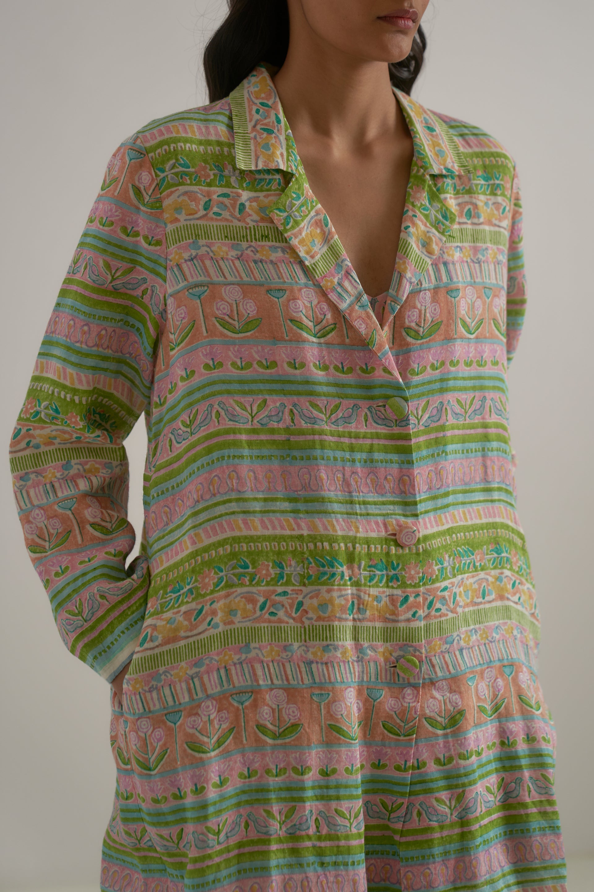 A long, straight jacket with a notch collar, crafted from 100% linen fabric. The piece features a vibrant multicolor handblock print, where 17 distinct handblocks are carefully combined to form a unique, panelled design.