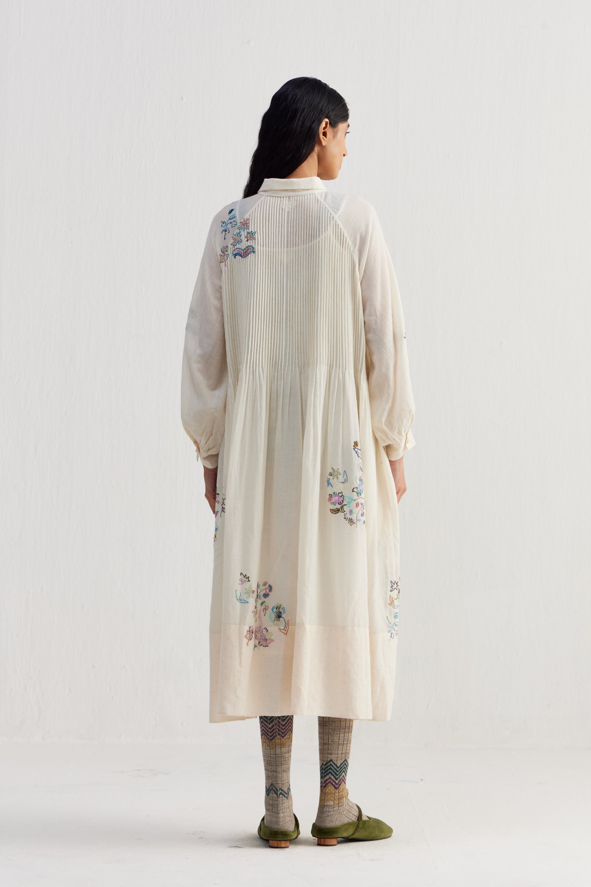 Relaxed fit front open button down collar midi dress with full puff raglan sleeves, pintucks allover the bodice and finished with handblock print 100% silk fabric facing detail at hem. Constructed in solid 100% merino wool with placement intricate sozni hand embroidery. Finished with contrast handblock print 100% silk fabric piping and facing detail.
