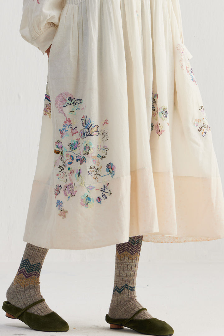 Sozni embroidery—is a 500 year old needle craft embroidery passed down through generations. Each piece reimagines traditional motifs with delicate chain stitches in silk and wool threads. Originally sozni was done in Kashmir on pashmina wool shawls in silk threads. We’ve used the dexterity and elegance of sozni and contemporised it in patterns, colors, and stitch variations.