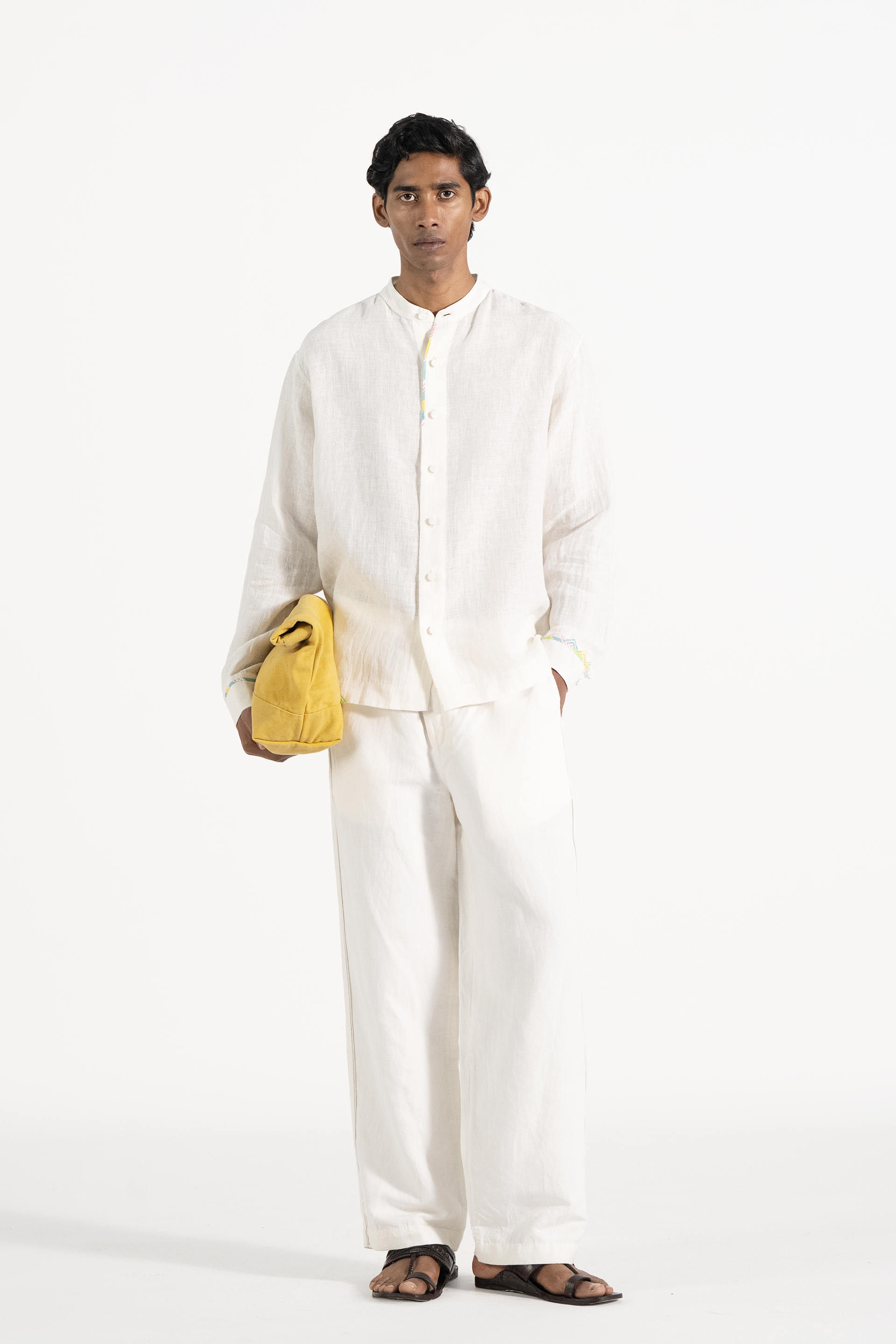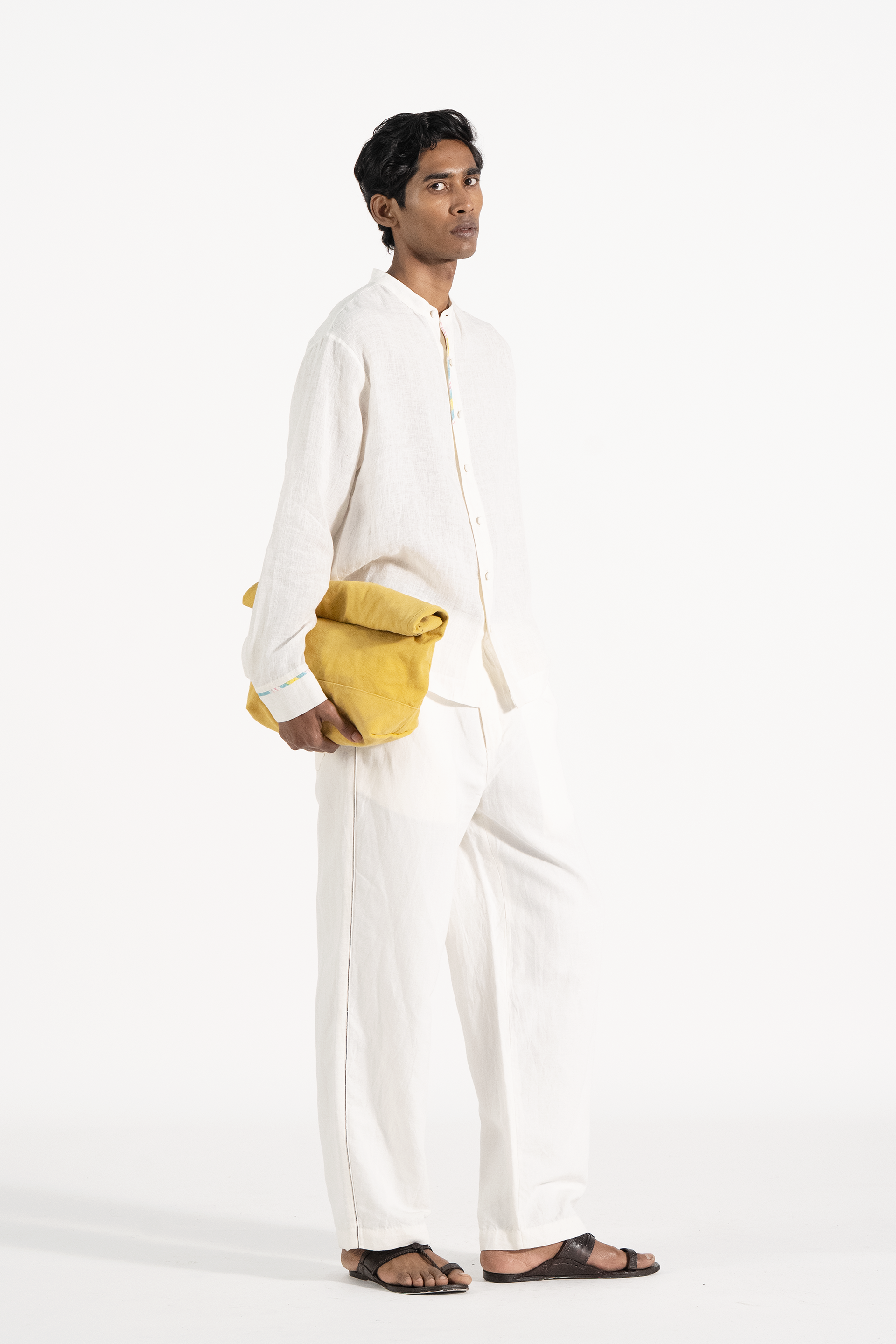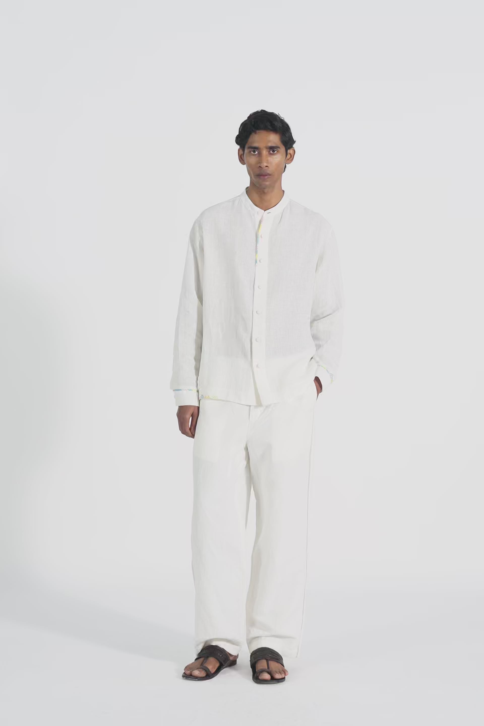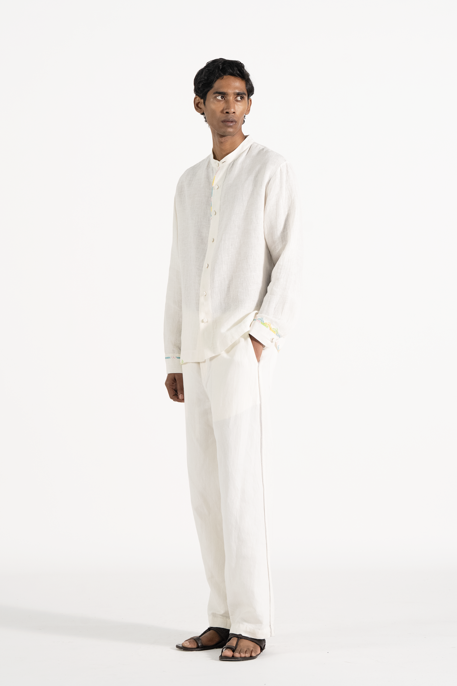 Full sleeves relaxed shirt in solid handwoven linen with contrast hand block print binding on placket and sleeves.
