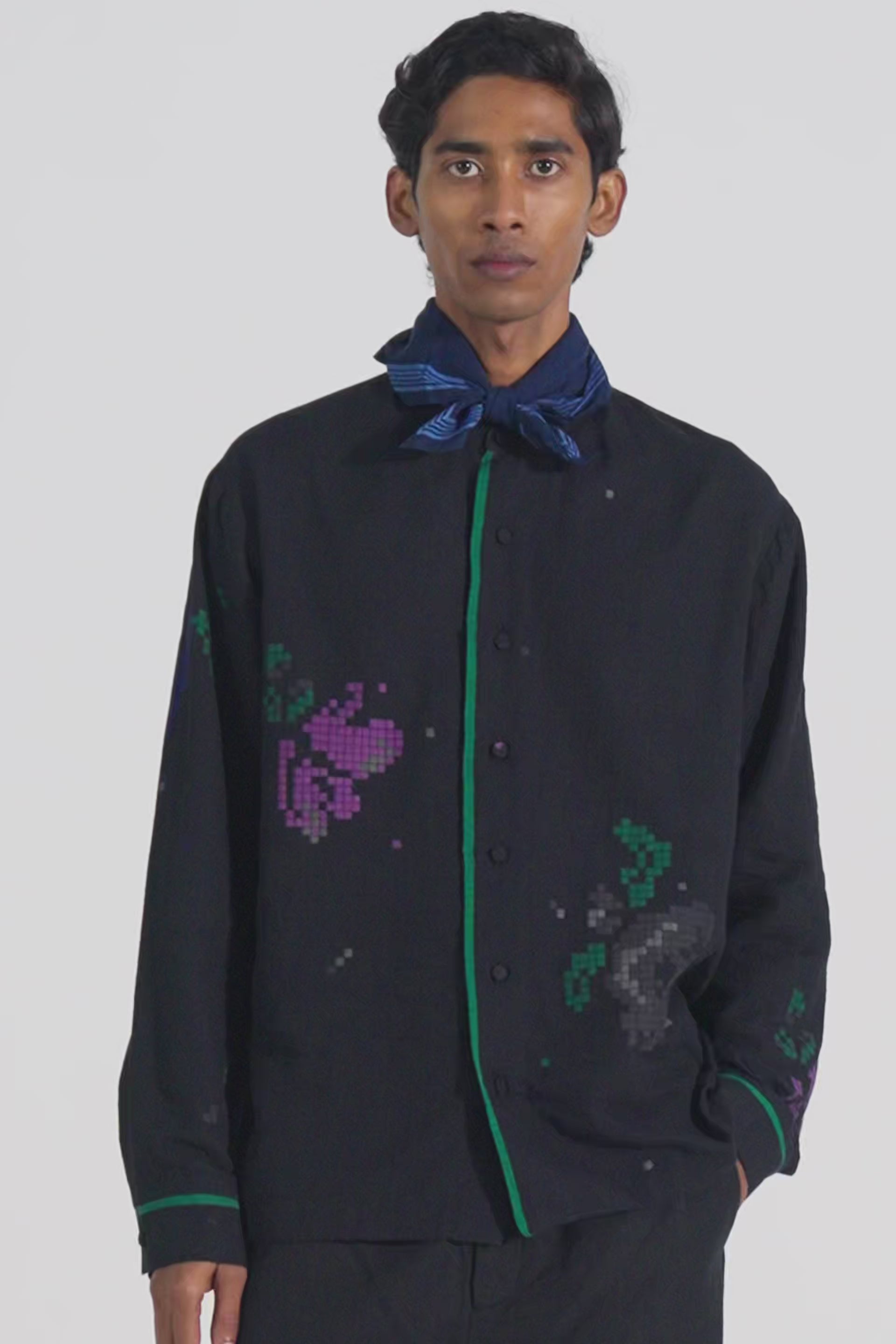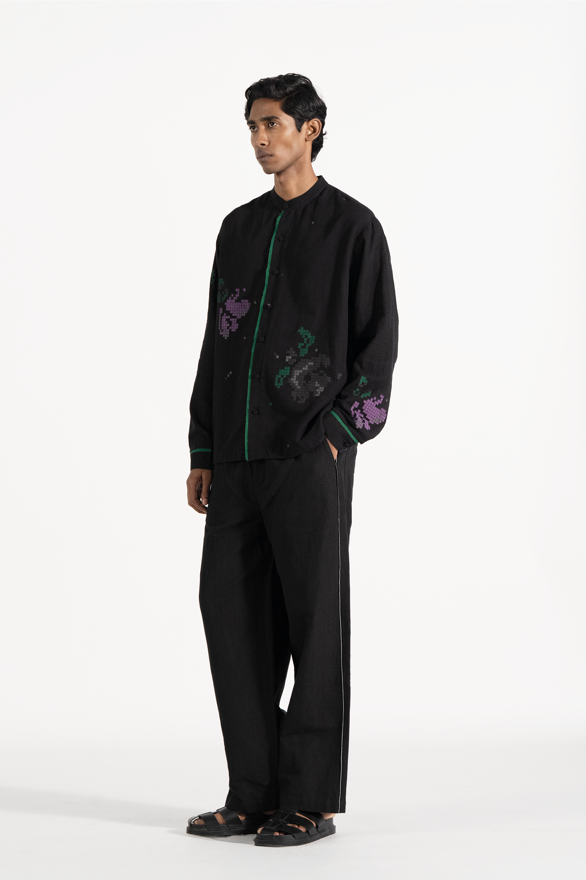 Full sleeves relaxed shirt in handwoven cotton jamdani jacquard with pixelated floral motifs.