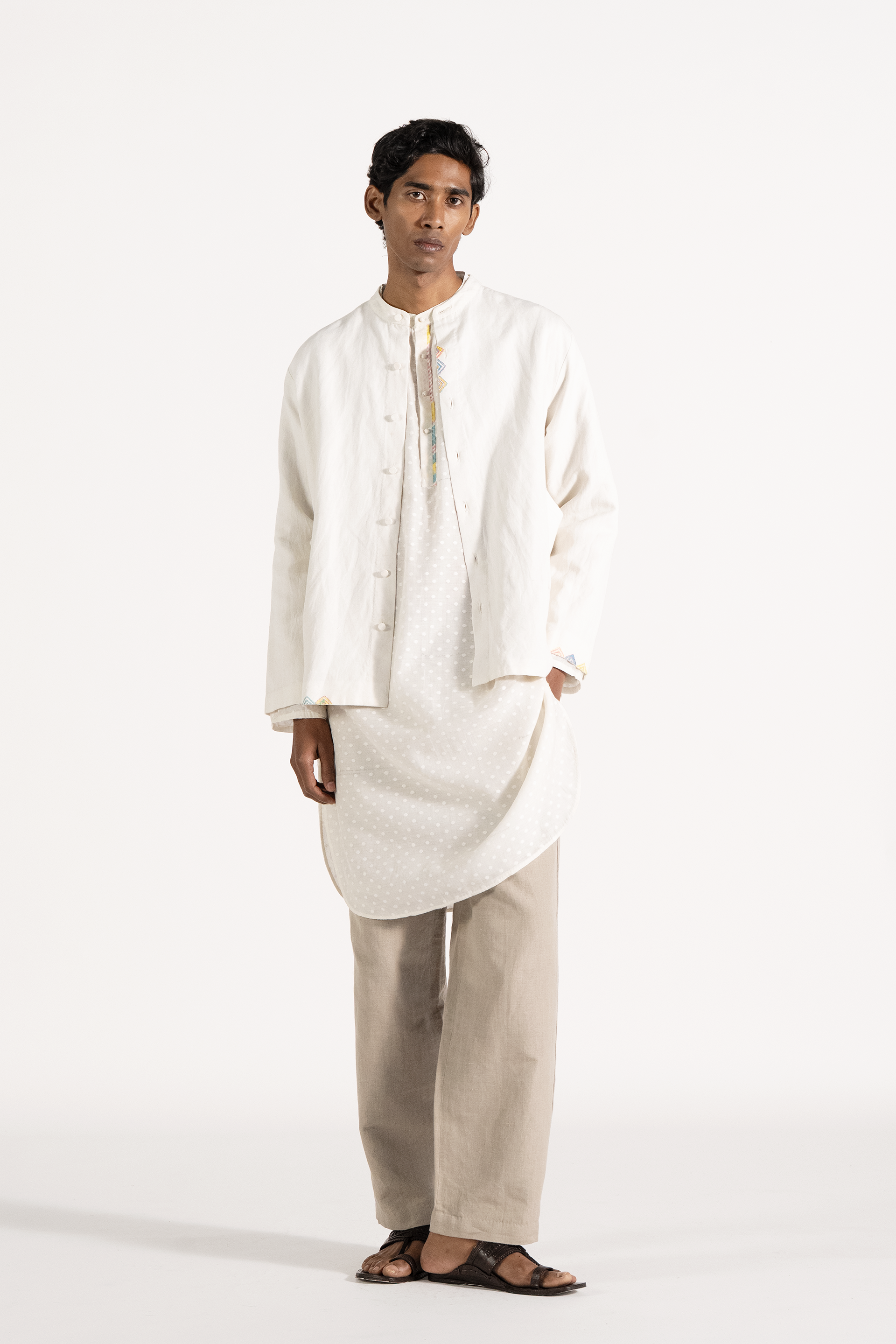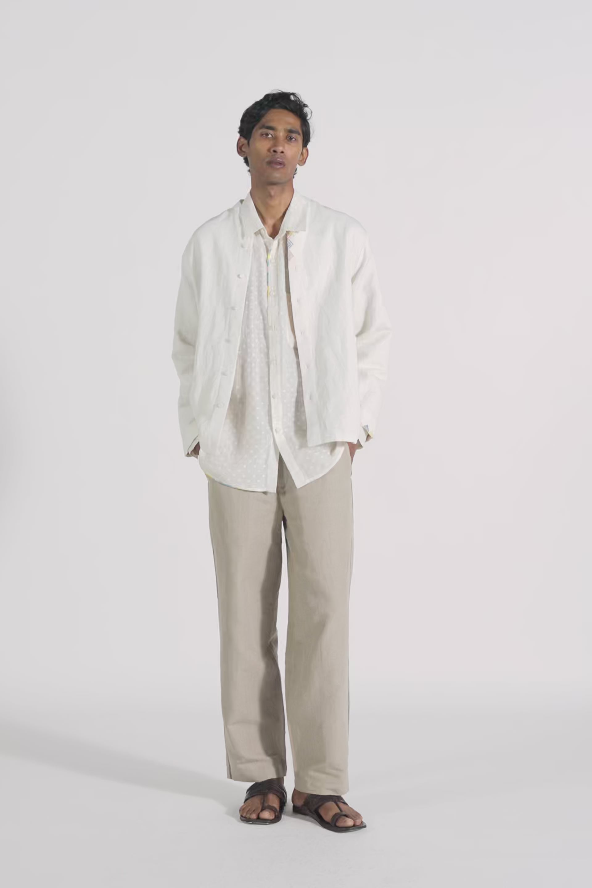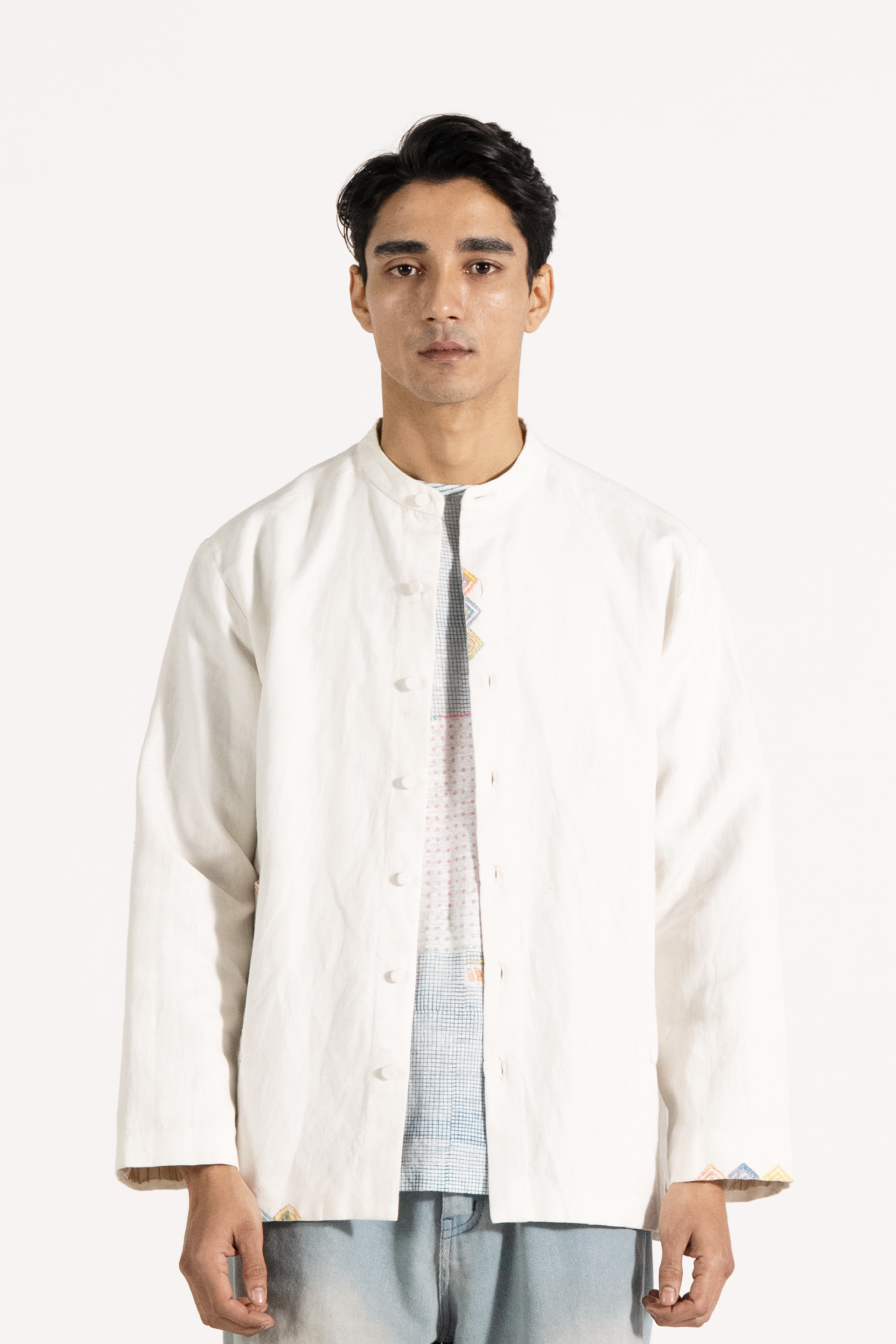 Oversized lined jacket in hand block chevron print accents in handwoven solid linen.