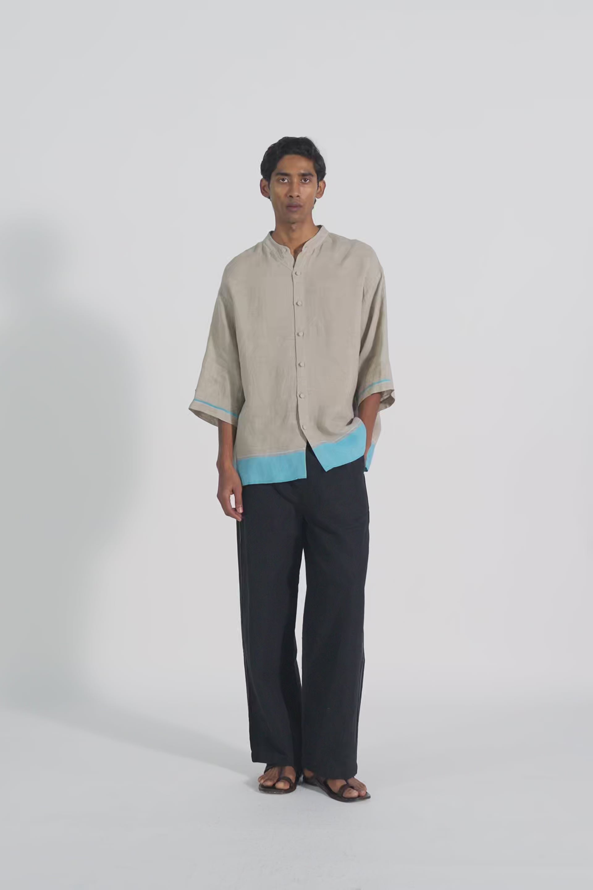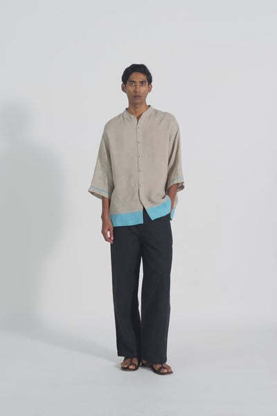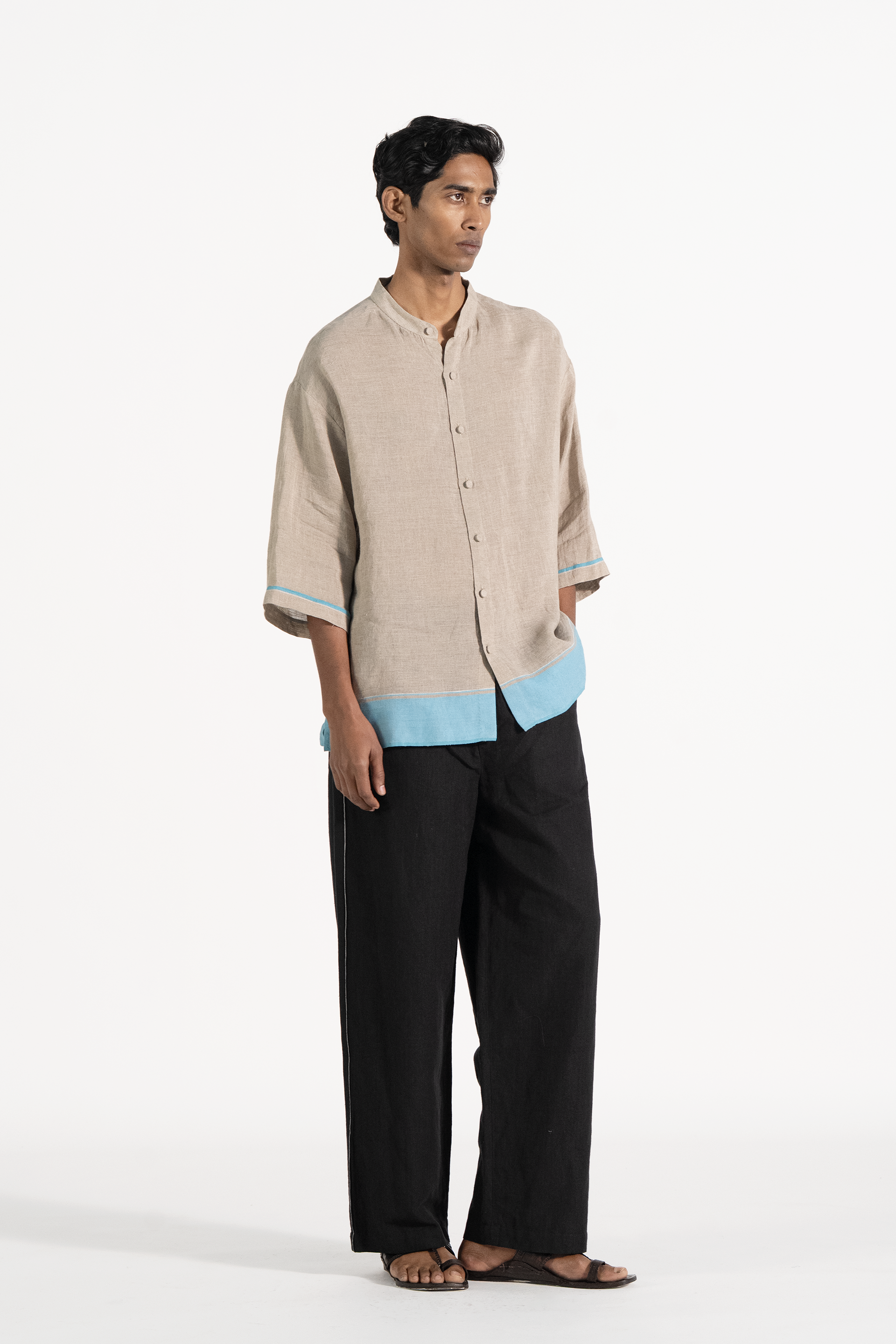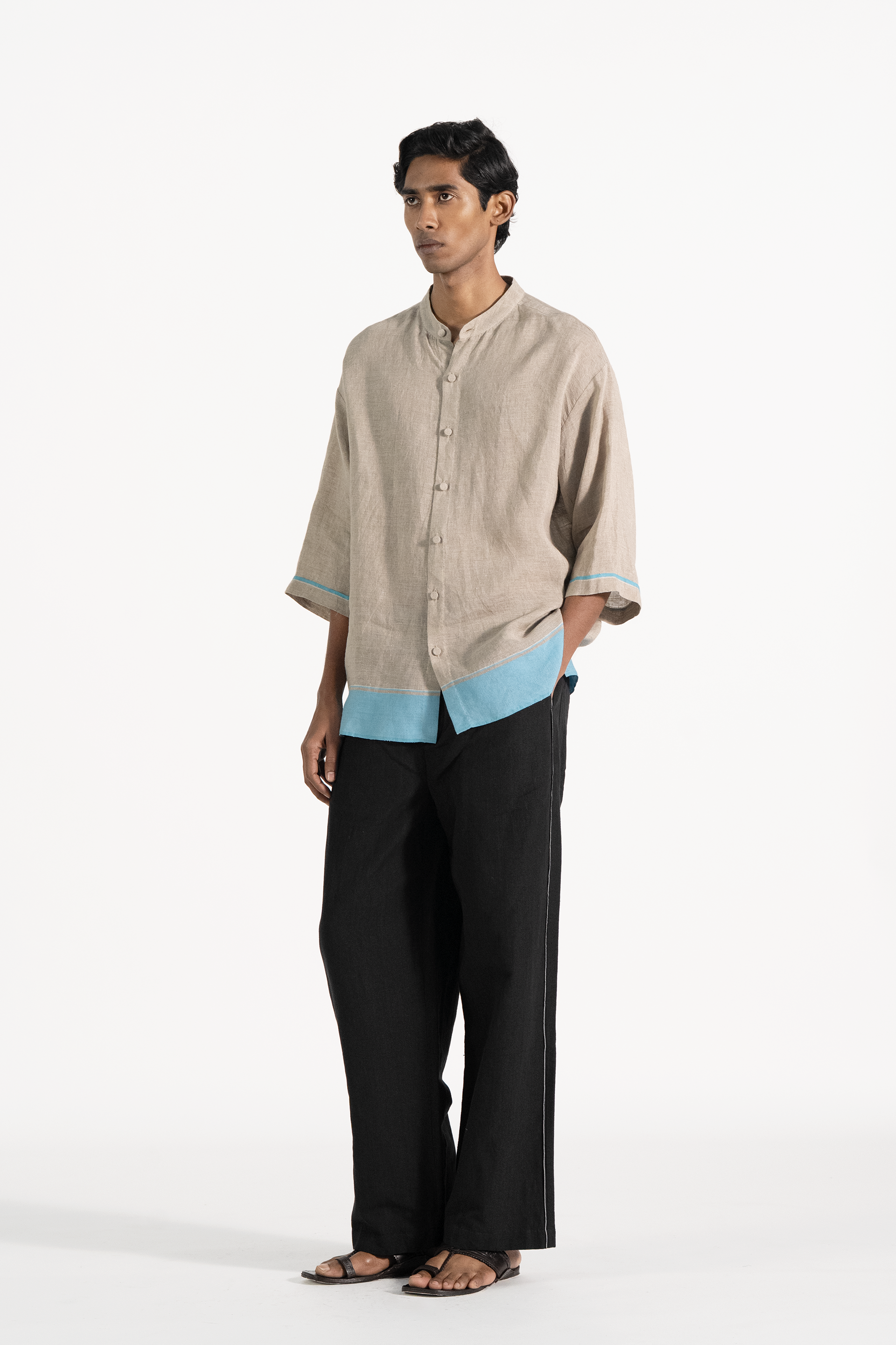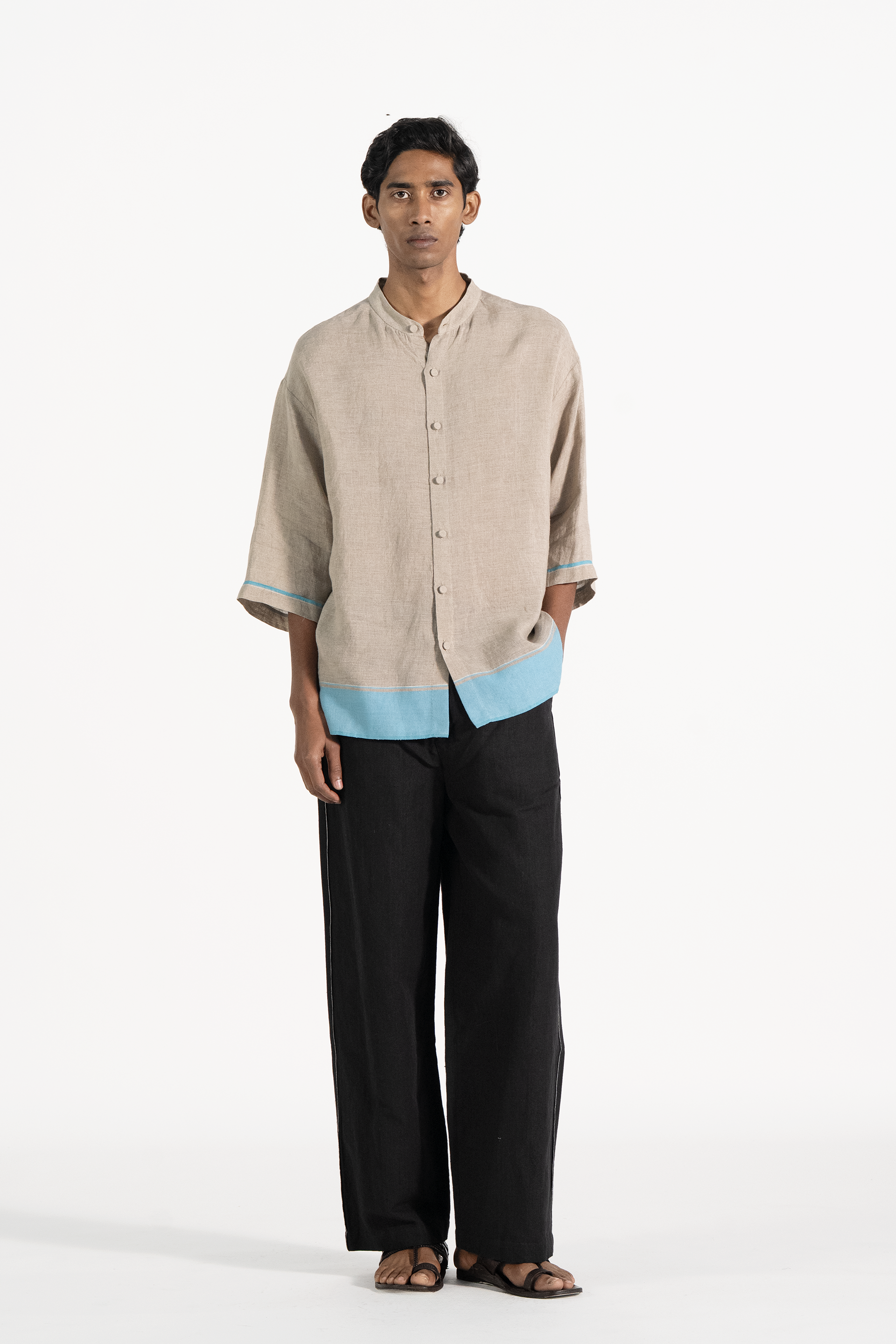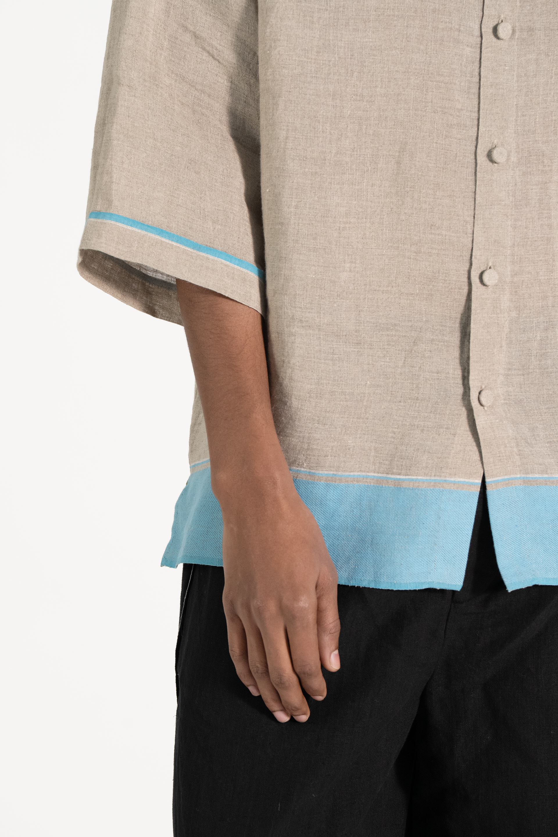 Shirt in solid handwoven linen with contrast twill border selvage details.