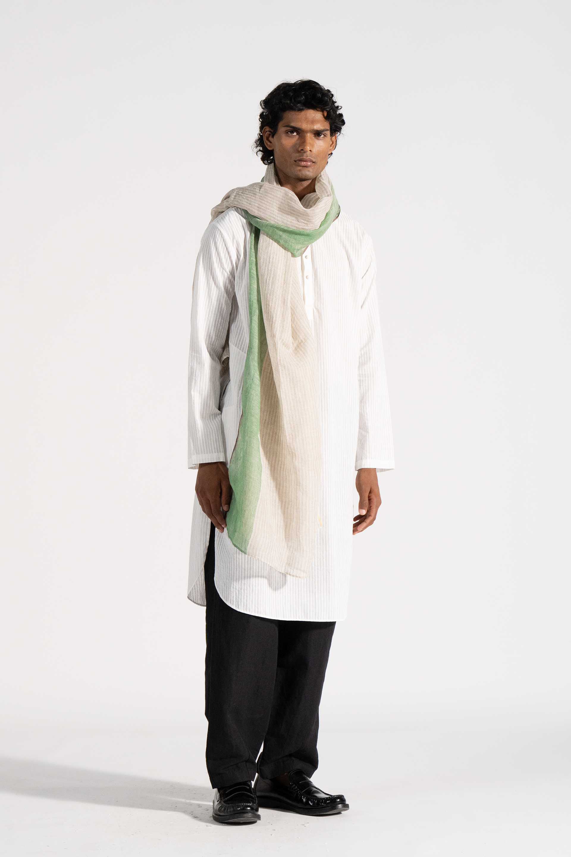 Mandarin collar full sleeve long kurta with curved hem in cotton with handblock stripe print.