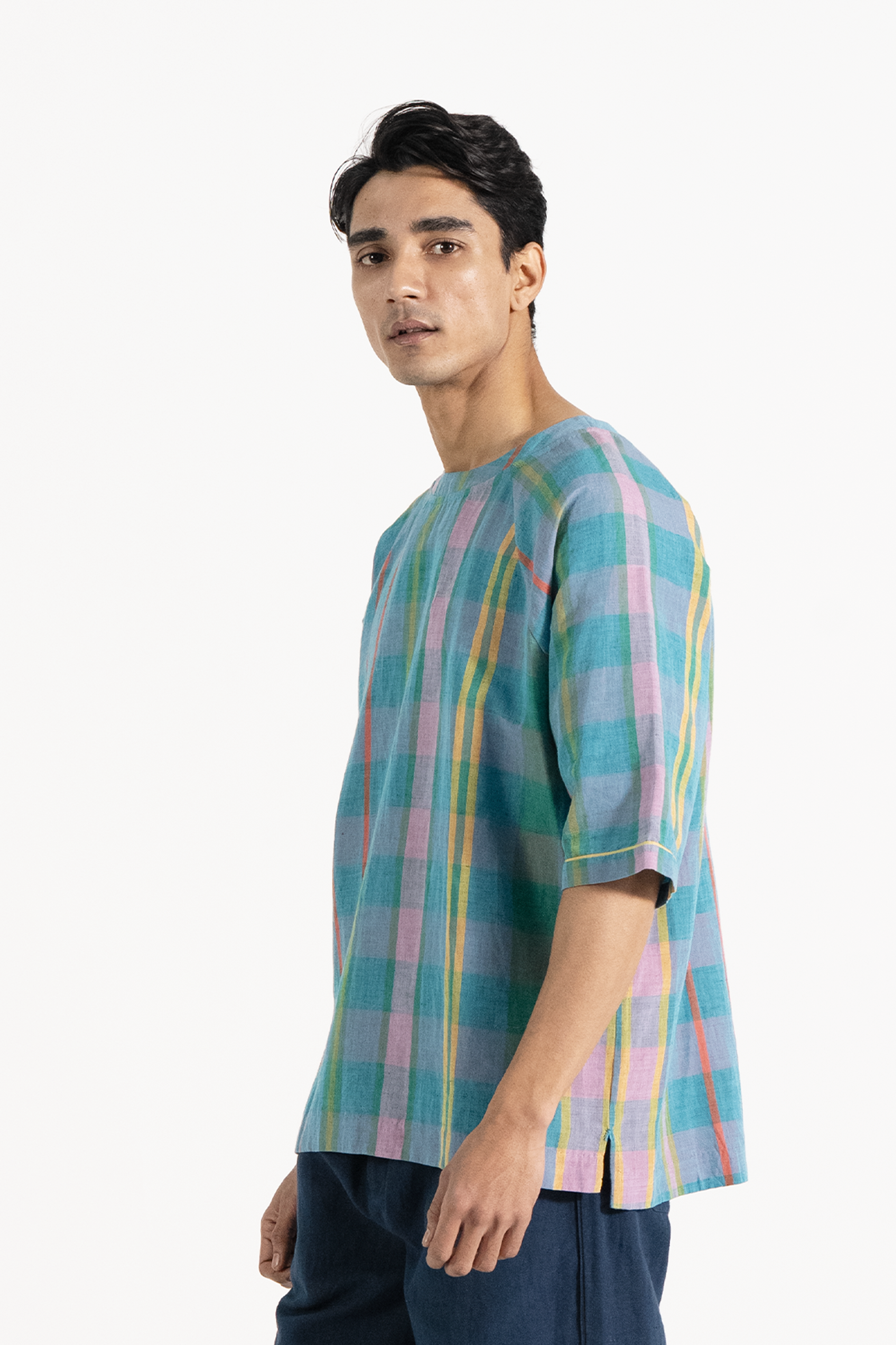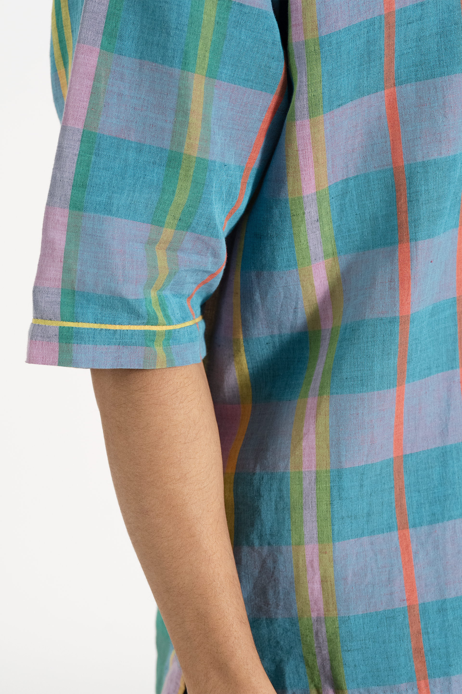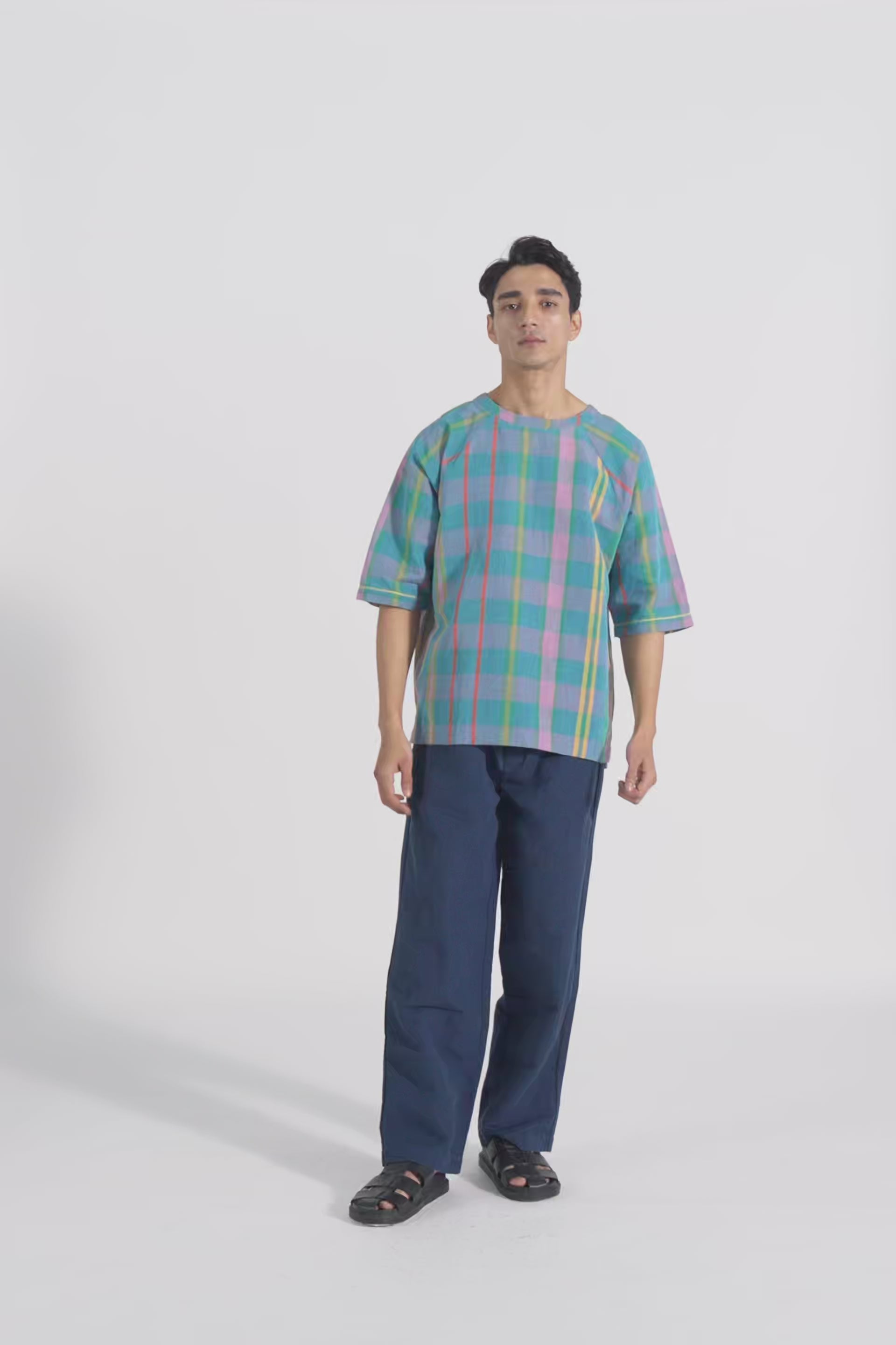 Crew neck raglan t-shirt in handwoven cotton linen yarn dyed chunky checks.