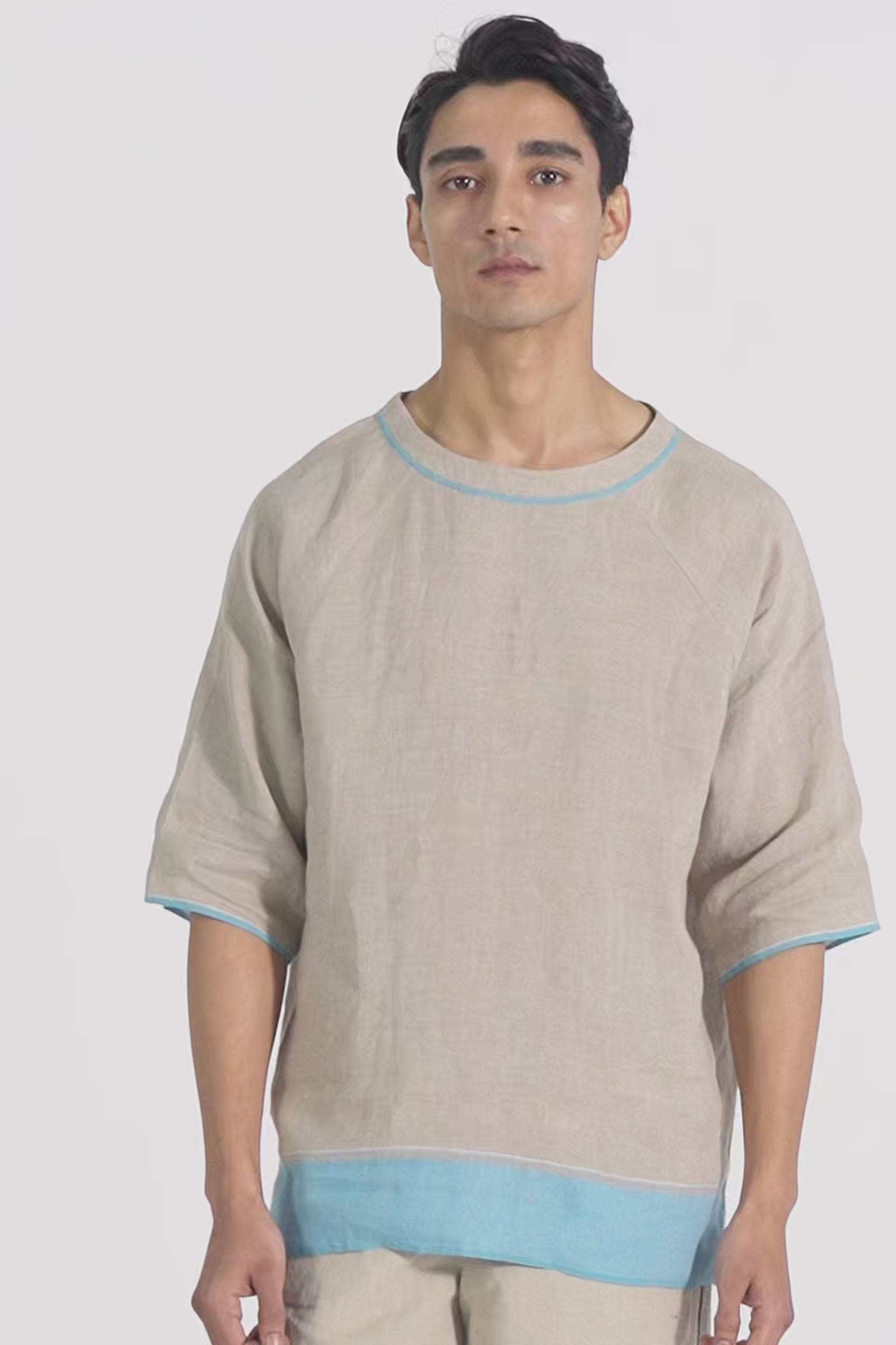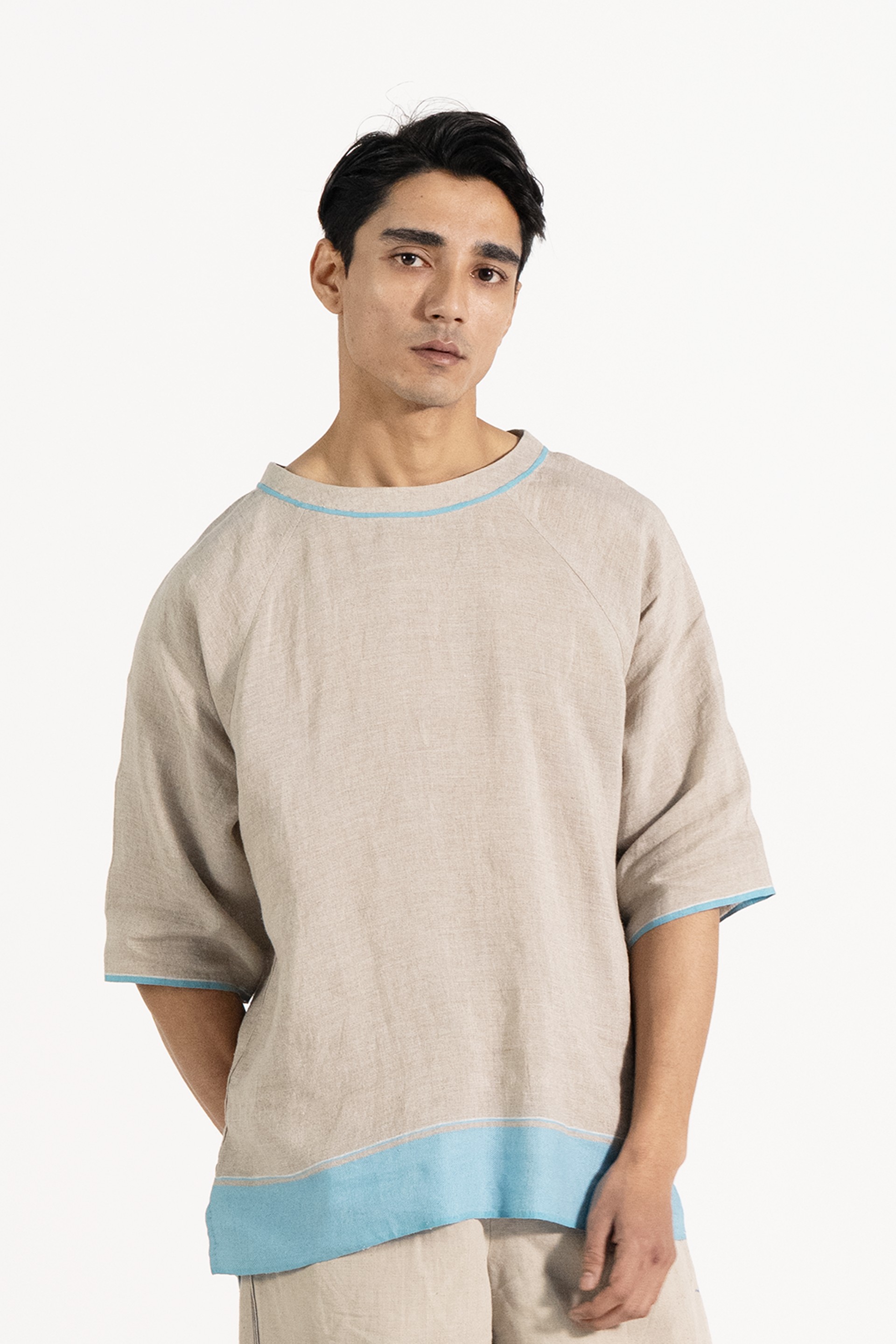 Crew neck raglan t-shirt in solid handwoven linen with contrast twill border selvage details.