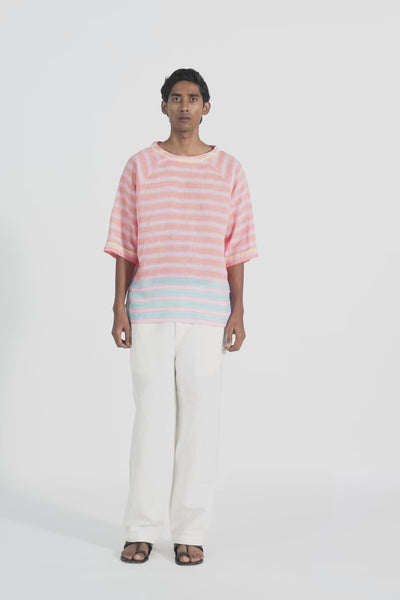 Crew neck t-shirt in handwoven linen multicolor yarn contrasting stripes at bottom.