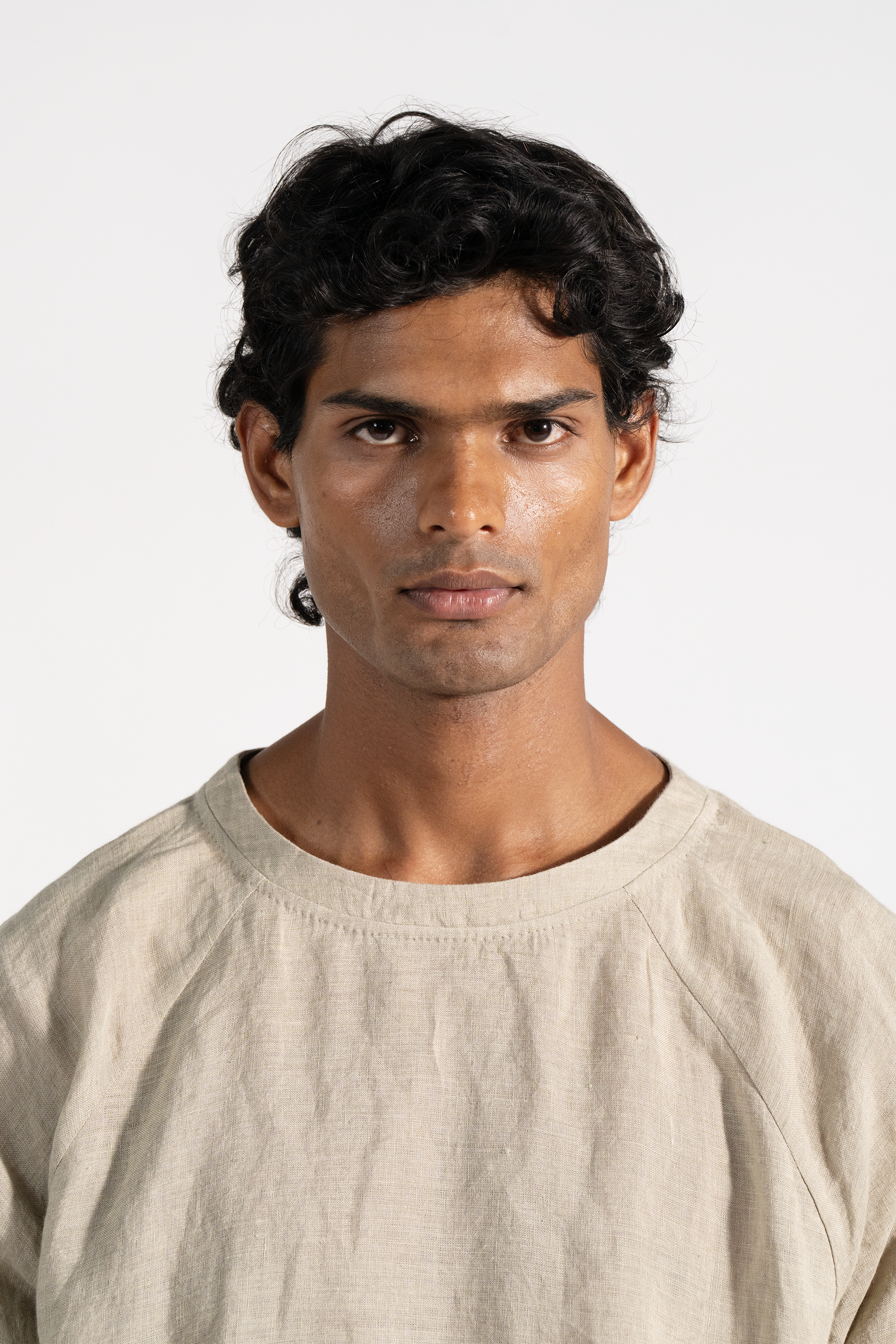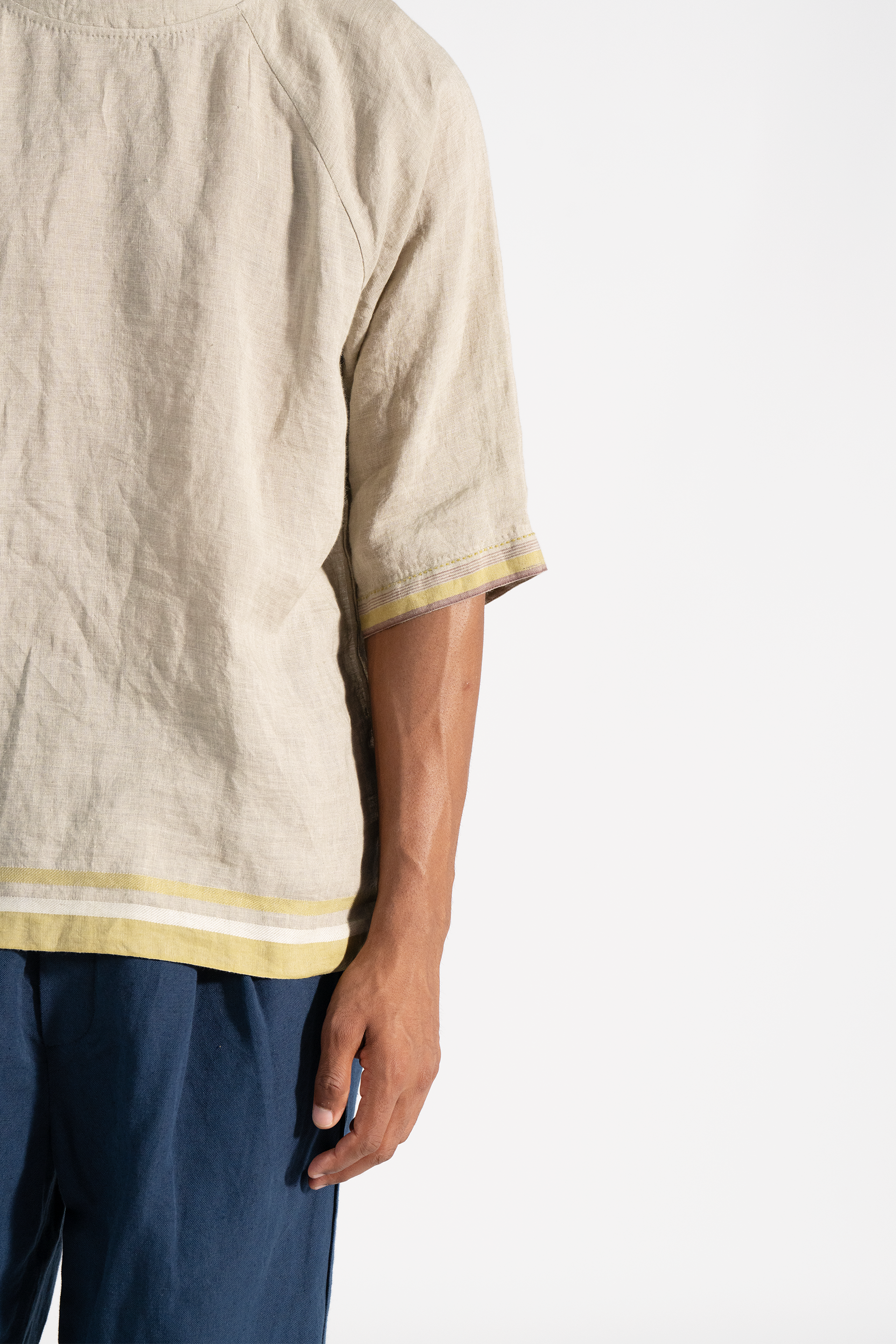 Crew neck relaxed fit with raglan sleeve linen t-shirt in dual tone.