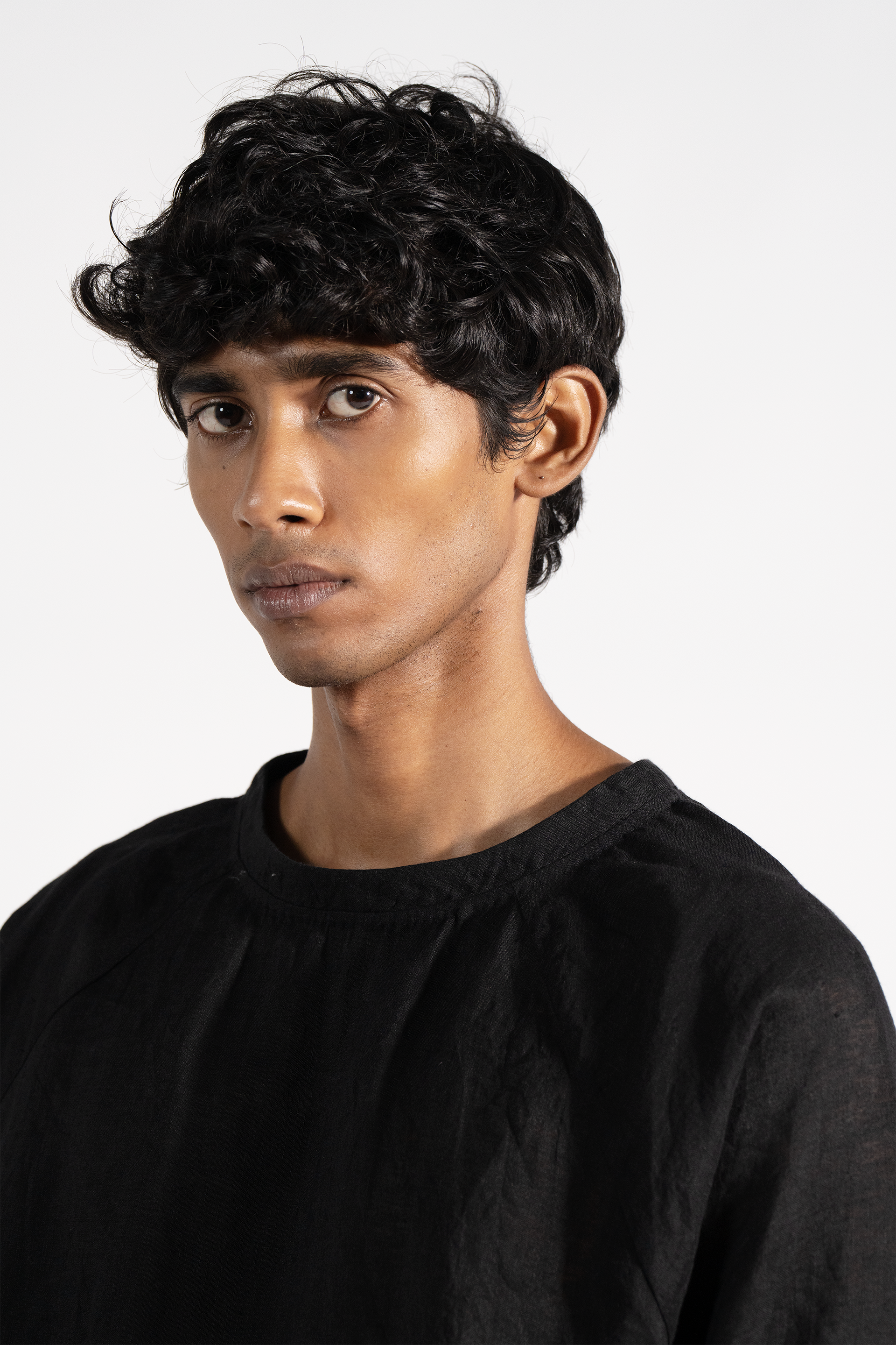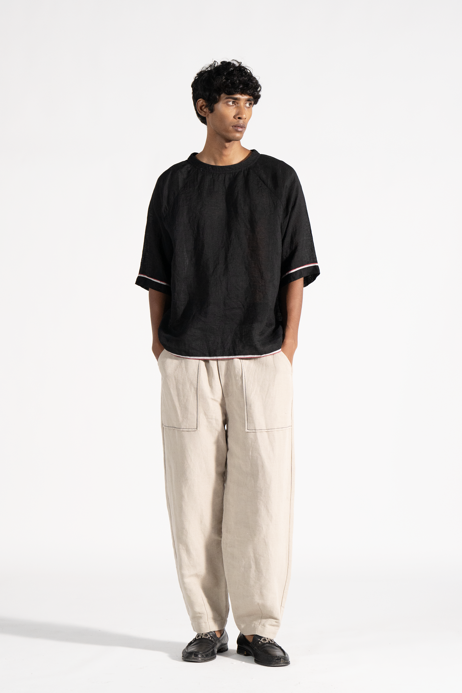 Crew neck t-shirt constructed in 100% linen fabric with border detail on sleeve and hem.