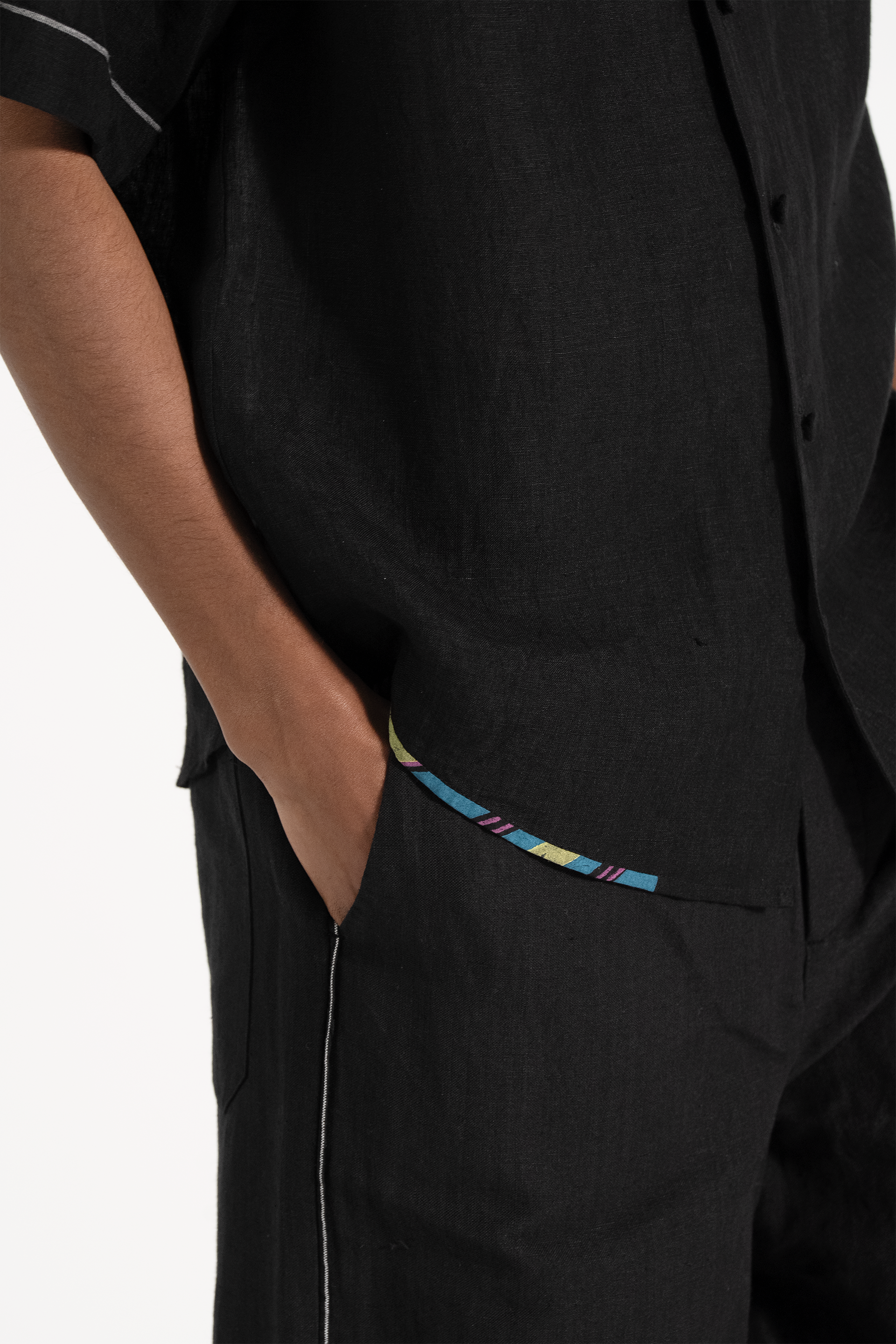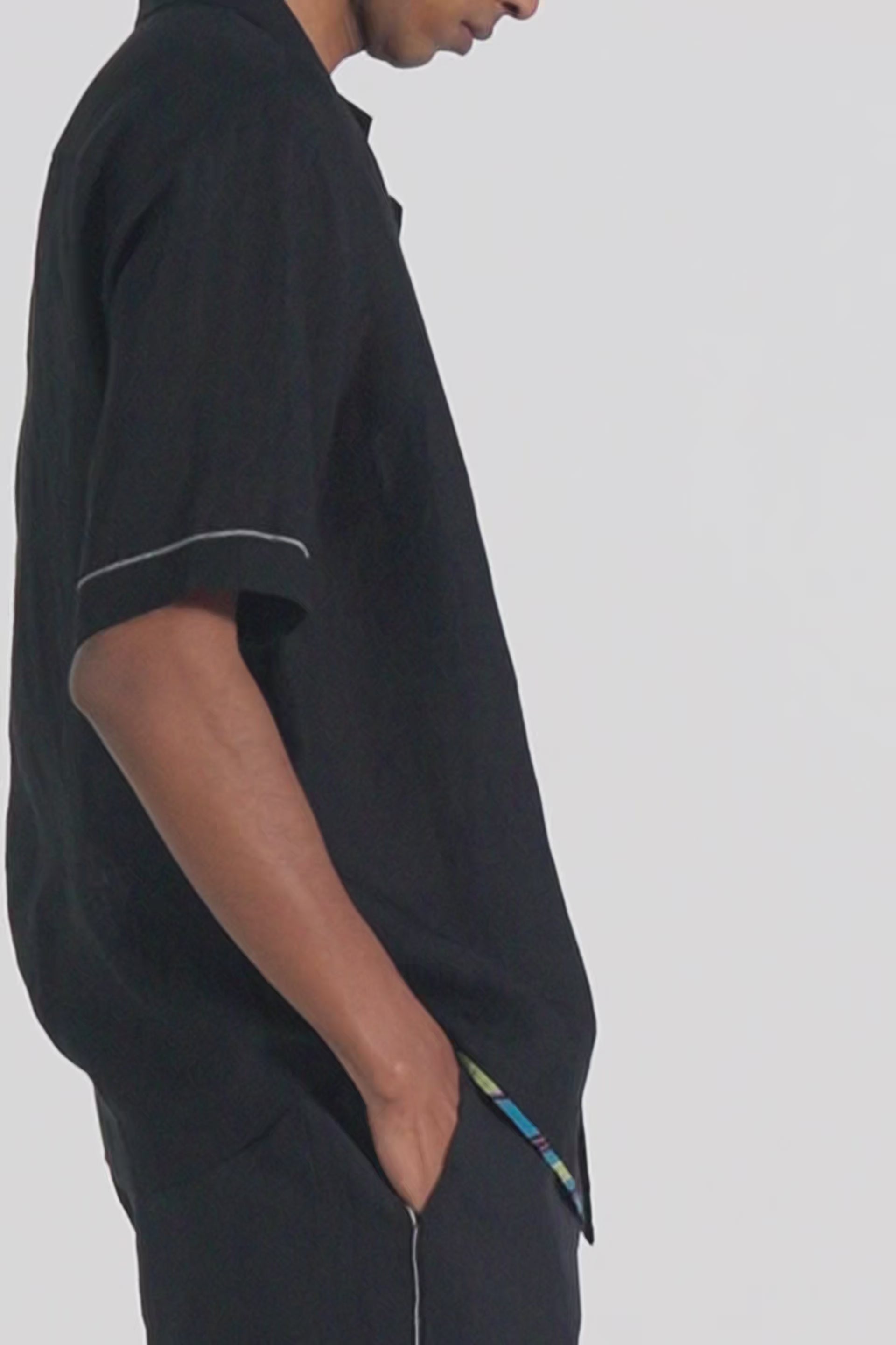 Half sleeve summer shirt in solid handwoven yarn dyed linen witch contrast hand block print binding details on placket and hemline.