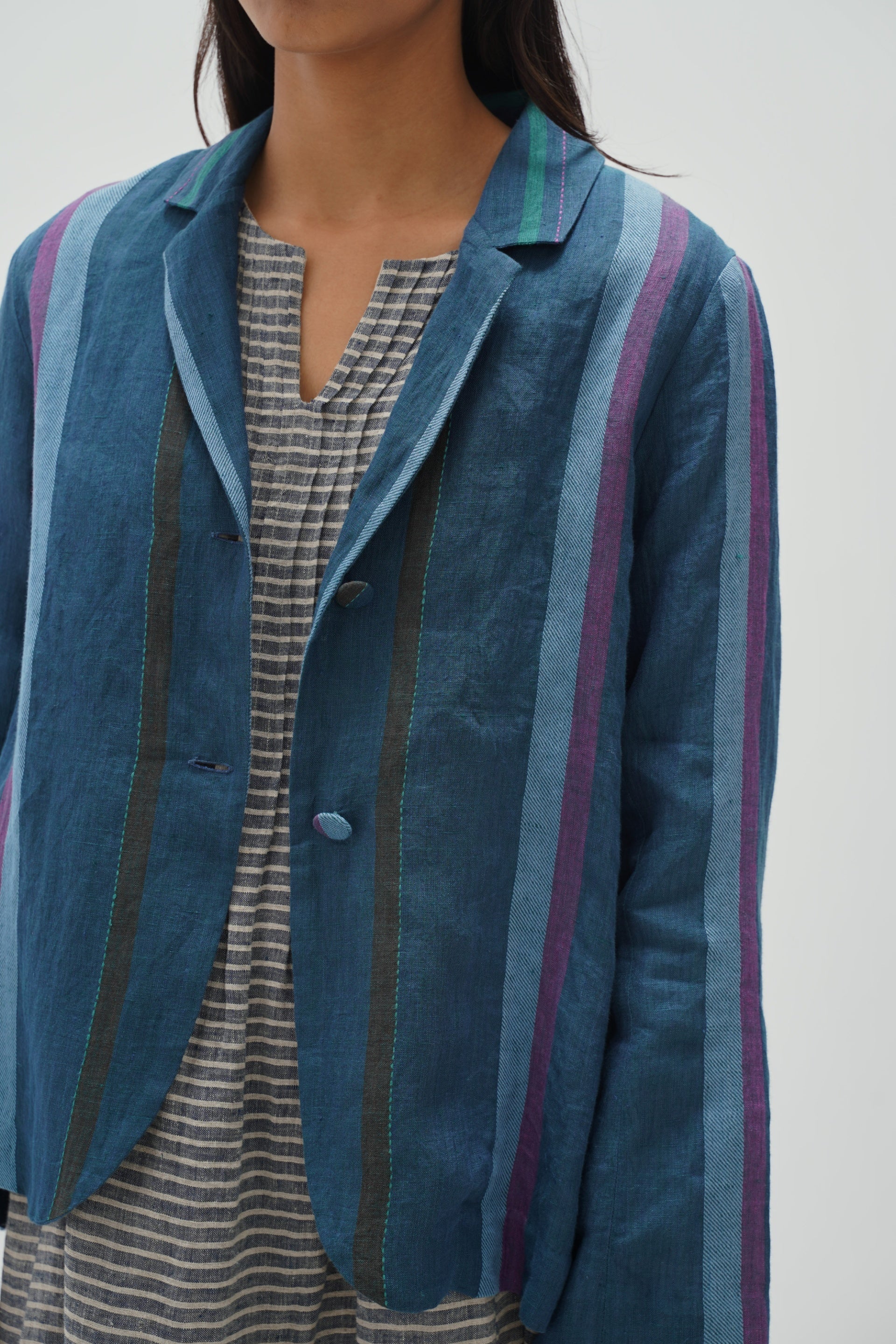 Short blazer with contrast stripes detail in multi-weaves. Comes with an attached hand block printed cotton lining.