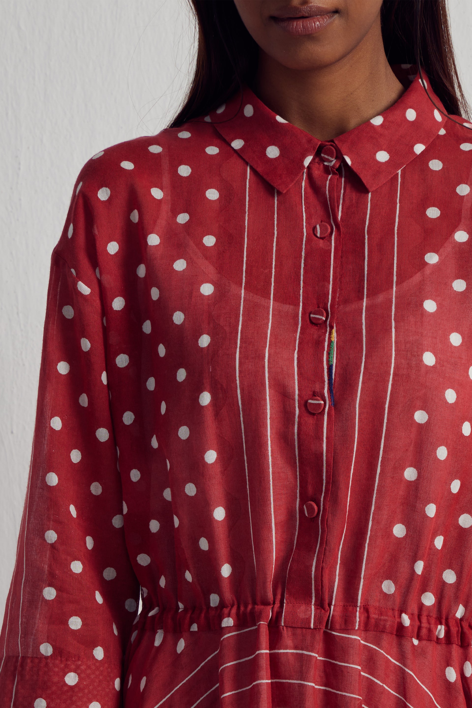 This midi dress features an all over hand-block polka dot and stripe mix print. It has a front opening to the waist, a waist tie-up detail, and hand embroidery on the placket. The hem and sleeves are finished with hand-block check print in cotton silk. Practical side pockets complete the look.