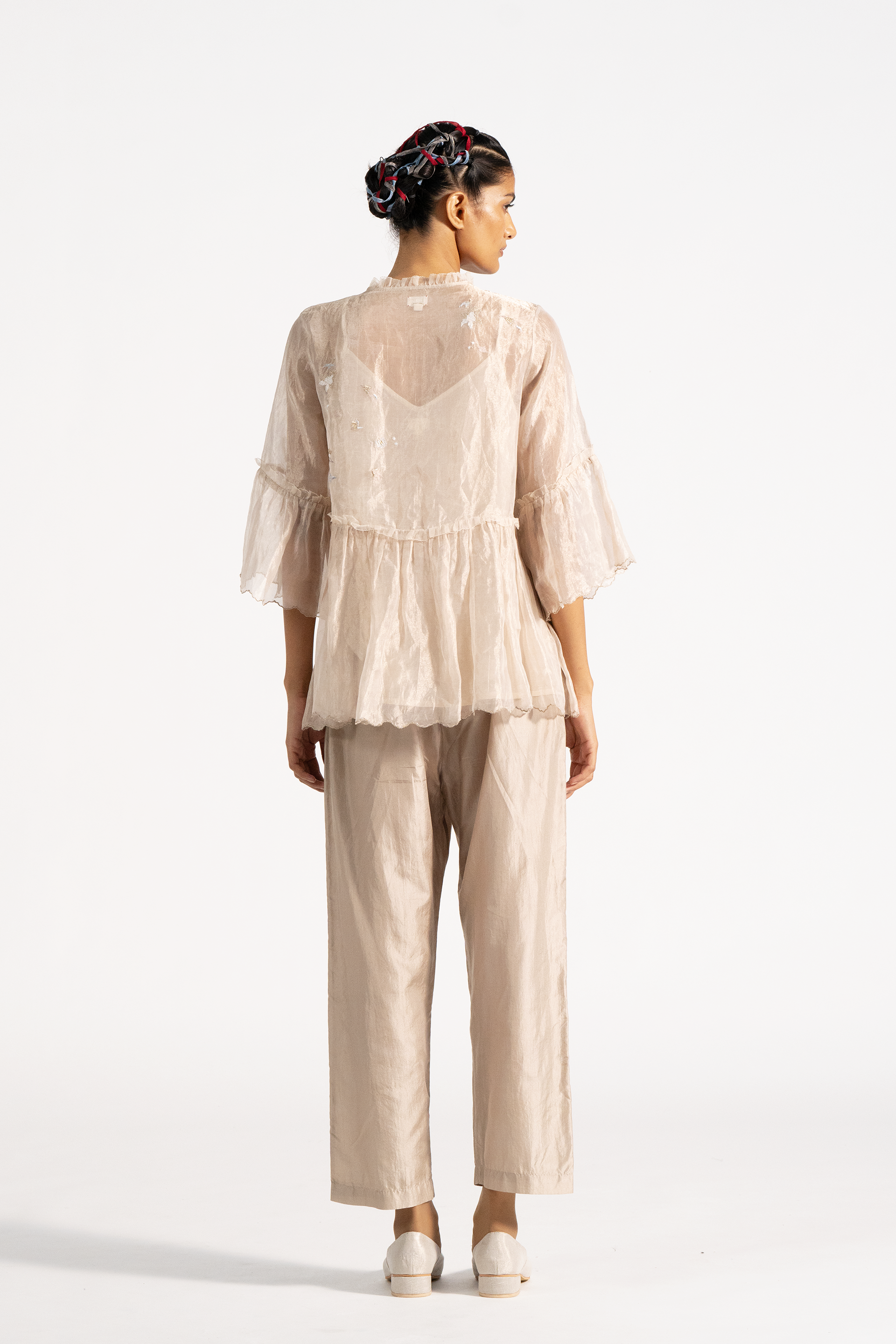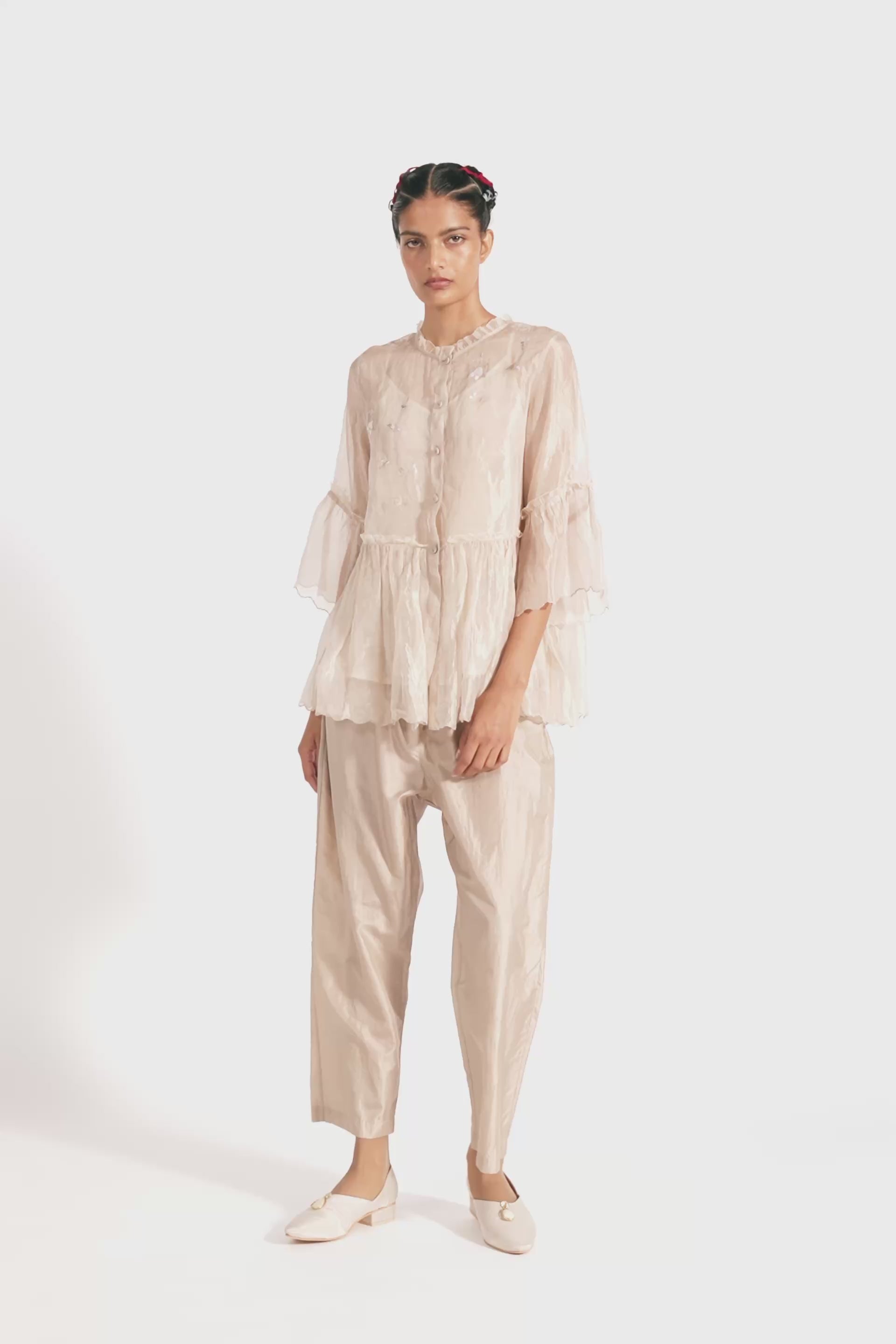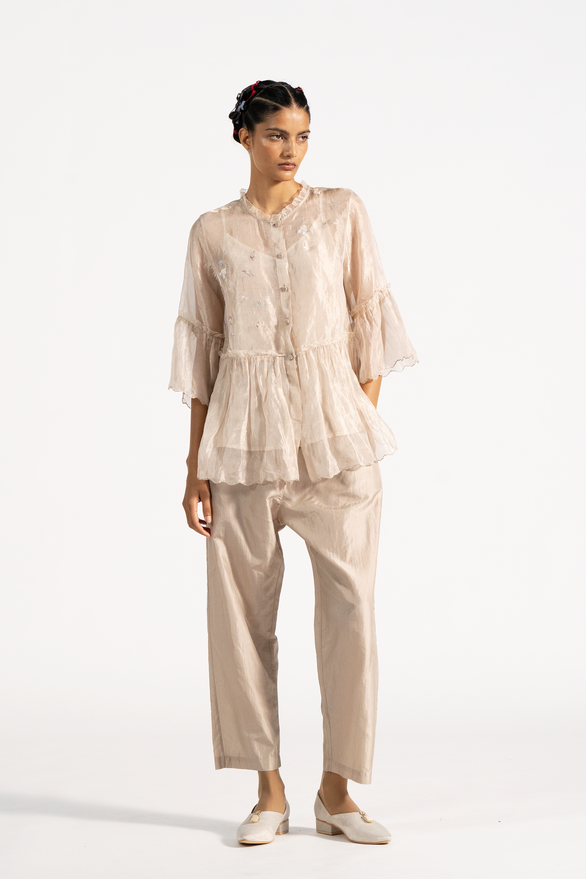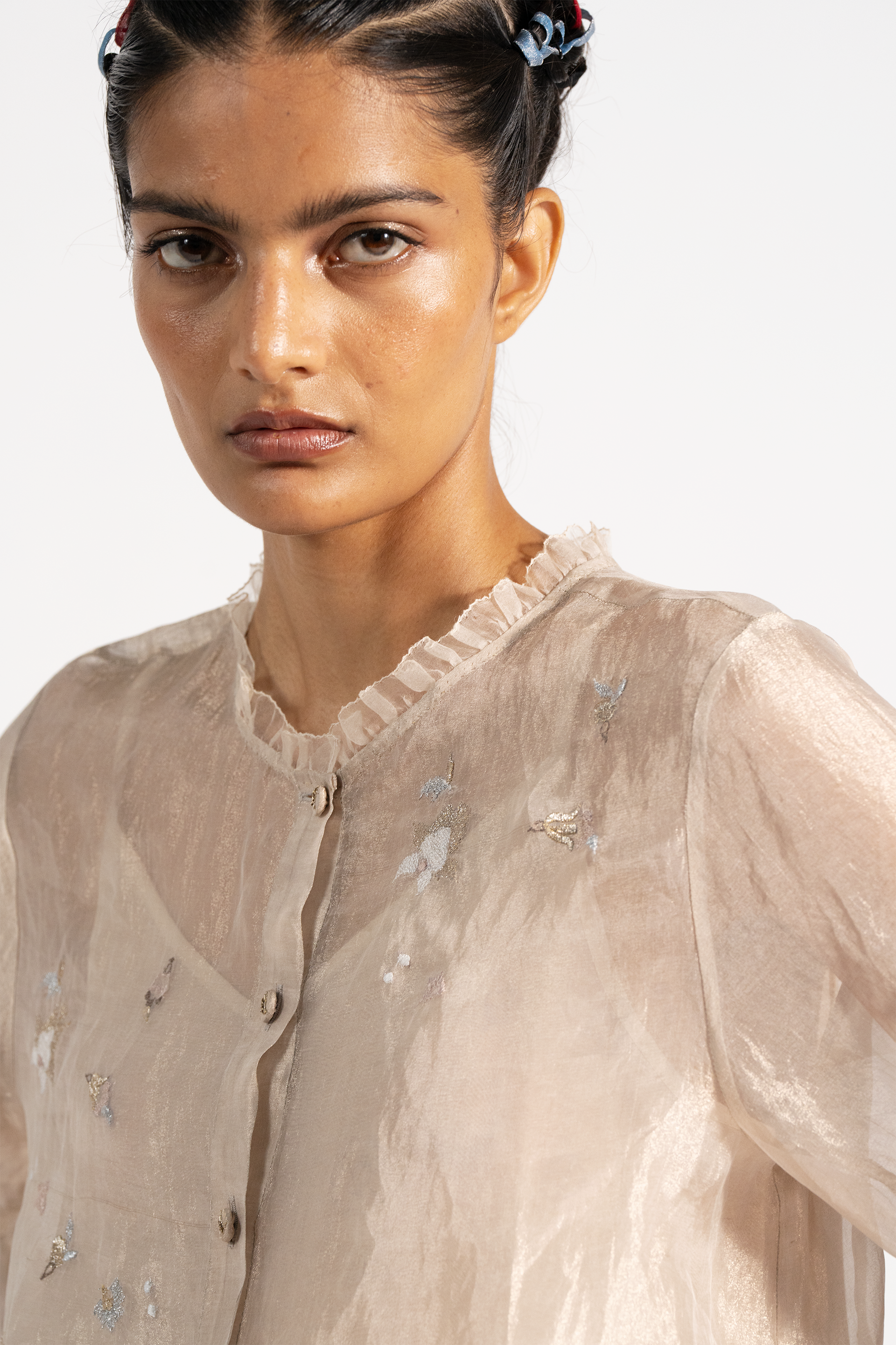 Button down tiered top with gathers in golden tissue. With multicolor floral embroidery. Comes with a complimentary cotton silk lining.