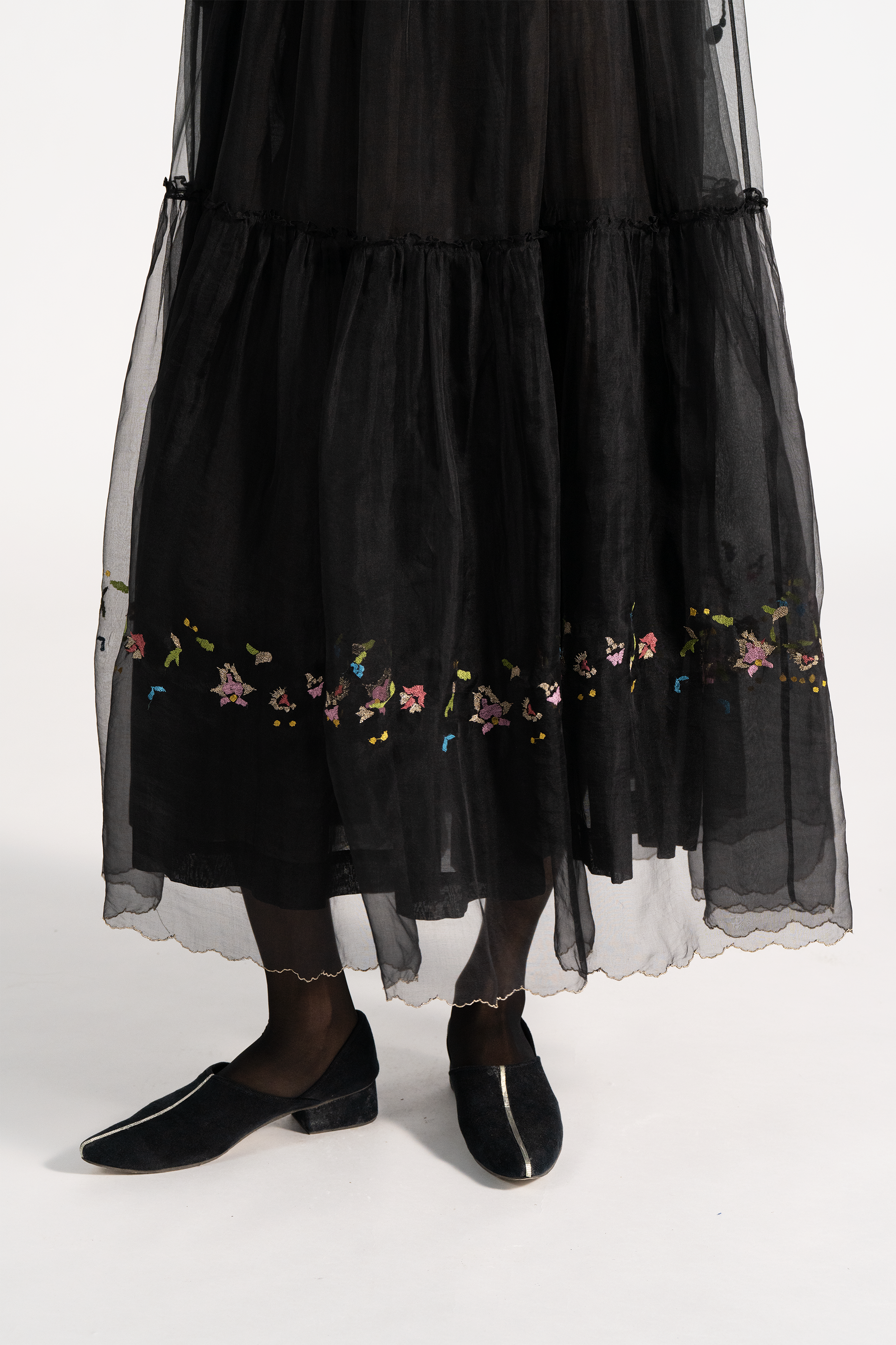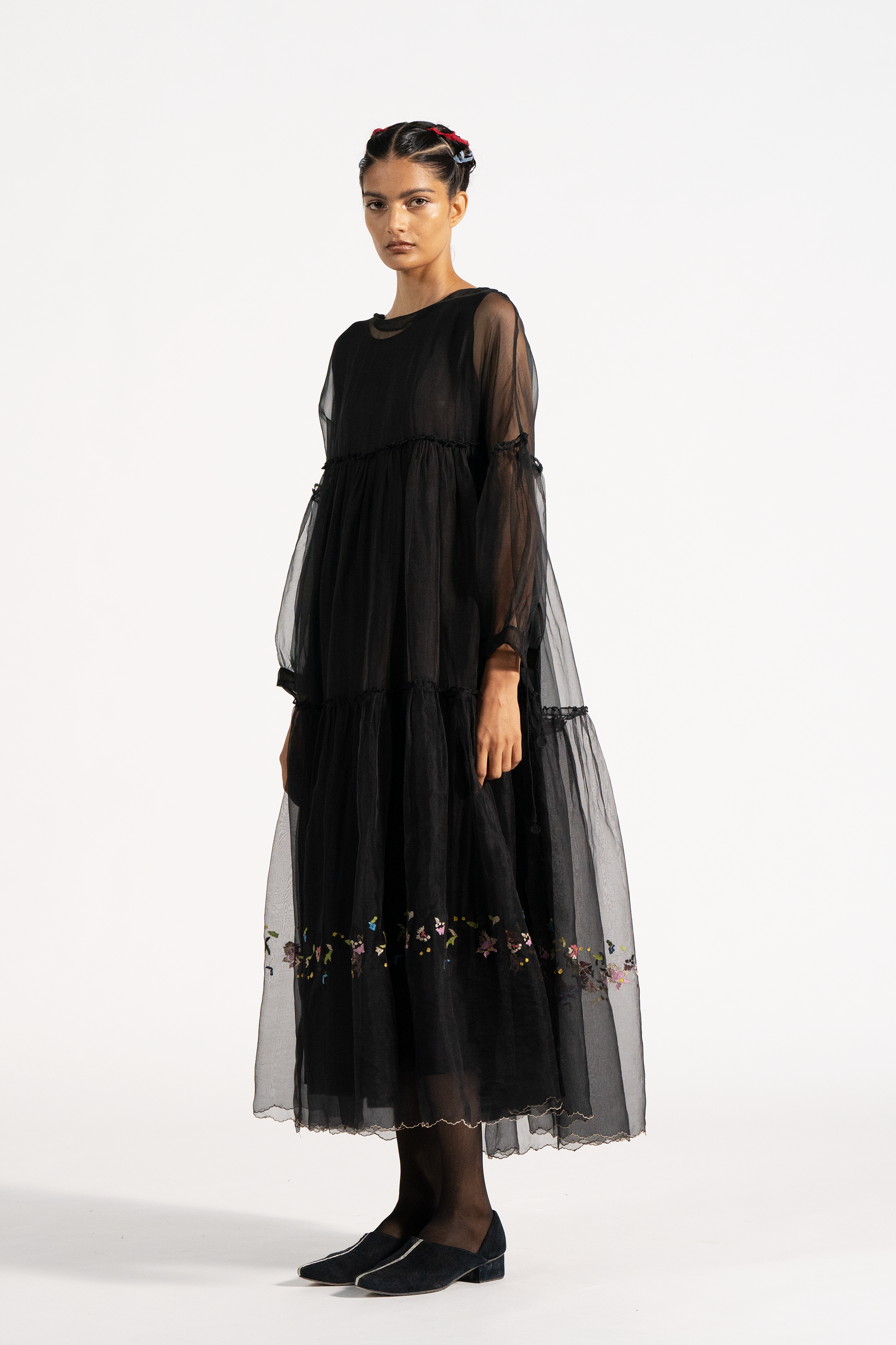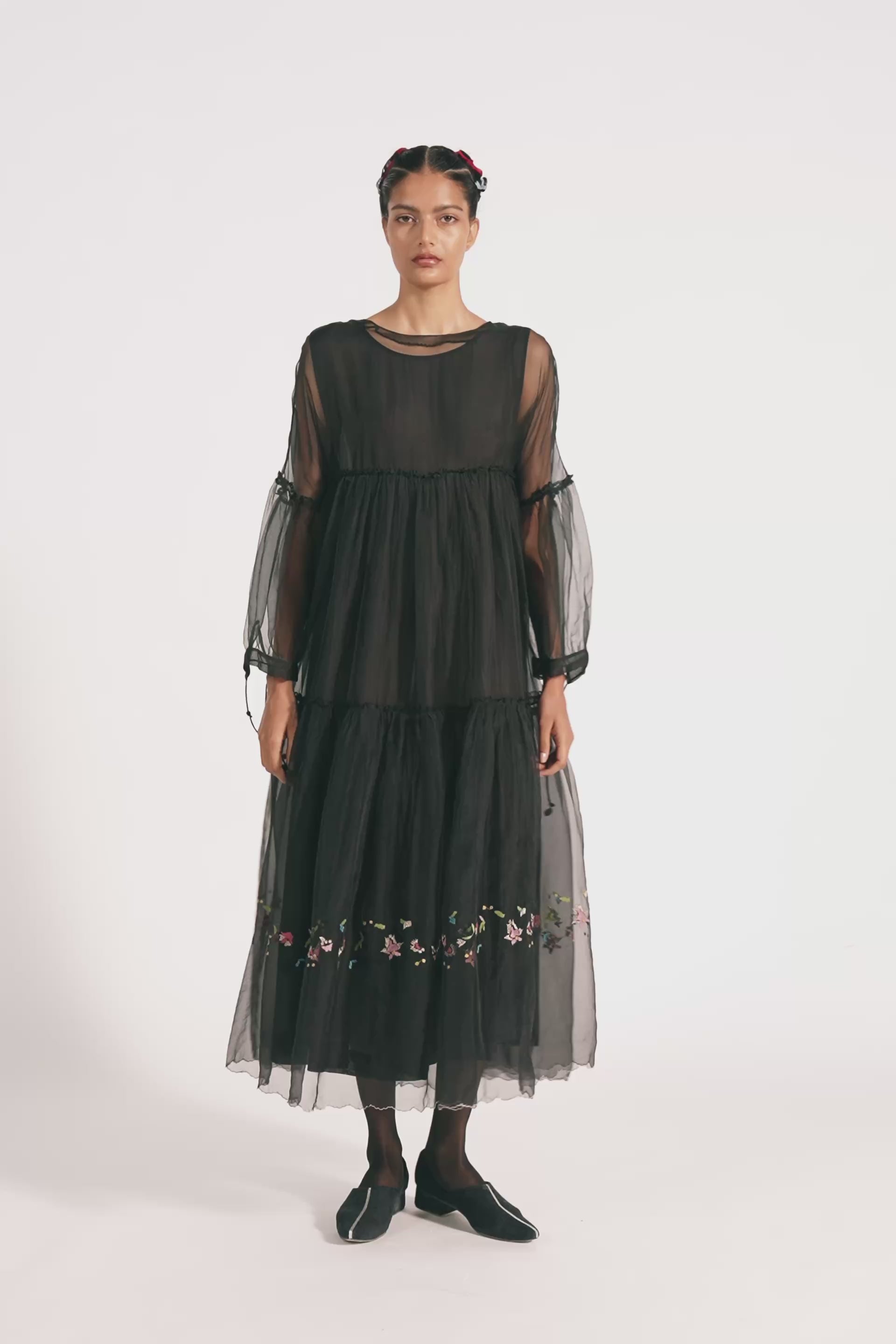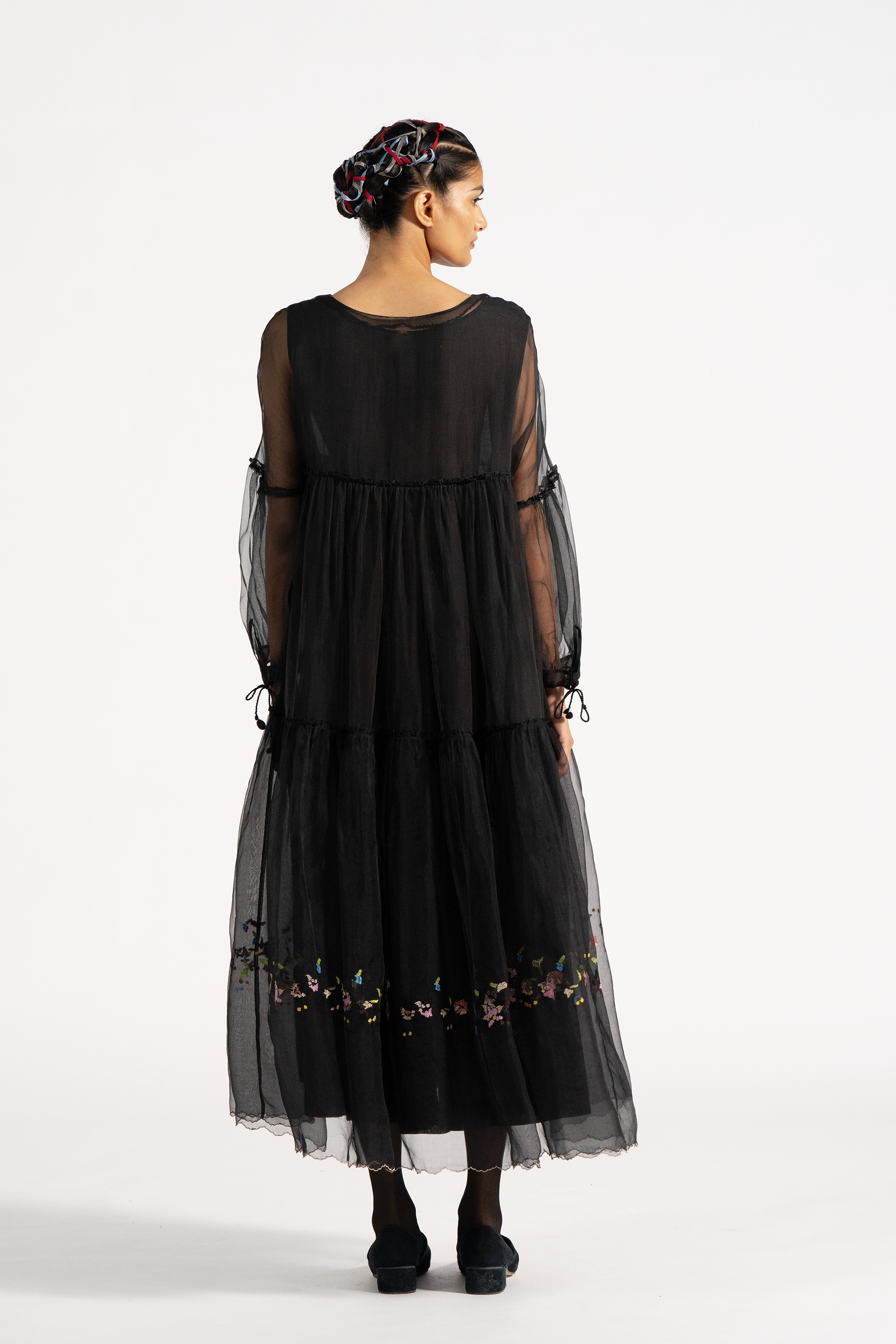 Relaxed fit maxi length tiered dress in 100% silk organza with multicolor floral embroidery. Comes with complimentary cotton silk lining.