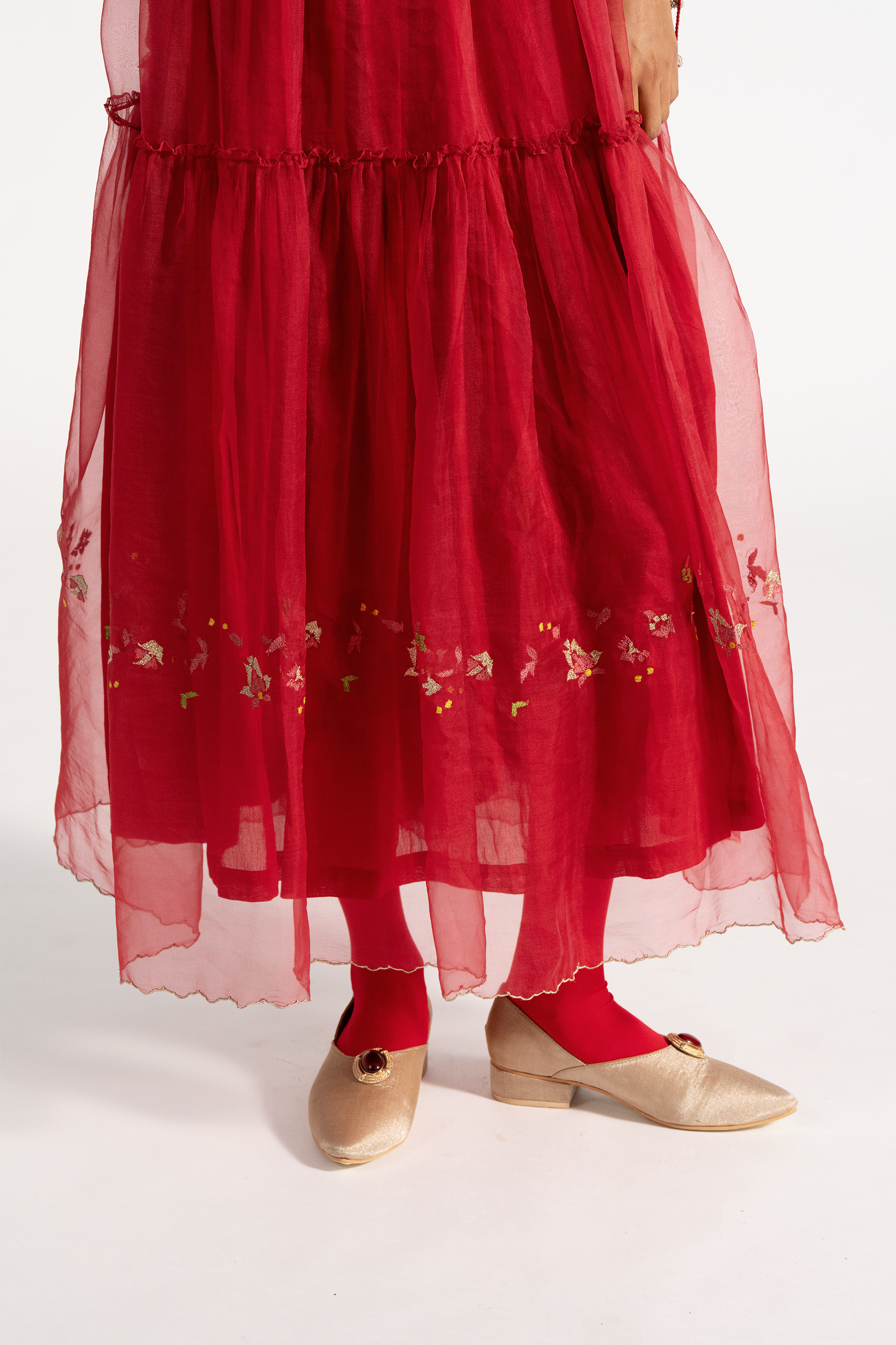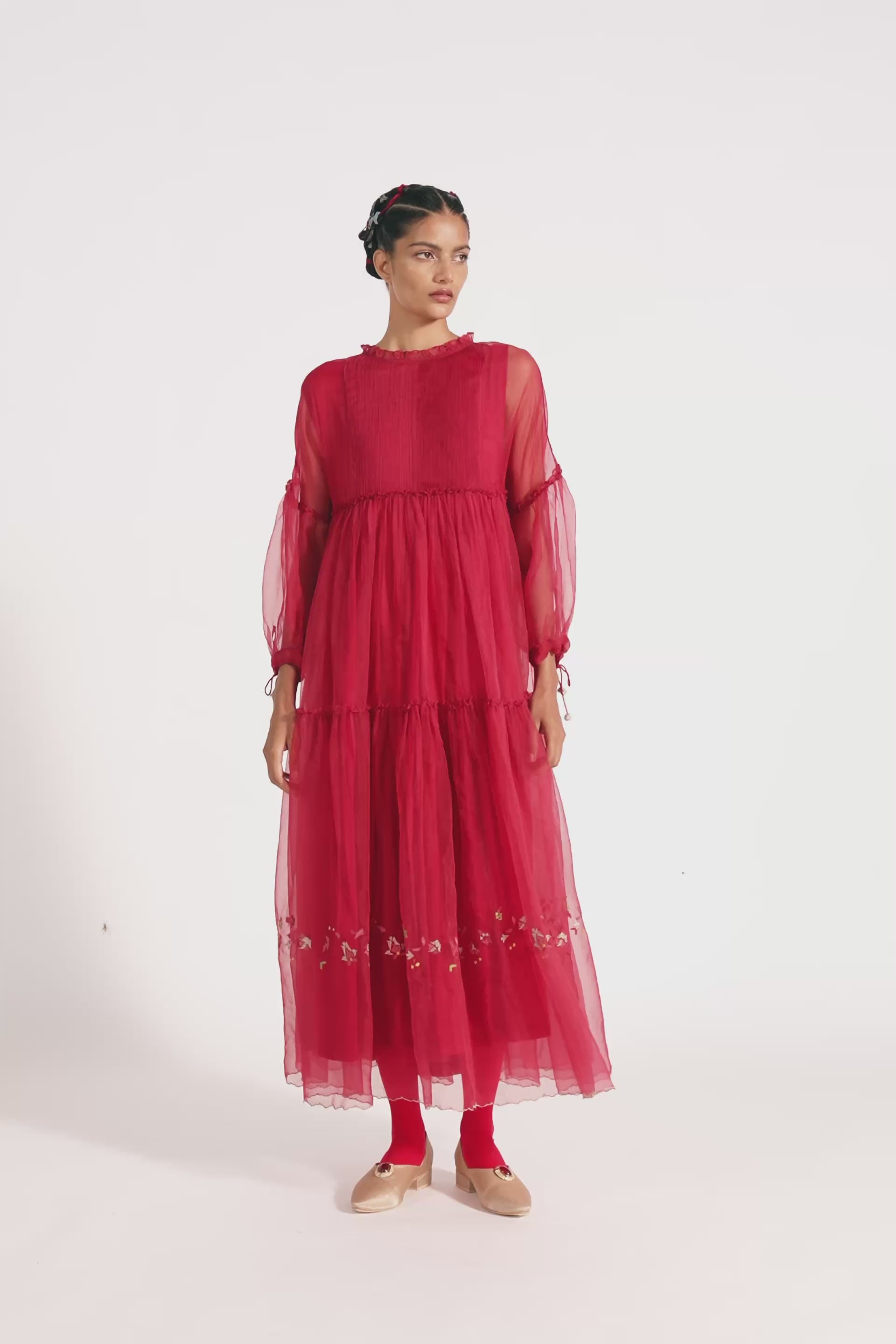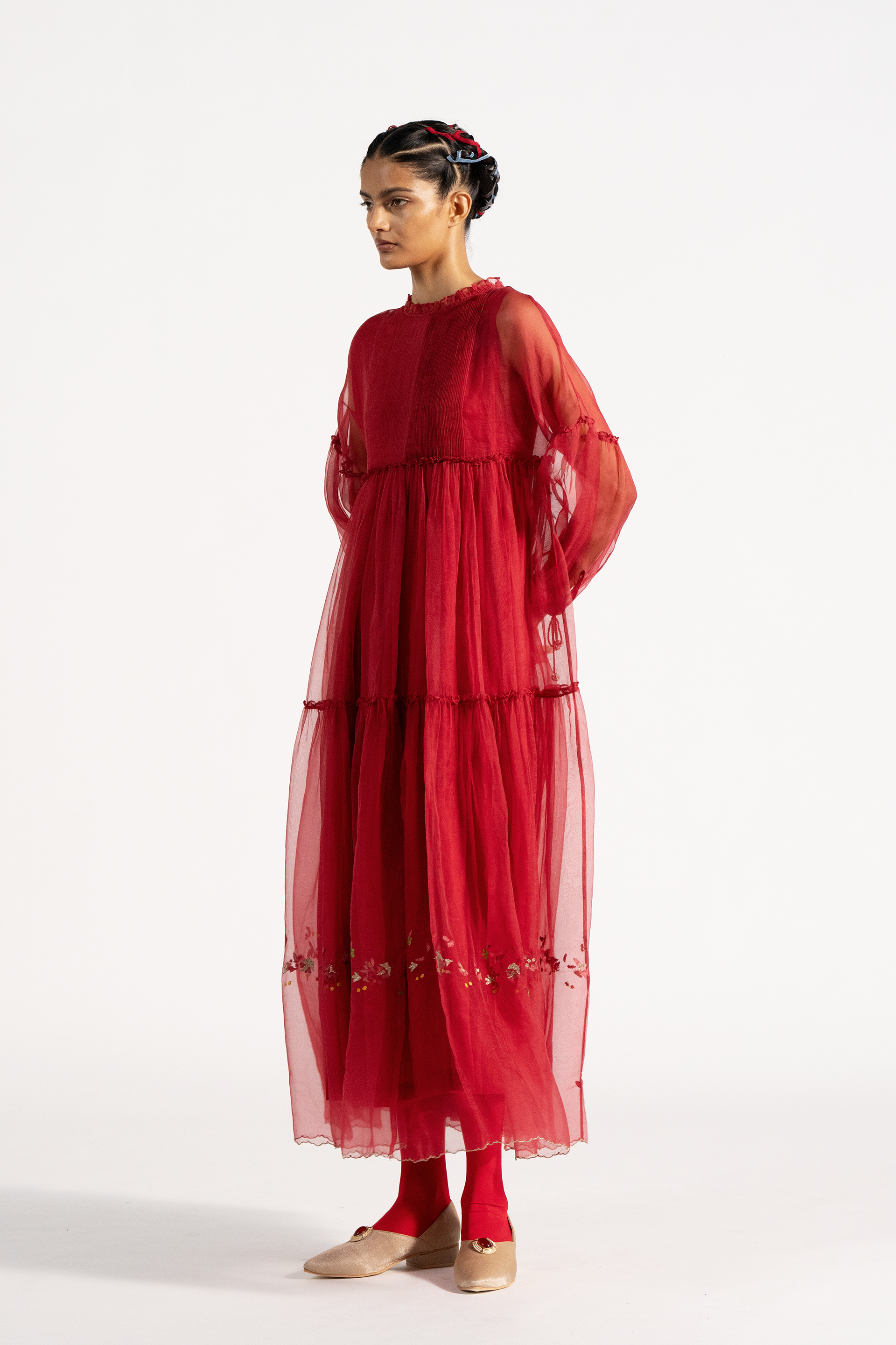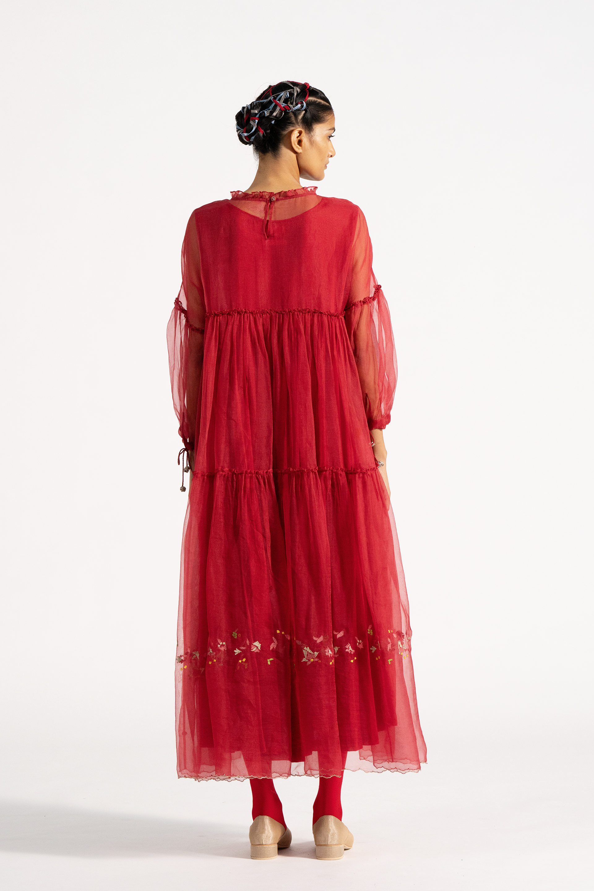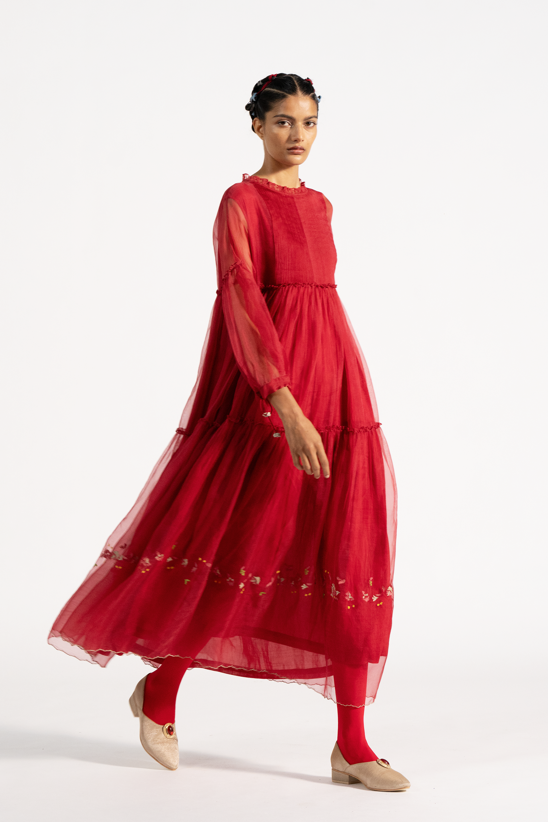 Relaxed fit maxi length tiered dress in 100% silk organza with multicolor floral embroidery. Comes with complimentary cotton silk lining.