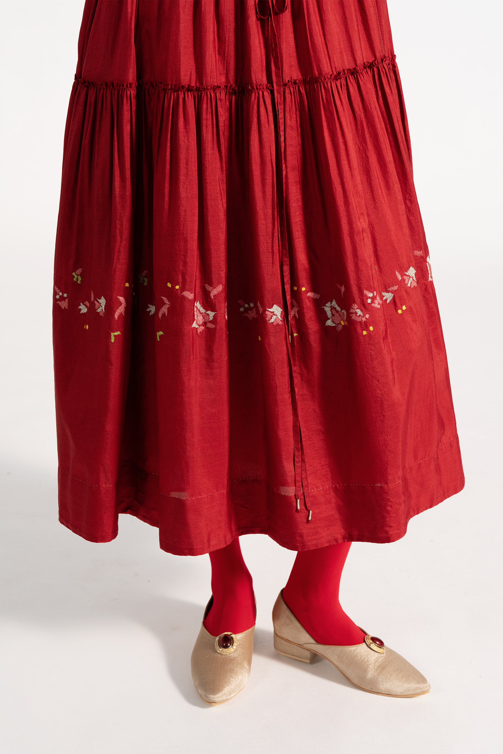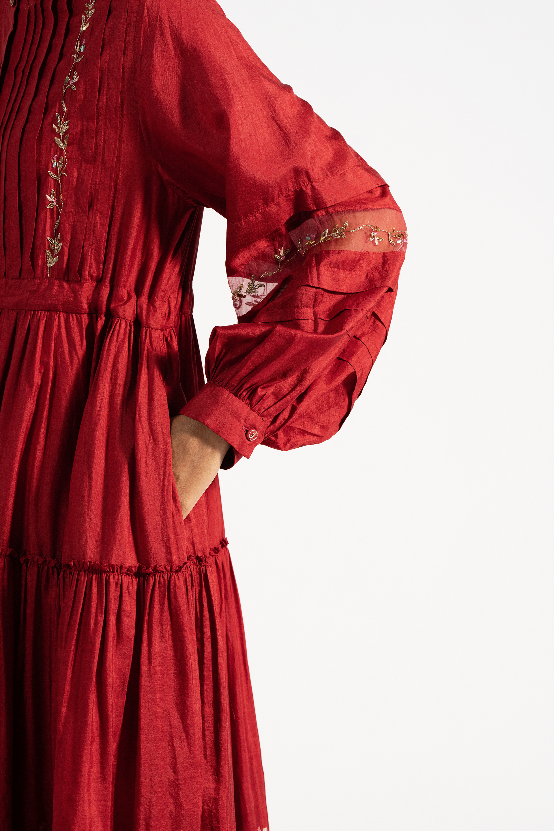 Round neck with tie up detail dress in silk blend with multicolor embroidery detail on sleeve, front and hem.