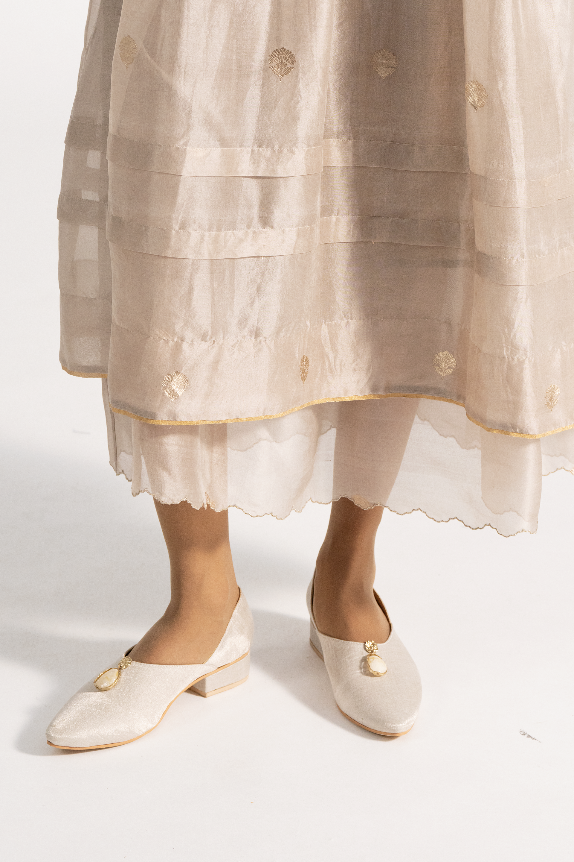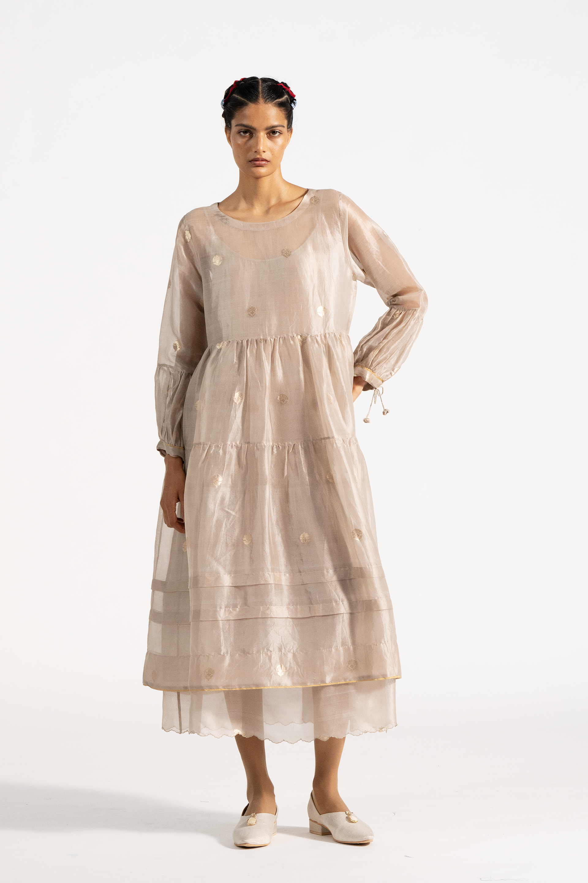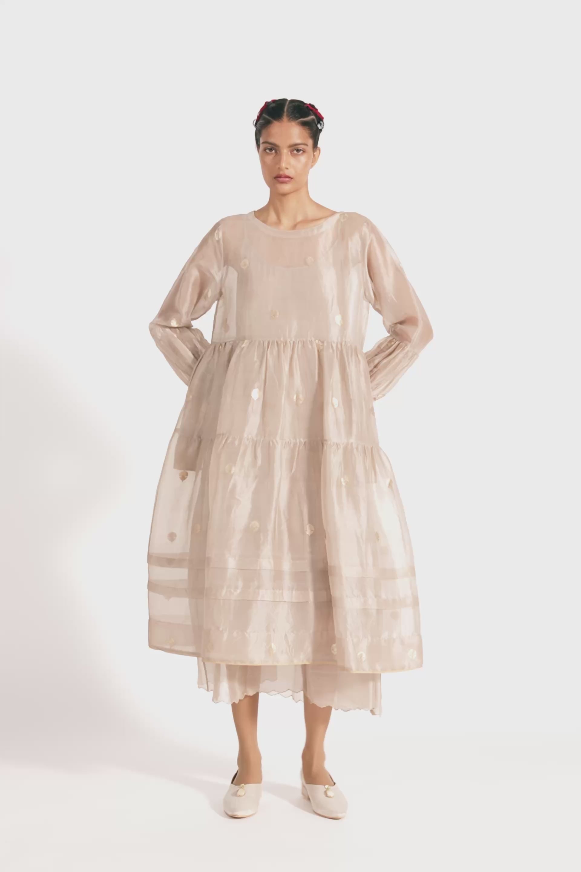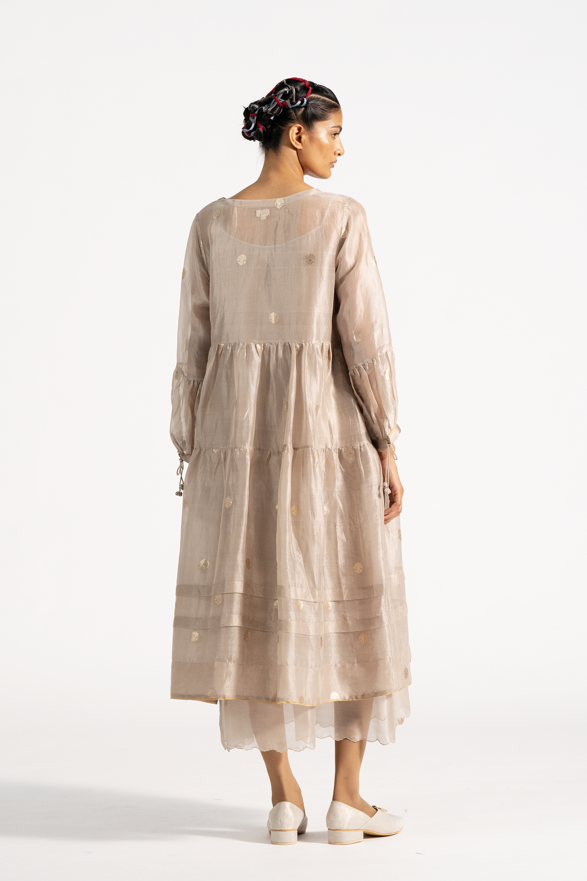 Relaxed fit round neck tiered dress in gold jacquard buta organza. Comes with a complimentary cotton silk lining.