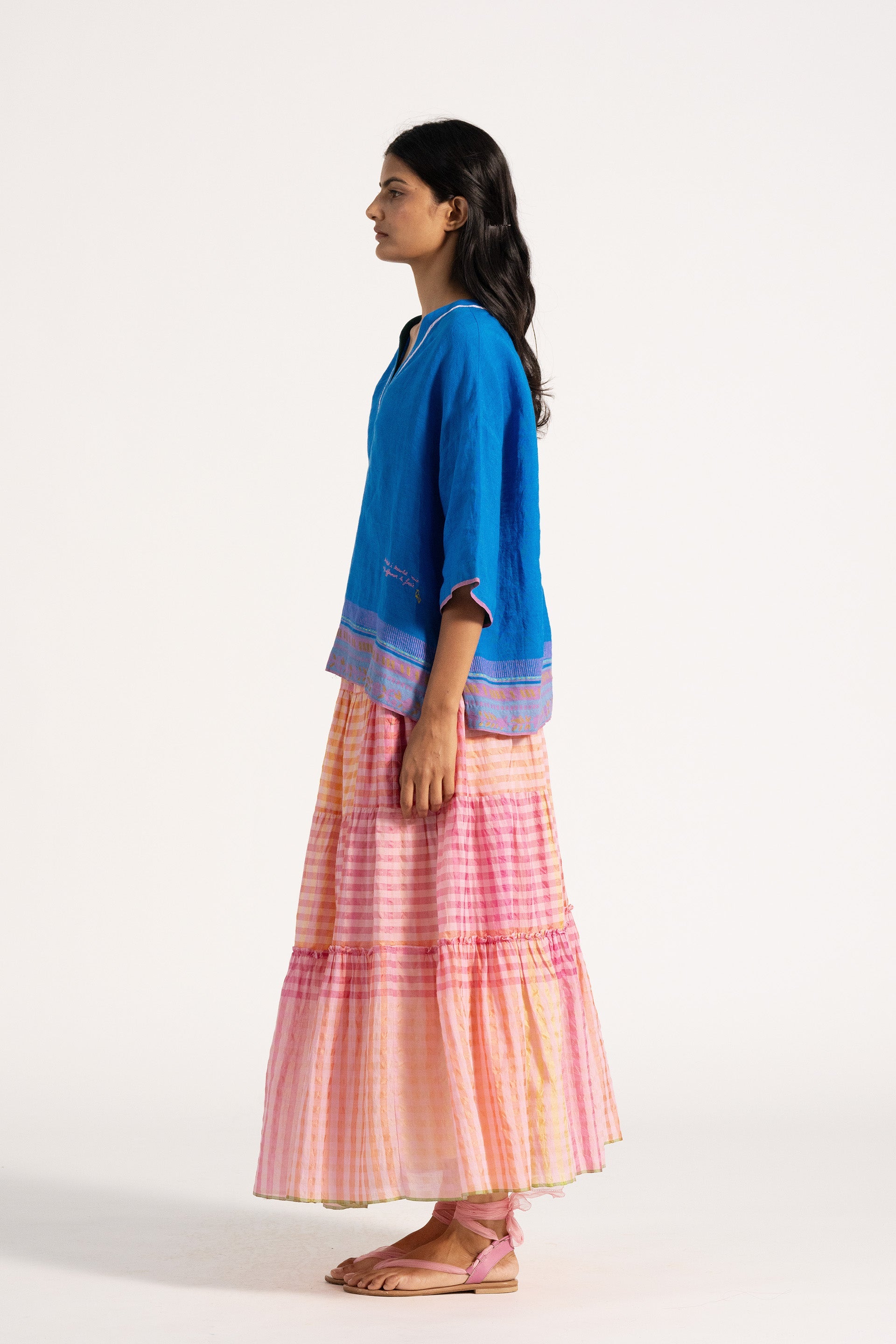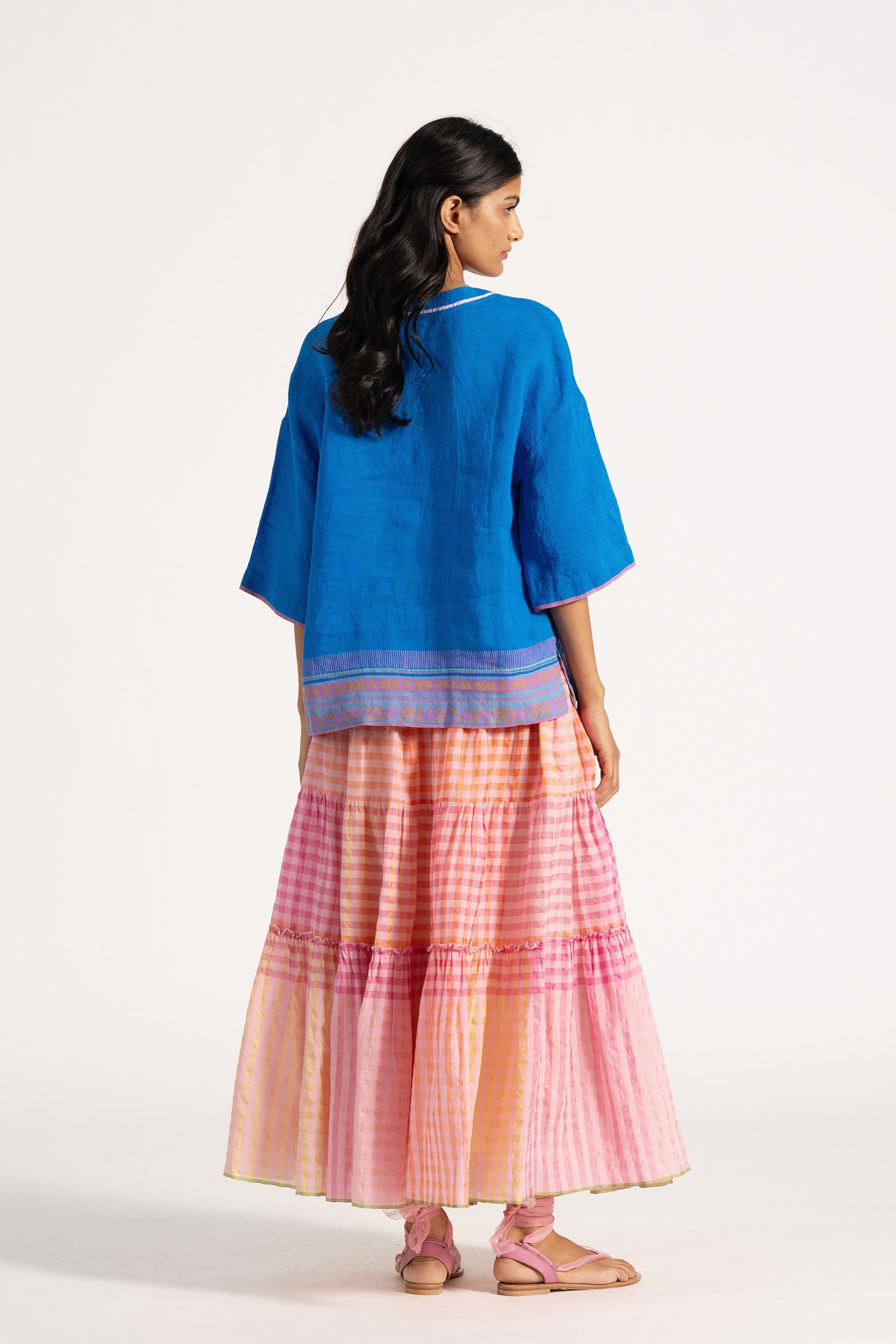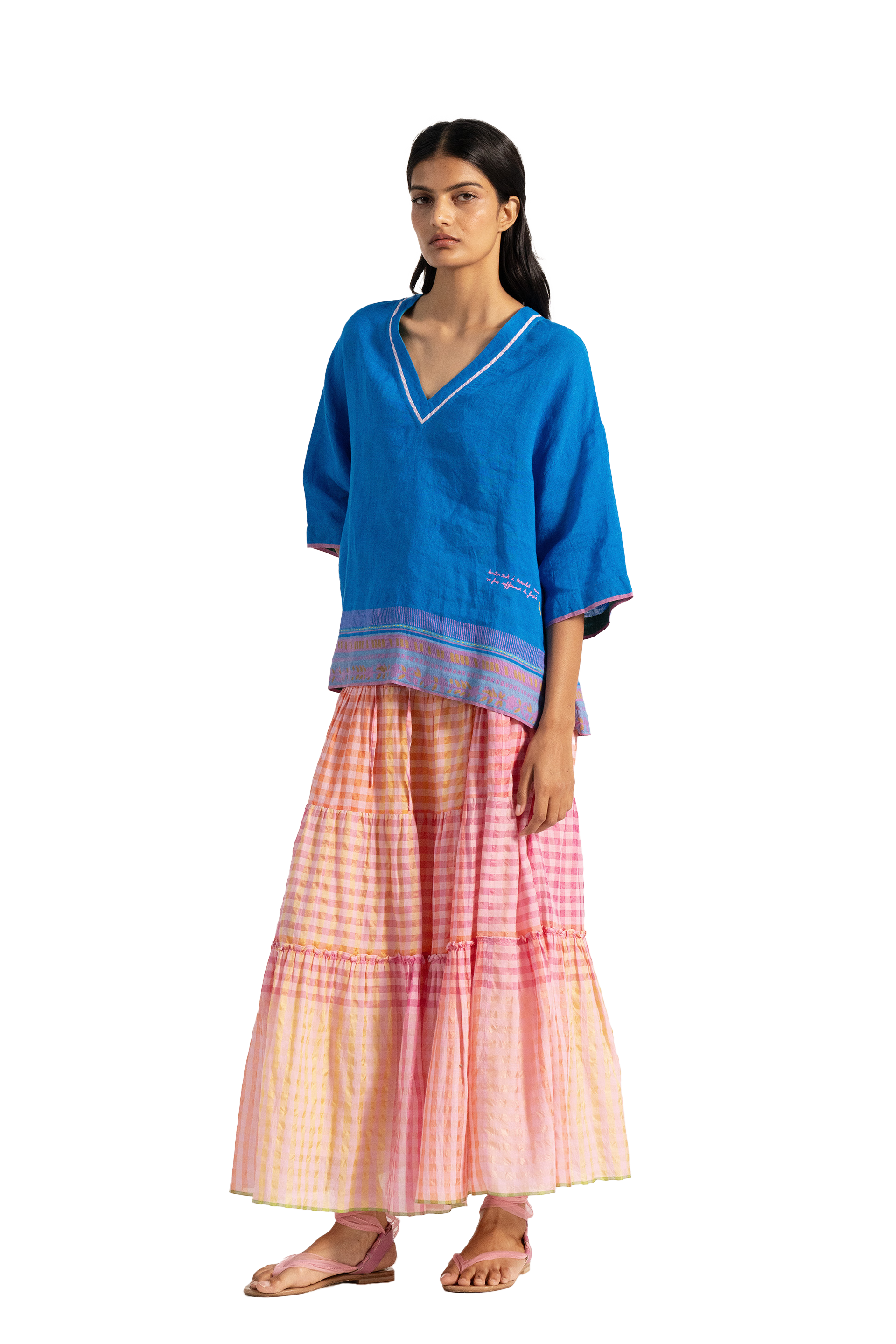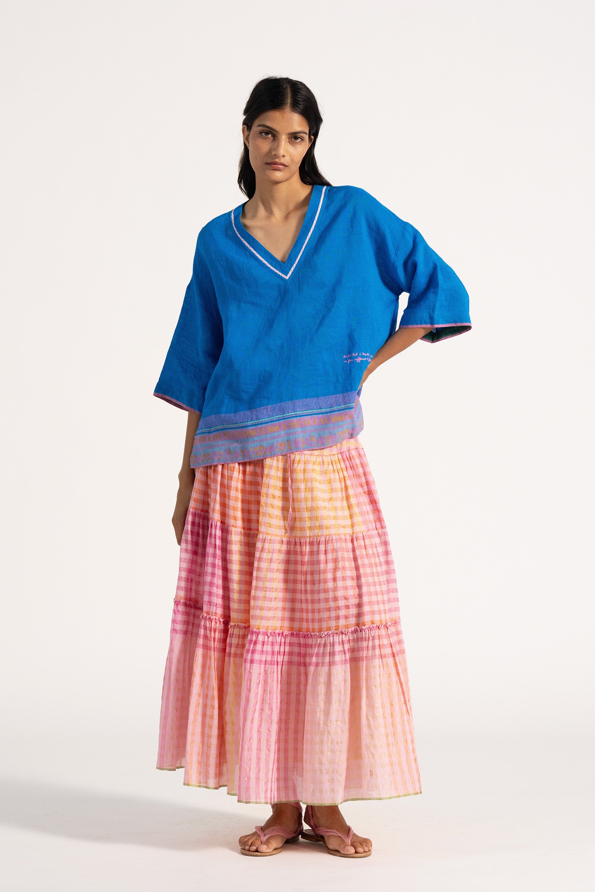 Basic v neckline relaxed fit top with 3/4 sleeve and contrast border and salvedge detail across the hem and sleeves. Constructed in solid with border 100% linen fabric.