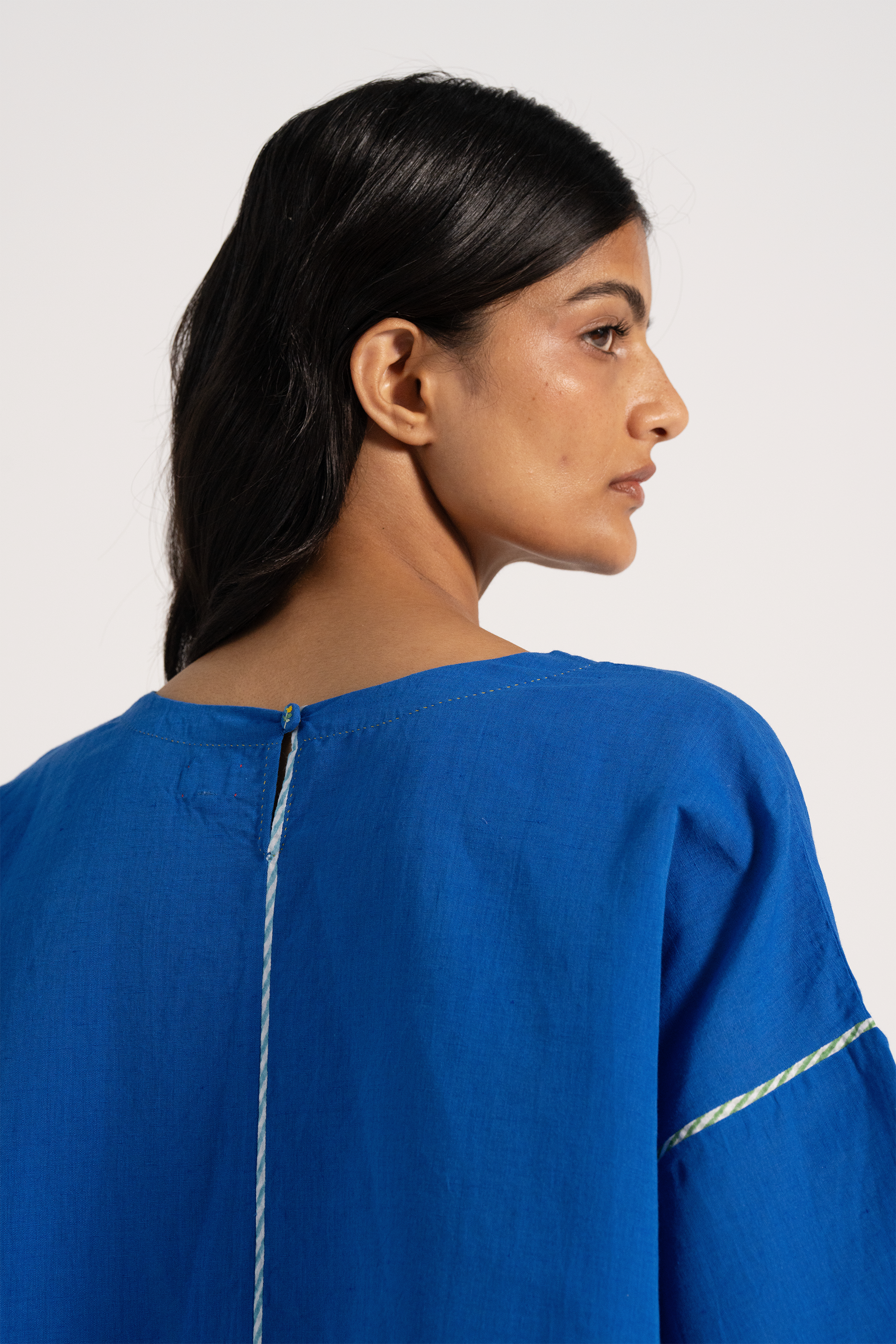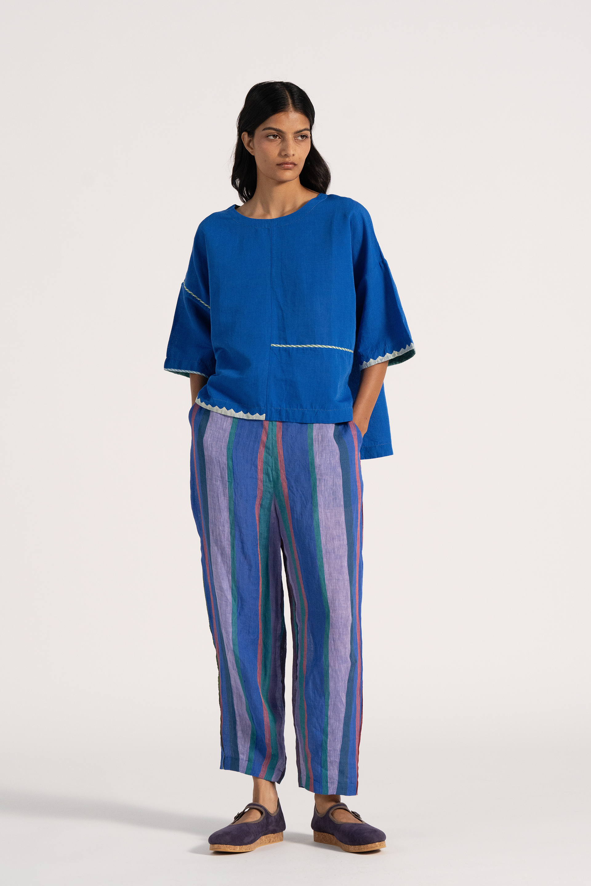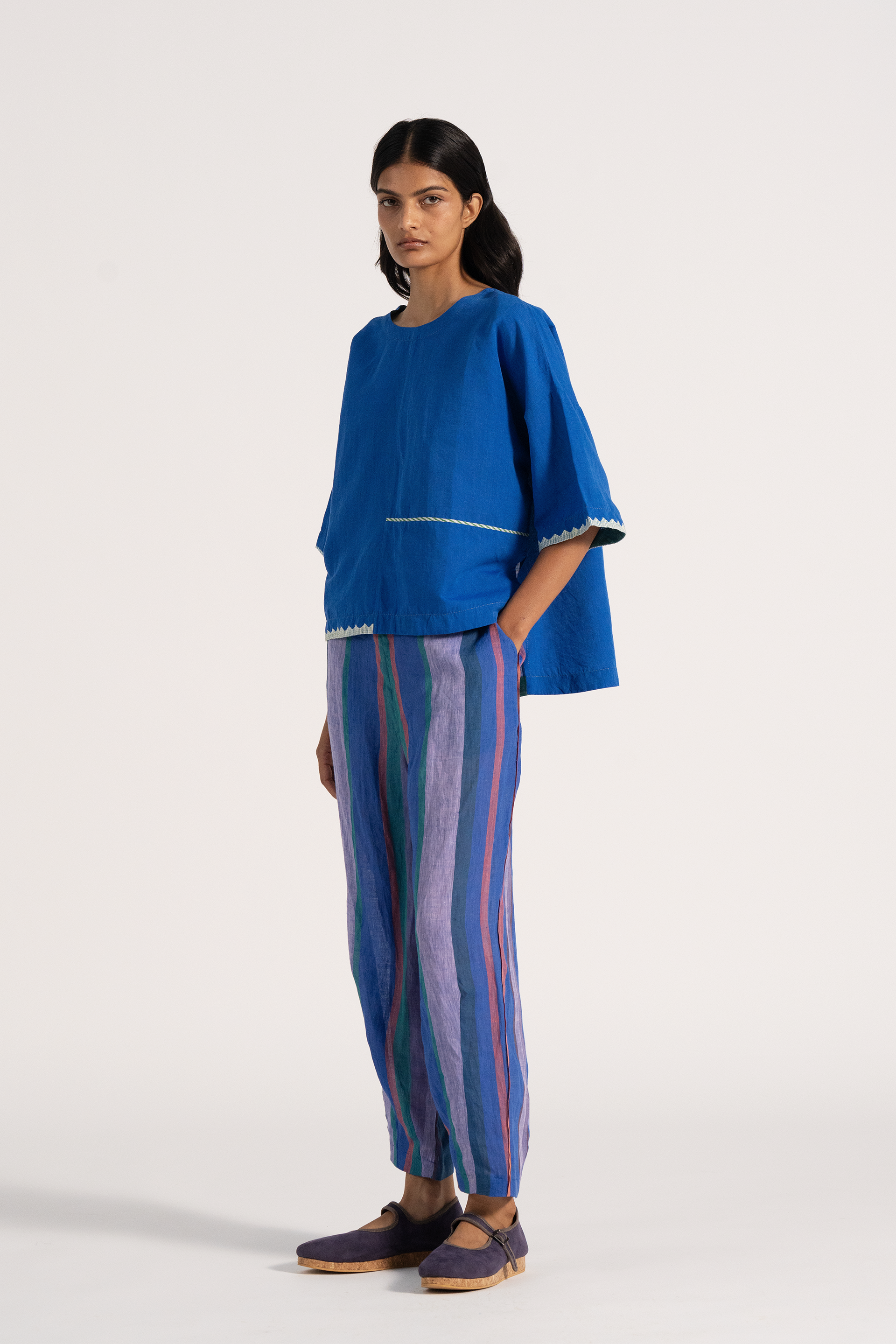 Relaxed fit boat neck top in 100% linen fabric. With drop shoulder detail and handblock print striper piping insert and applique detail.