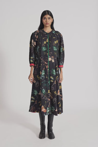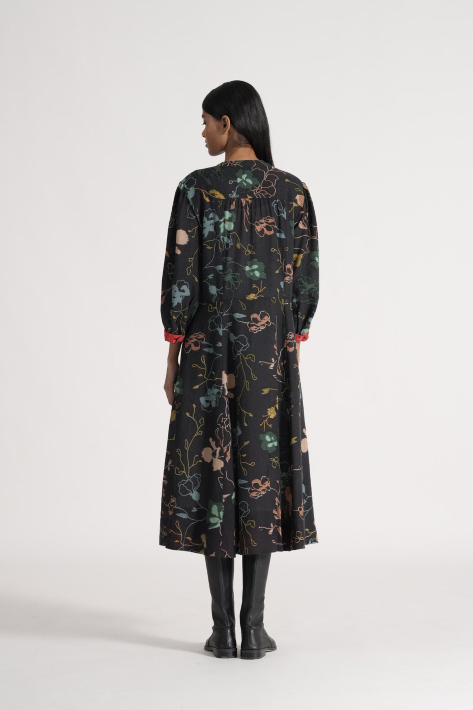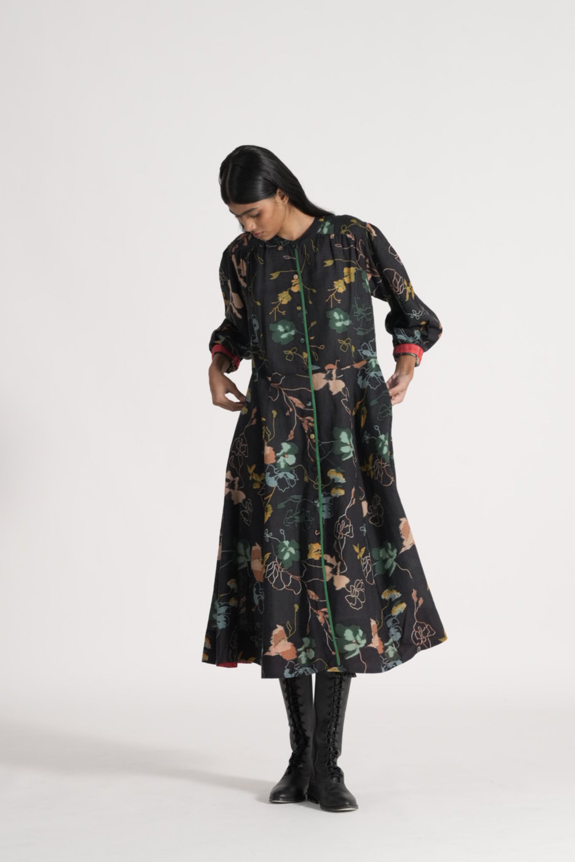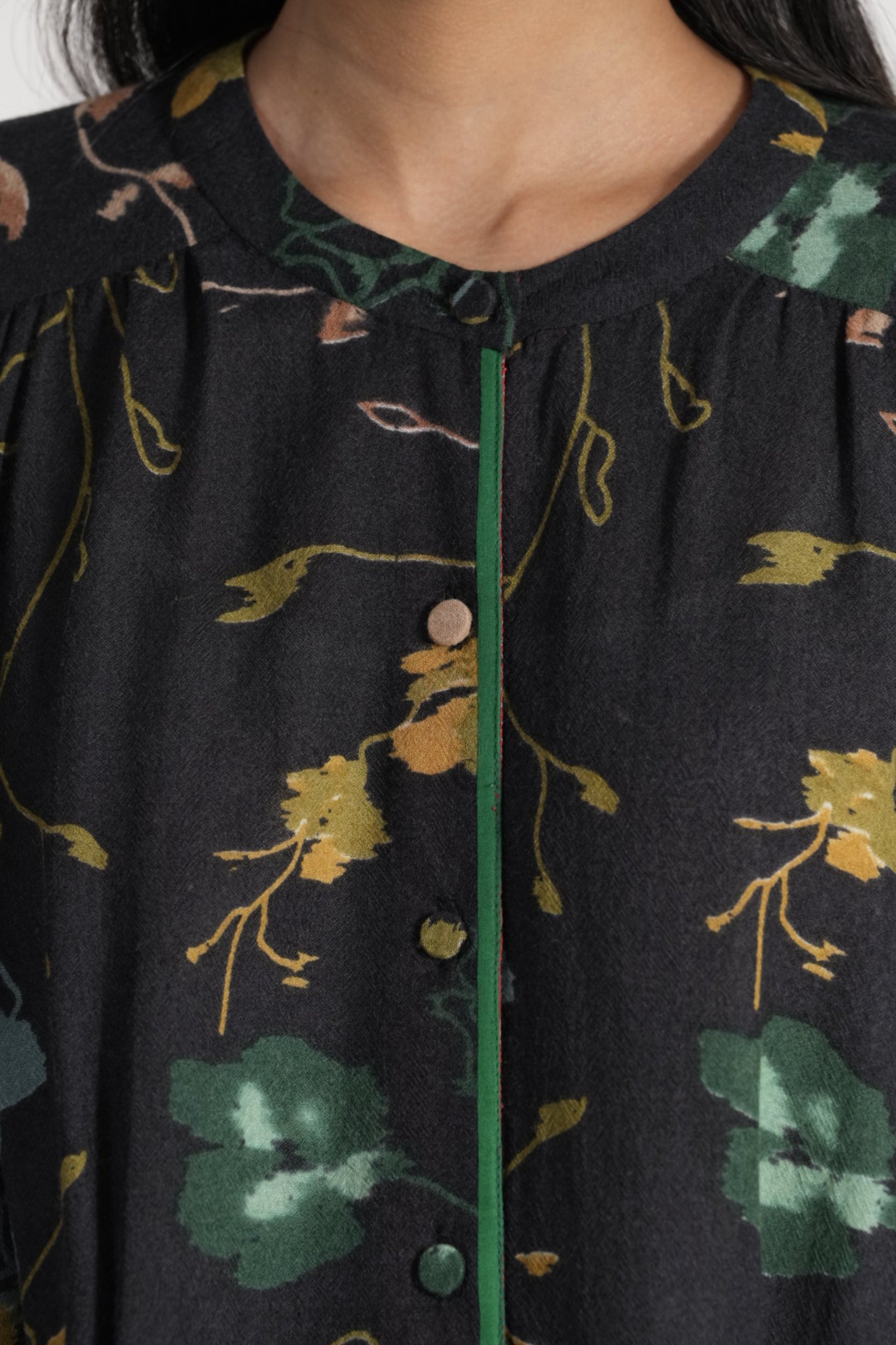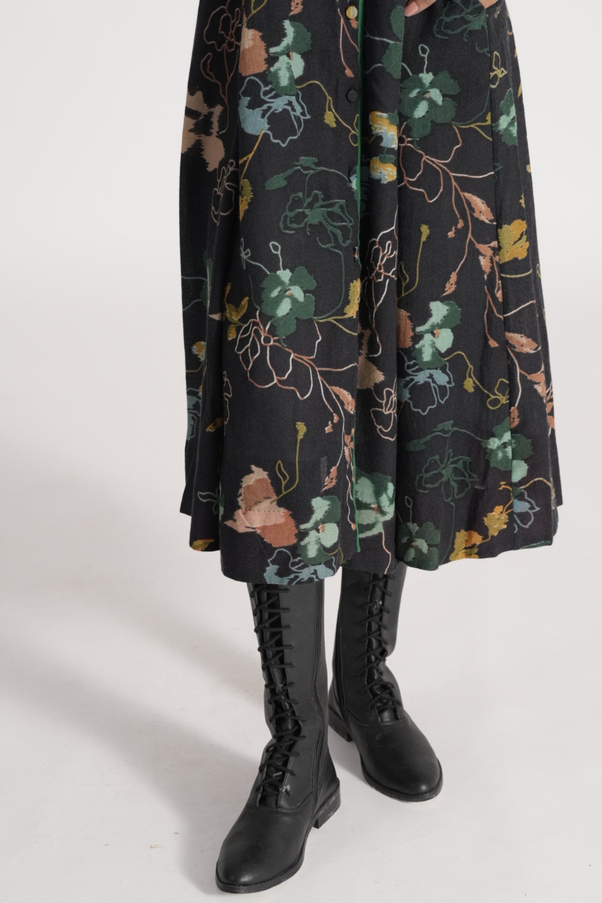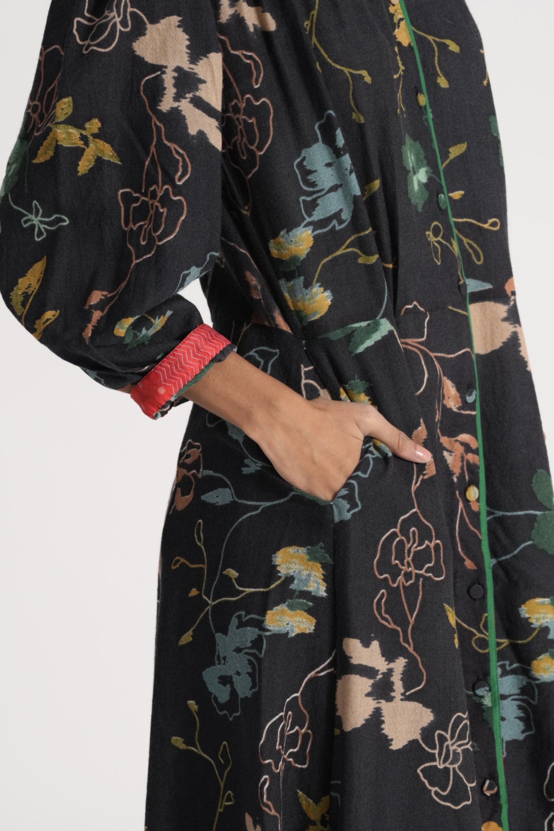 Button Down Puff Sleeved Midi Dress With All Over Floral Print In 100% Merino Wool.
