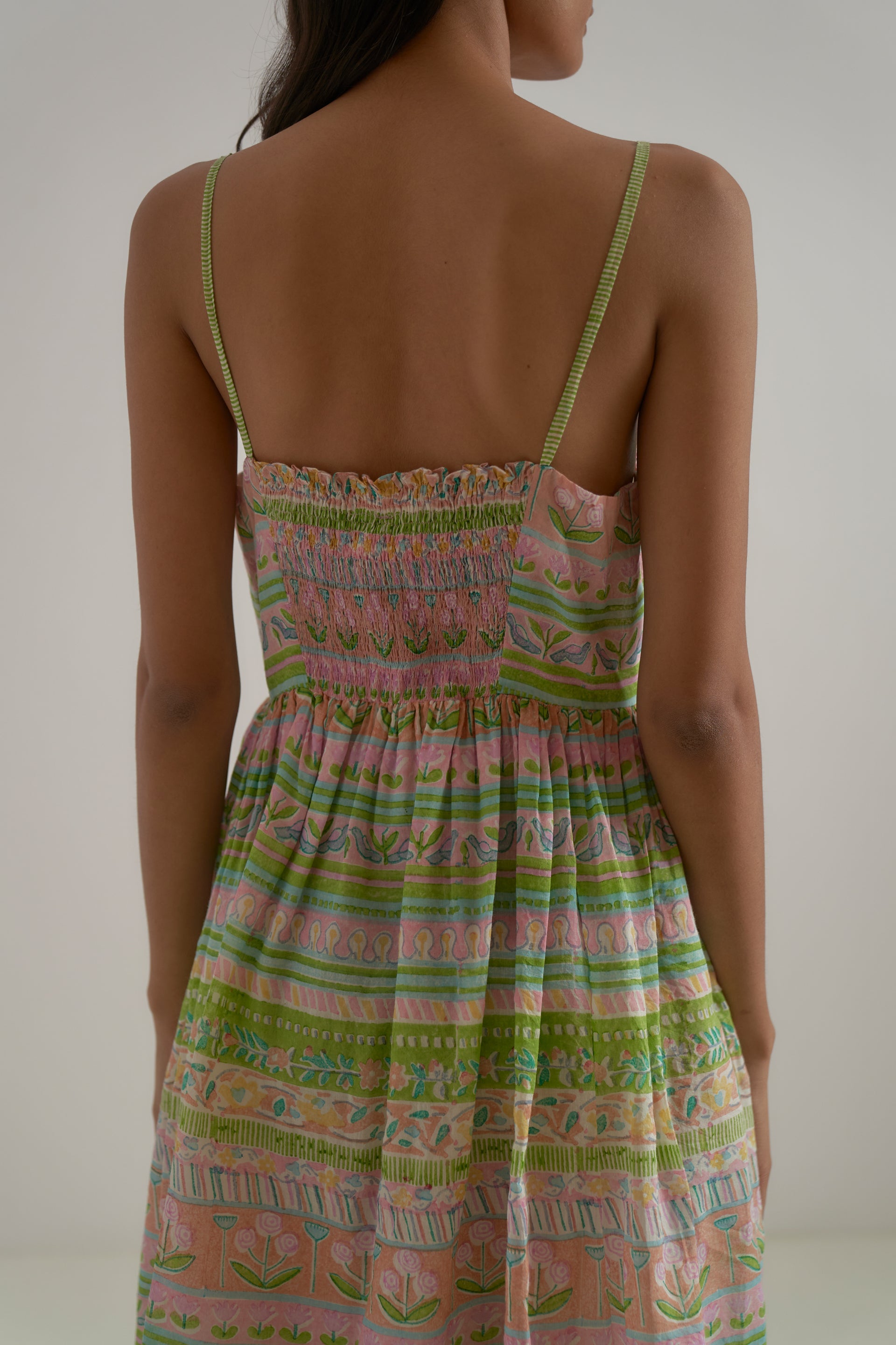 A midi-length sleeveless dress with spaghetti straps, featuring an elasticated back detail for a comfortable fit. Crafted from a cotton-silk blend fabric, this dress showcases a vibrant multicolor allover panel handblock print. it also comes with an attached handblock printed lining.