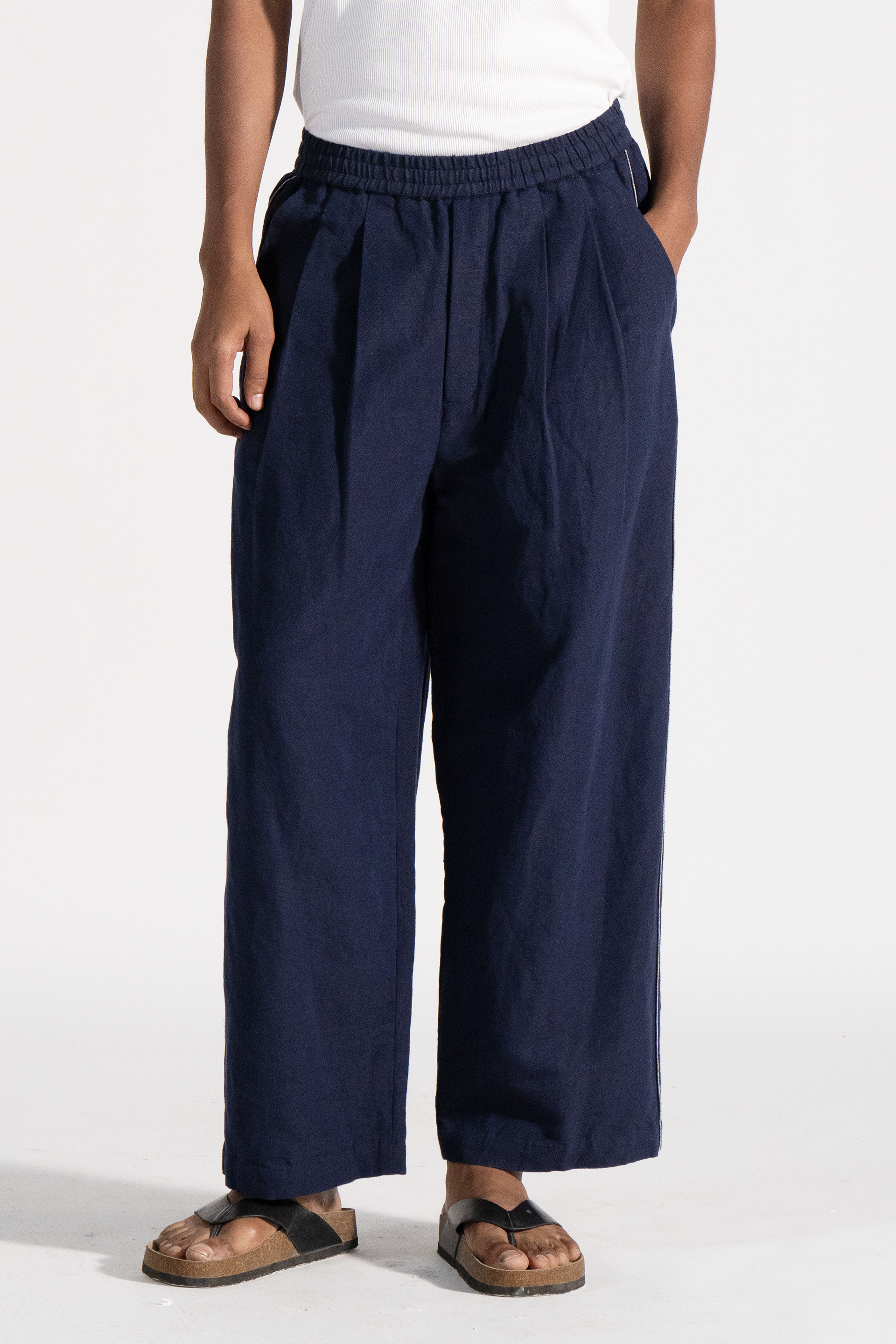 Flare trouser with contrast selvedge detail on side seam in solid cotton linen fabric.