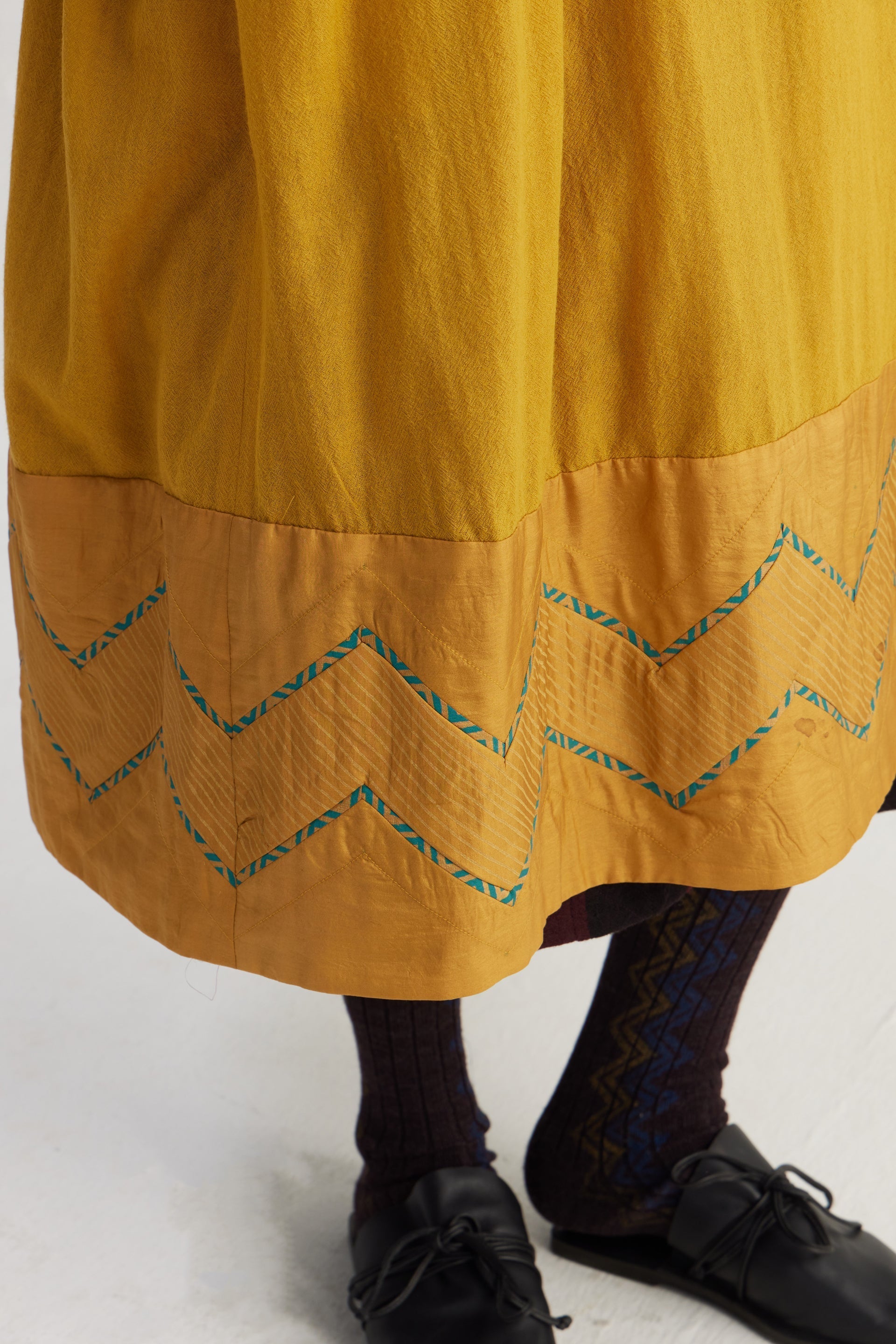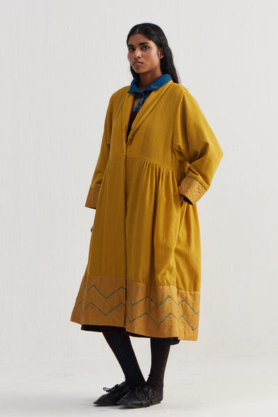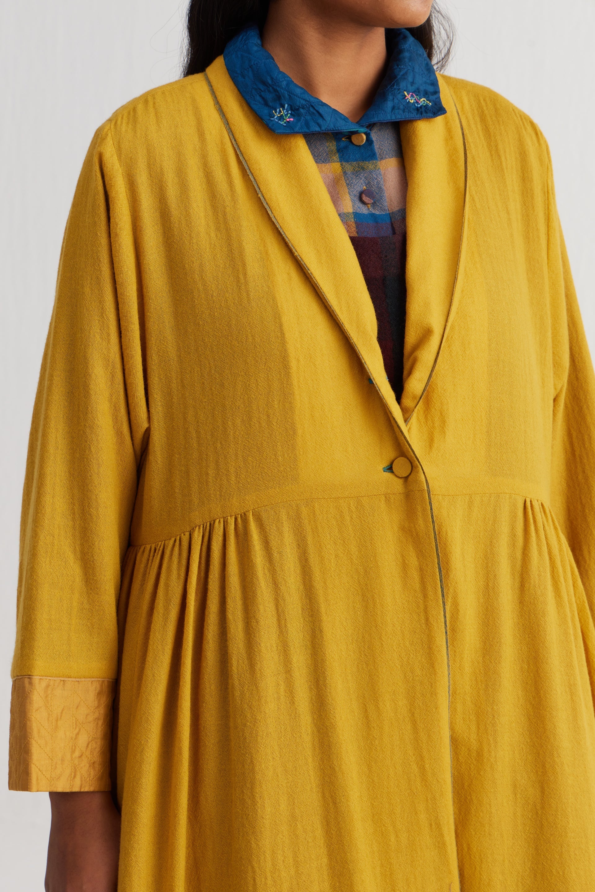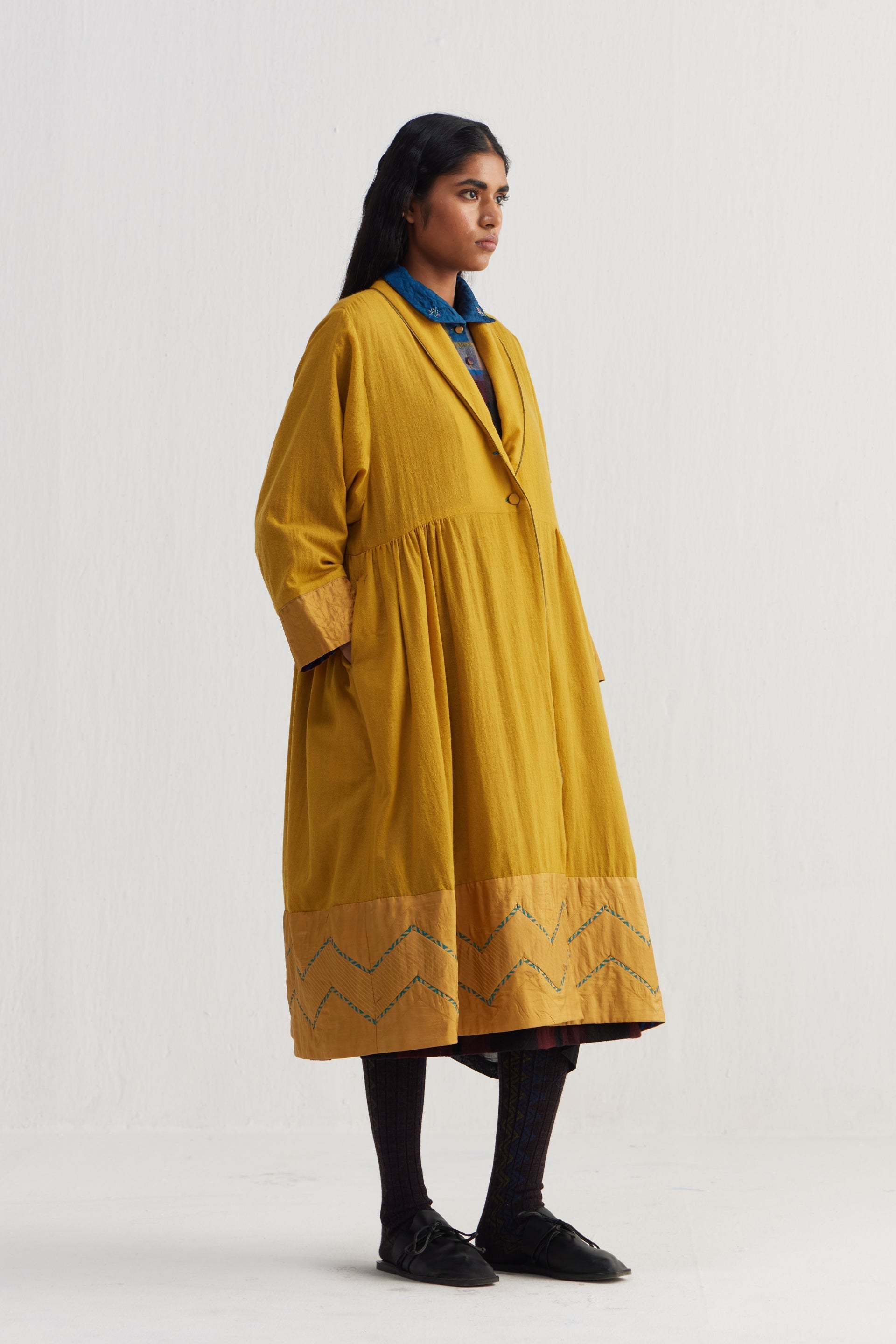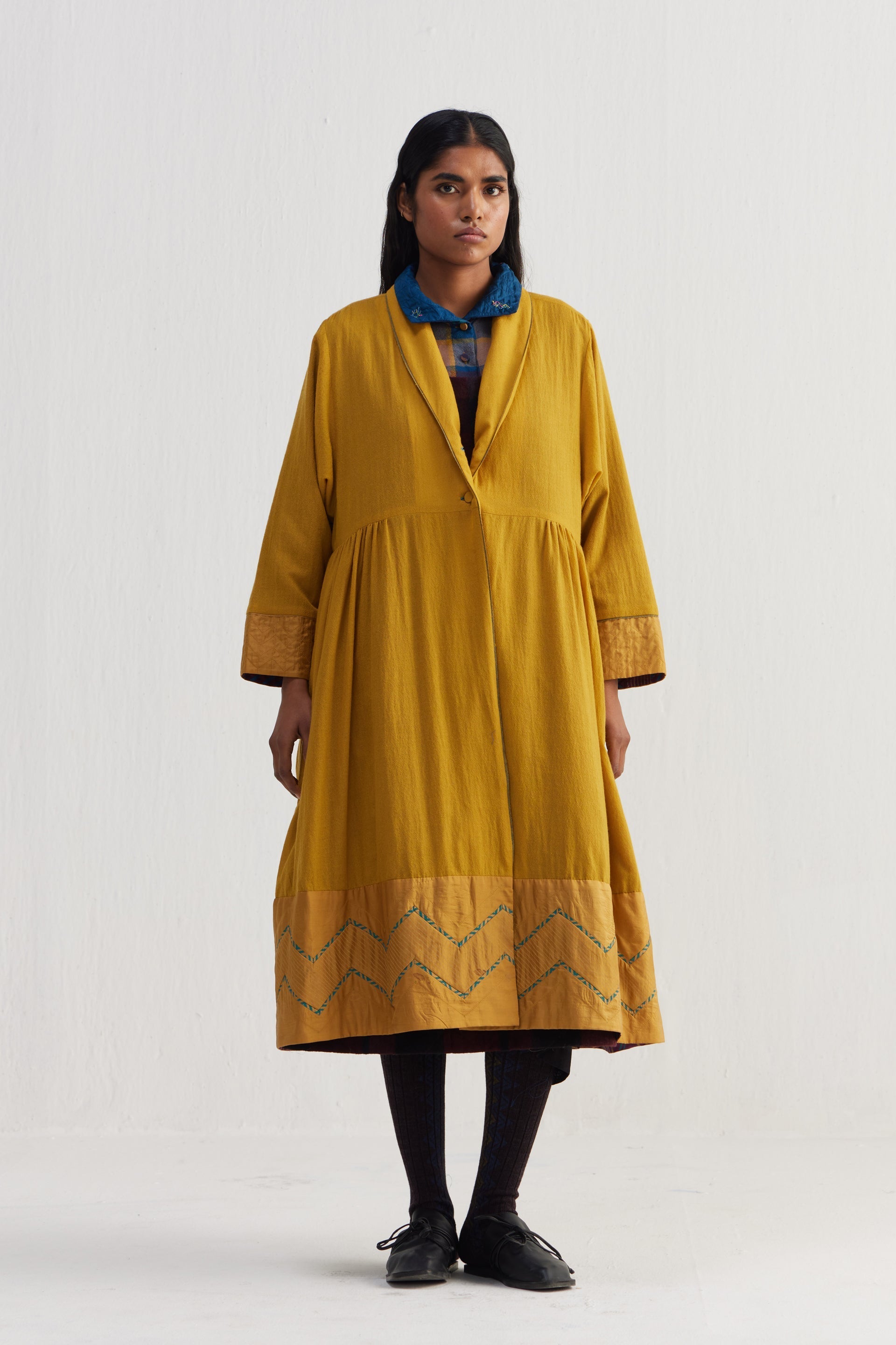 Patchwork relaxed fit shawl collar long jacket. Constructed in solid 100% wool and solid quilted 100% silk fabric. Finished with contrast collage handblock print 100% silk lining and contrast chevron 100% silk piping insert on the seams.