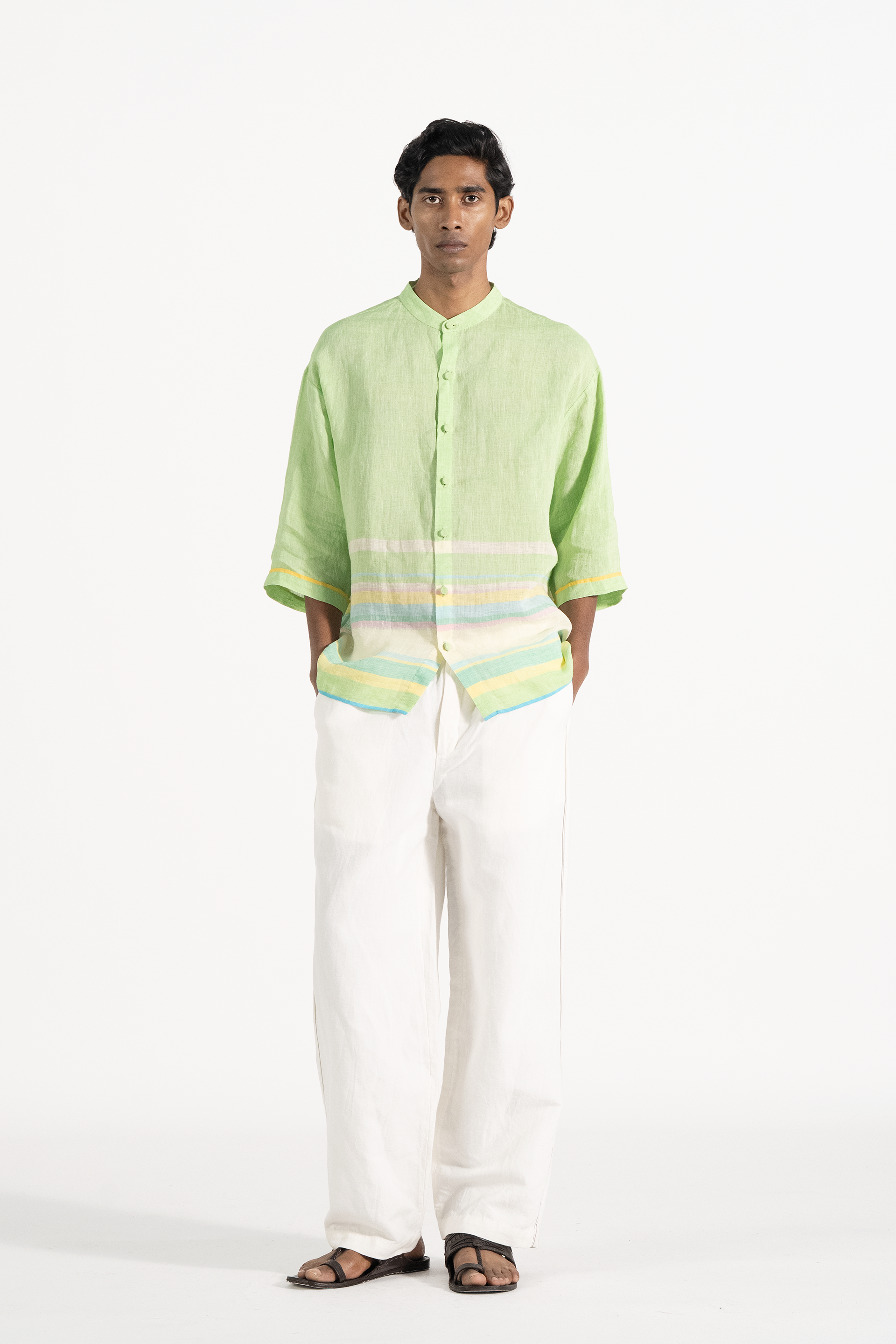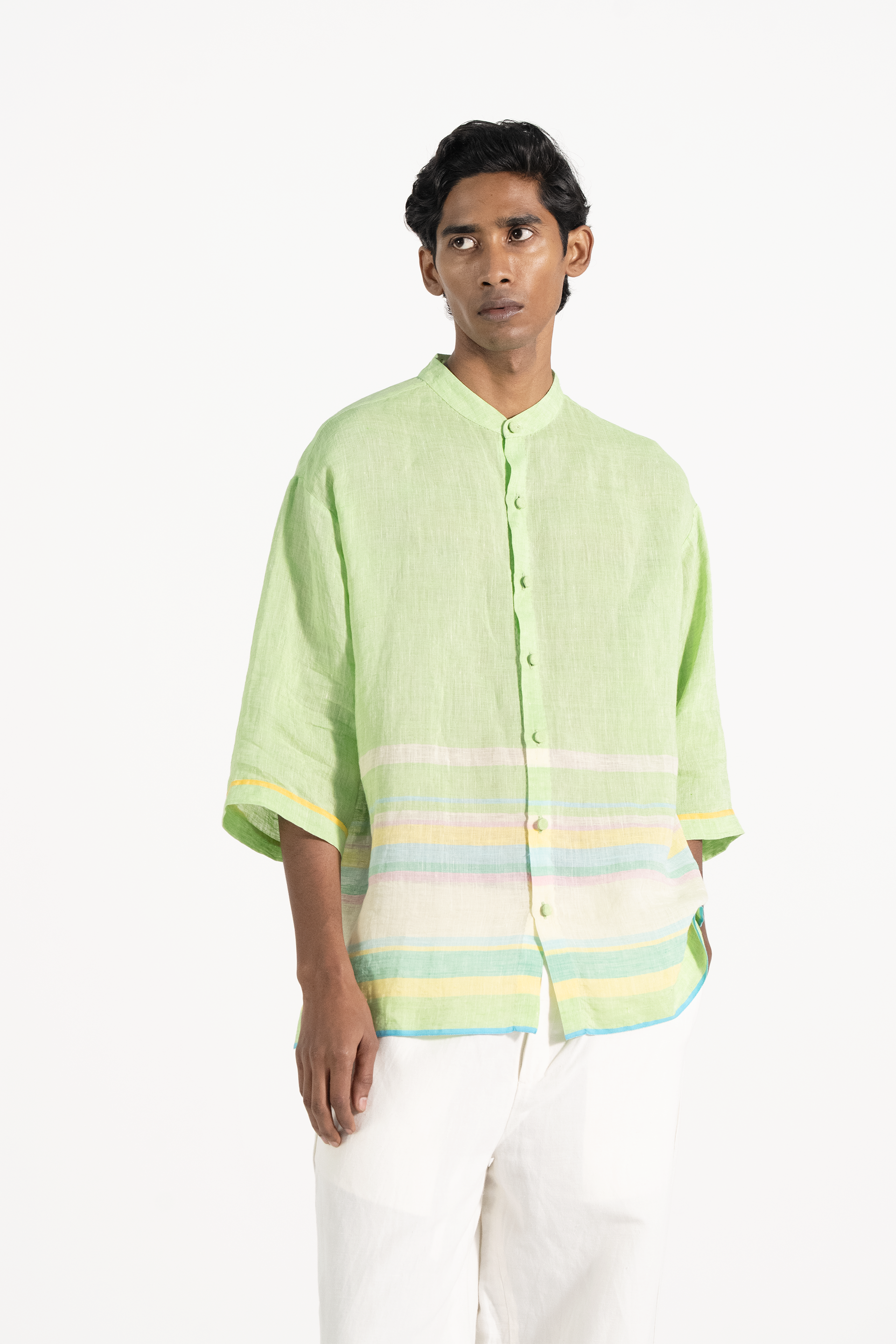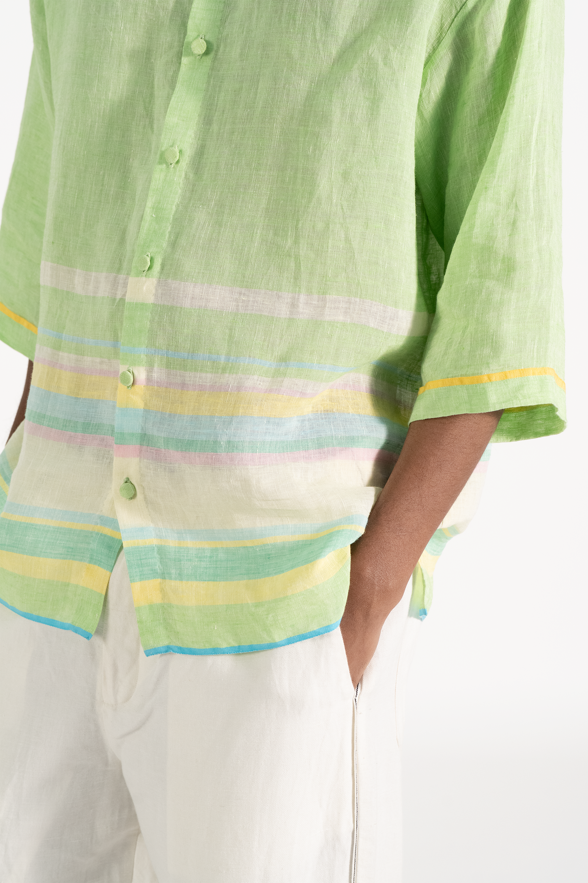 Oversized half sleeve shirt in handwoven solid linen with multicolor striped border.
