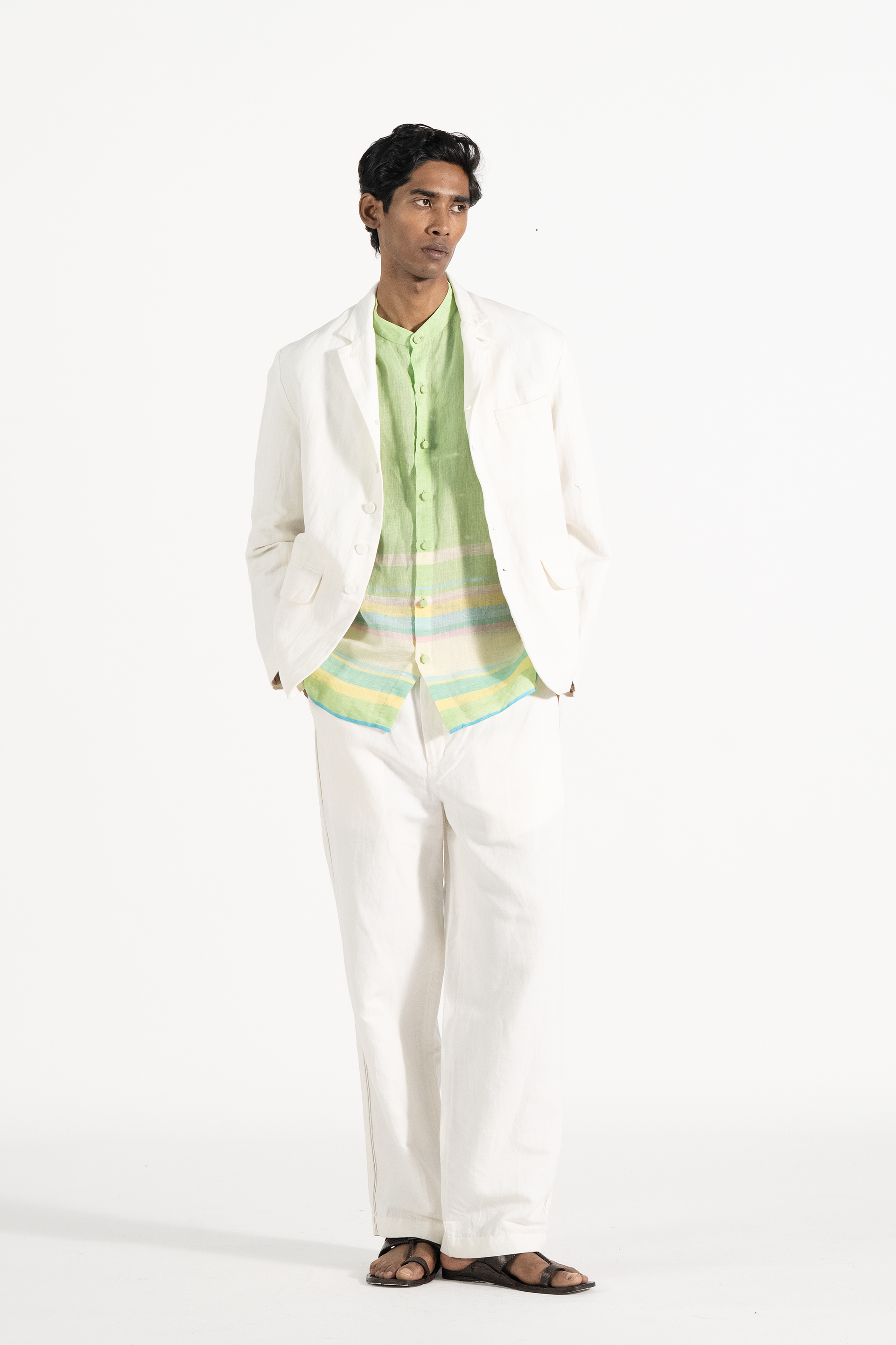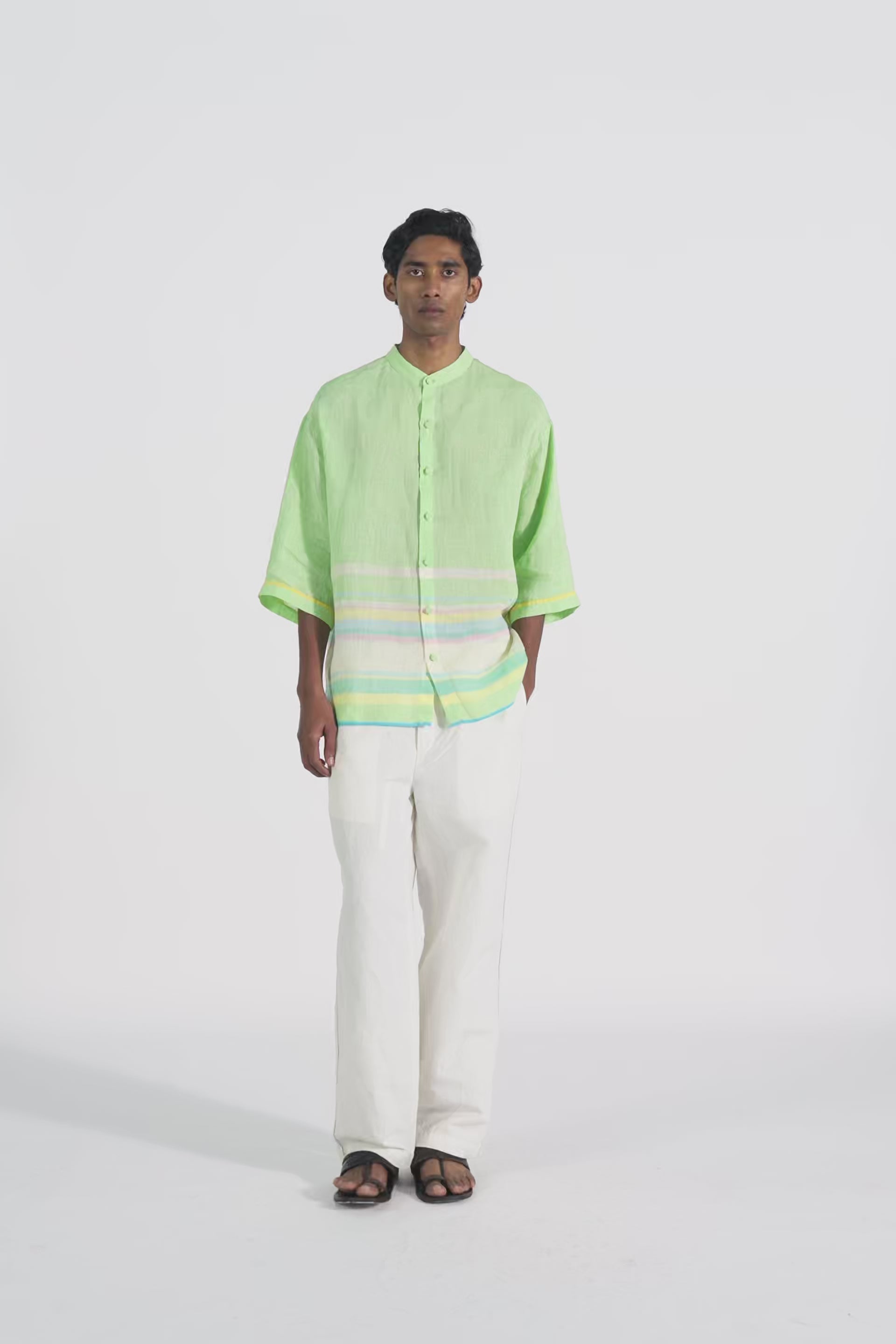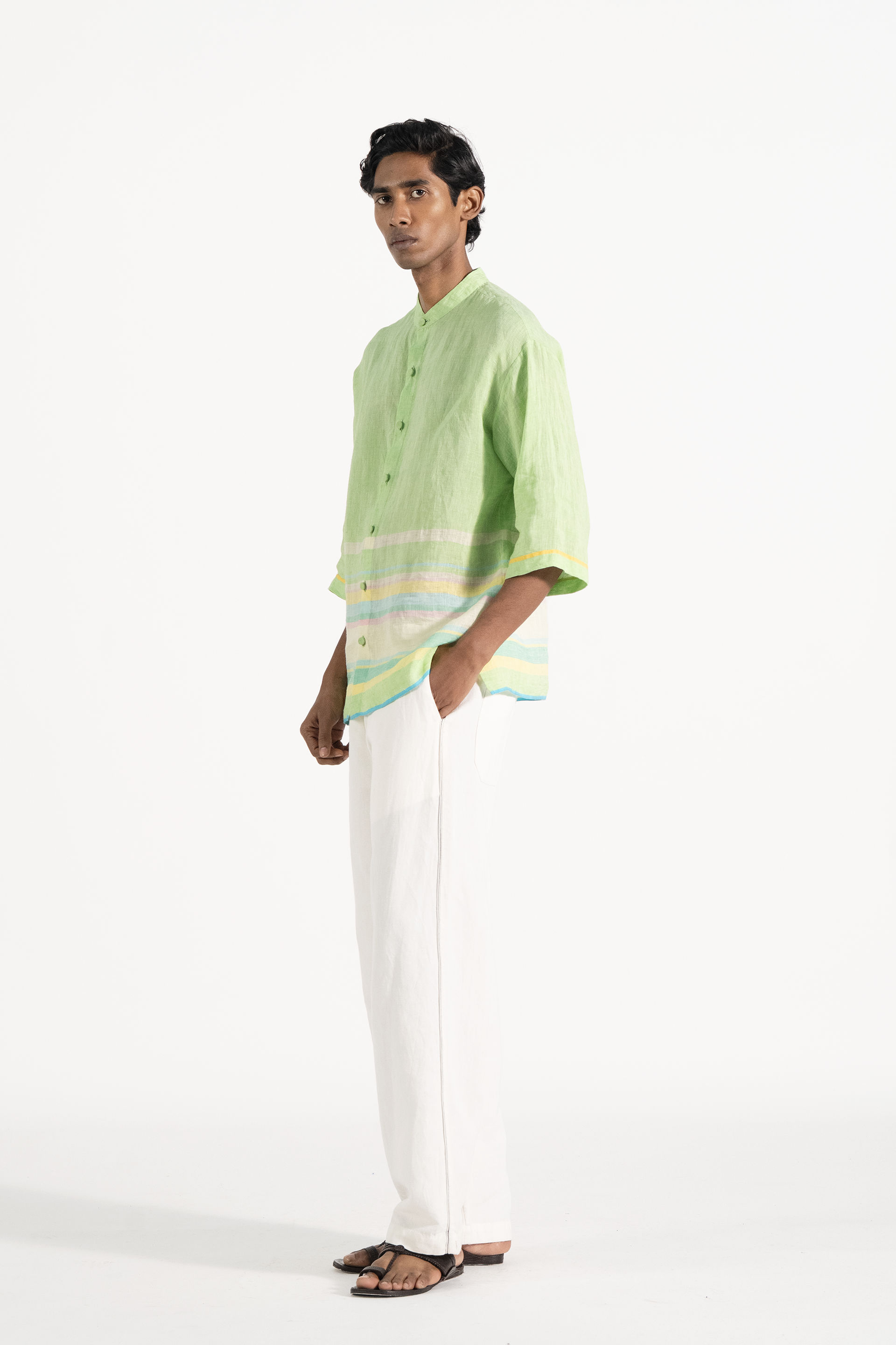 Oversized half sleeve shirt in handwoven solid linen with multicolor striped border.