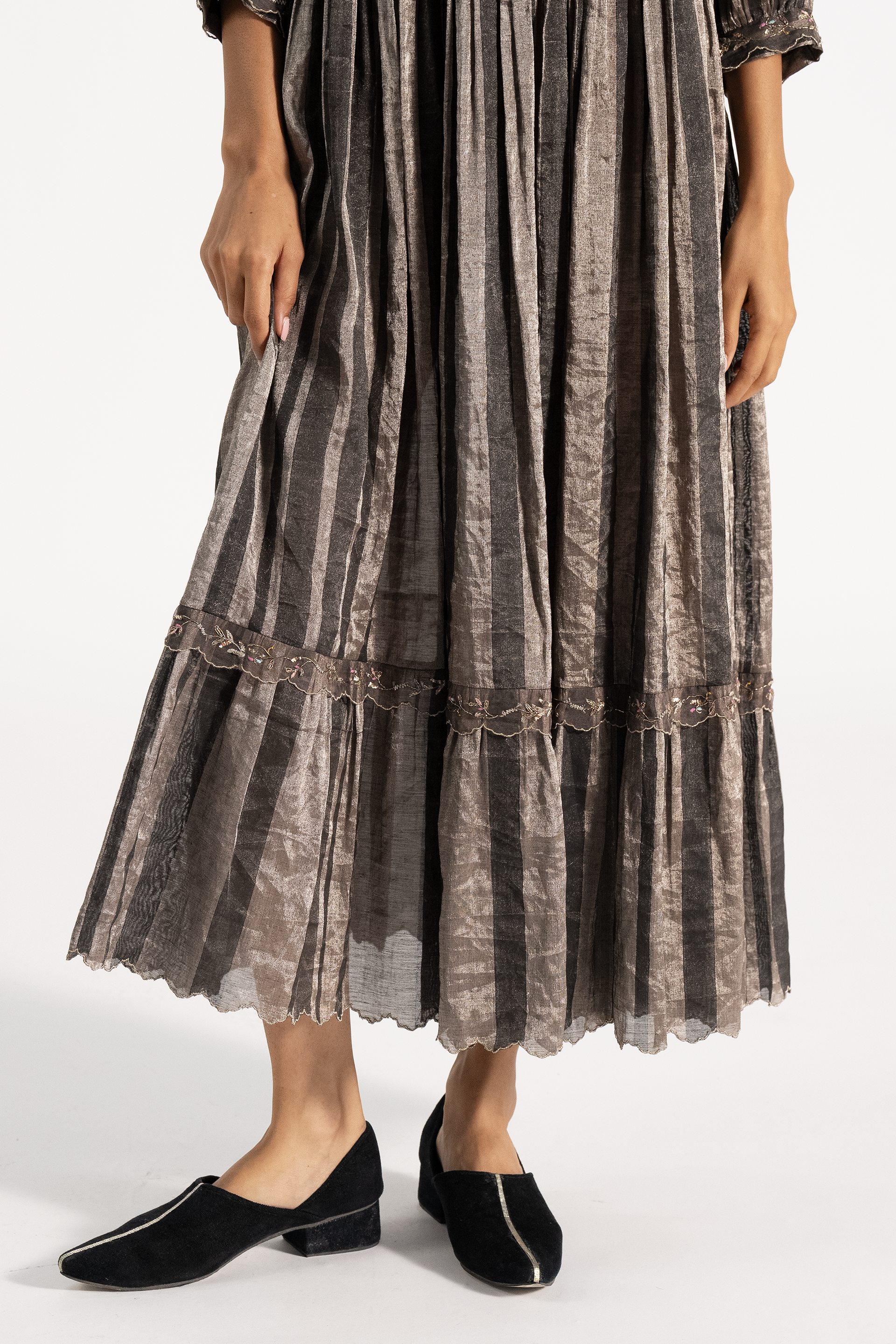 Tiered Dress With Pintucks At Yoke Along With Scalloped Organza Trim Detail And Hand Embroidered Borders. Comes With A Separate Cotton Silk Lining.